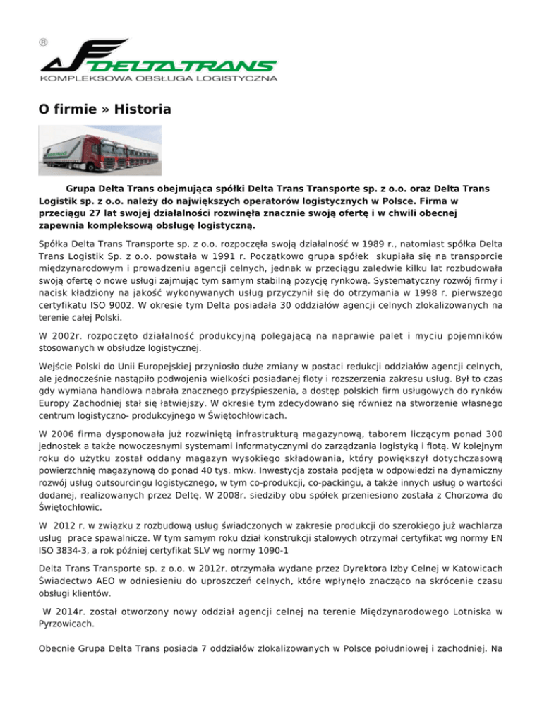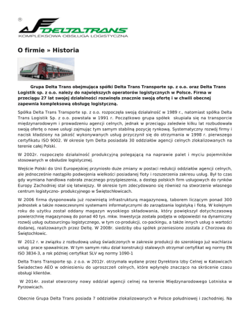 O firmie » Historia Grupa Delta Trans obejmująca spółki Delta Trans Transporte sp. z o.o. oraz Delta Trans Logistik sp. z o.o. należy do największych operatorów logistycznych w Polsce. Firma w przeciągu 27 lat swojej działalności rozwinęła znacznie swoją ofertę i w chwili obecnej zapewnia kompleksową obsługę logistyczną. Spółka Delta Trans Transporte sp. z o.o. rozpoczęła swoją działalność w 1989 r., natomiast spółka Delta Trans Logistik Sp. z o.o. powstała w 1991 r. Początkowo grupa spółek skupiała się na transporcie międzynarodowym i prowadzeniu agencji celnych, jednak w przeciągu zaledwie kilku lat rozbudowała swoją ofertę o nowe usługi zajmując tym samym stabilną pozycję rynkową. Systematyczny rozwój firmy i nacisk kładziony na jakość wykonywanych usług przyczynił się do otrzymania w 1998 r. pierwszego certyfikatu ISO 9002. W okresie tym Delta posiadała 30 oddziałów agencji celnych zlokalizowanych na terenie całej Polski. W 2002r. rozpoczęto działalność produkcyjną polegającą na naprawie palet i myciu pojemników stosowanych w obsłudze logistycznej. Wejście Polski do Unii Europejskiej przyniosło duże zmiany w postaci redukcji oddziałów agencji celnych, ale jednocześnie nastąpiło podwojenia wielkości posiadanej floty i rozszerzenia zakresu usług. Był to czas gdy wymiana handlowa nabrała znacznego przyśpieszenia, a dostęp polskich firm usługowych do rynków Europy Zachodniej stał się łatwiejszy. W okresie tym zdecydowano się również na stworzenie własnego centrum logistyczno- produkcyjnego w Świętochłowicach. W 2006 firma dysponowała już rozwiniętą infrastrukturą magazynową, taborem liczącym ponad 300 jednostek a także nowoczesnymi systemami informatycznymi do zarządzania logistyką i flotą. W kolejnym roku do użytku został oddany magazyn wysokiego składowania, który powiększył dotychczasową powierzchnię magazynową do ponad 40 tys. mkw. Inwestycja została podjęta w odpowiedzi na dynamiczny rozwój usług outsourcingu logistycznego, w tym co-produkcji, co-packingu, a także innych usług o wartości dodanej, realizowanych przez Deltę. W 2008r. siedziby obu spółek przeniesiono została z Chorzowa do Świętochłowic. W 2012 r. w związku z rozbudową usług świadczonych w zakresie produkcji do szerokiego już wachlarza usług prace spawalnicze. W tym samym roku dział konstrukcji stalowych otrzymał certyfikat wg normy EN ISO 3834-3, a rok później certyfikat SLV wg normy 1090-1 Delta Trans Transporte sp. z o.o. w 2012r. otrzymała wydane przez Dyrektora Izby Celnej w Katowicach Świadectwo AEO w odniesieniu do uproszczeń celnych, które wpłynęło znacząco na skrócenie czasu obsługi klientów. W 2014r. został otworzony nowy oddział agencji celnej na terenie Międzynarodowego Lotniska w Pyrzowicach. Obecnie Grupa Delta Trans posiada 7 oddziałów zlokalizowanych w Polsce południowej i zachodniej. Na terenie centrum logistycznego w Świętochłowicach dysponuje blisko 80 tysiącami m2 nowoczesnych powierzchni magazynowych i hal produkcyjnych. Flota firmy liczy niemalże 400 własnych jednostek w tym jednostki specjalistyczne - innenladery oraz silosy. Grupa w swoim portfolio posiada największe koncerny międzynarodowe branży motoryzacyjnej oraz huty szkła. Firma znajduje się w czołówce operatorów logistycznych w Polsce i jest jedną z nielicznych firm, która w oparciu o swoje zaplecze techniczne i intelektualne zapewnia usługi ściśle dopasowane do potrzeb klienta zgodnie z modelem one stop shopping. ❍ ❍ ❍ ❍ ❍ ❍ ❍ ❍ ❍ ❍ ❍ ❍ ❍ ❍ 1989 – Założenie spółki Delta Trans Transporte sp. z o.o. 1991 – Założenie spółki Delta Trans Logistik sp. z o.o. 1998 – Wdrożenie Systemu Jakości o standardzie ISO 9002:1994 1998 – Firma posiada 30 agencji celnych 2001 – Recertyfikacja Systemu Zarządzania Jakością i wprowadzenie nowego standardu ISO 9001:2000. 2002 – Otrzymanie tytułu „Przedsiębiorstwa Fair Play 2002”. 2004 – Otrzymanie brązowego godła w programie badawczym „Operator Logistyczny Roku 2004” 2005 – Wprowadzenie Systemu Oceny Jakości, Bezpieczeństwa i Działalności SQAS i otrzymanie certyfikatu Systemu Zarządzania Środowiskowego ISO 14001 2006 - Utworzenie oddziału Delta Trans Venlo B.V. w Holandii. 2007 Oddanie Centrum Logistycznego Delta Trans w Świętochłowicach. Delta Trans znalazła się w dziesiątce najlepszych firm działających na Polskim rynku usług logistycznych według badania Operator Logistyczny Roku 2008 Przeniesienie siedziby spółek z Chorzowa do Świętochłowic 2009 Otwarcie nowego biura w Szczawnie Zdroju. 2012 Włączenie prac spawalniczych do oferty firmy i uzyskanie certyfikatów GSI SLV Halle i ISO 3834-3. Delta Trans Transporte otrzymała Świadectwo AEO w odniesieniu do uproszczeń celnych 2014 Otwarcie nowego oddziału agencji celnej na terenie Międzynarodowego Lotniska w Pyrzowicach Grupa Delta Trans Delta Trans Logistik Sp. zo.o. Siedziba: Świętochłowice 41-605, ul.Chorzowska 118 - 120 Delta Trans Transporte Sp. z o.o. Siedziba: Świętochłowice 41-605, ul. Chorzowska 134 B Galeria