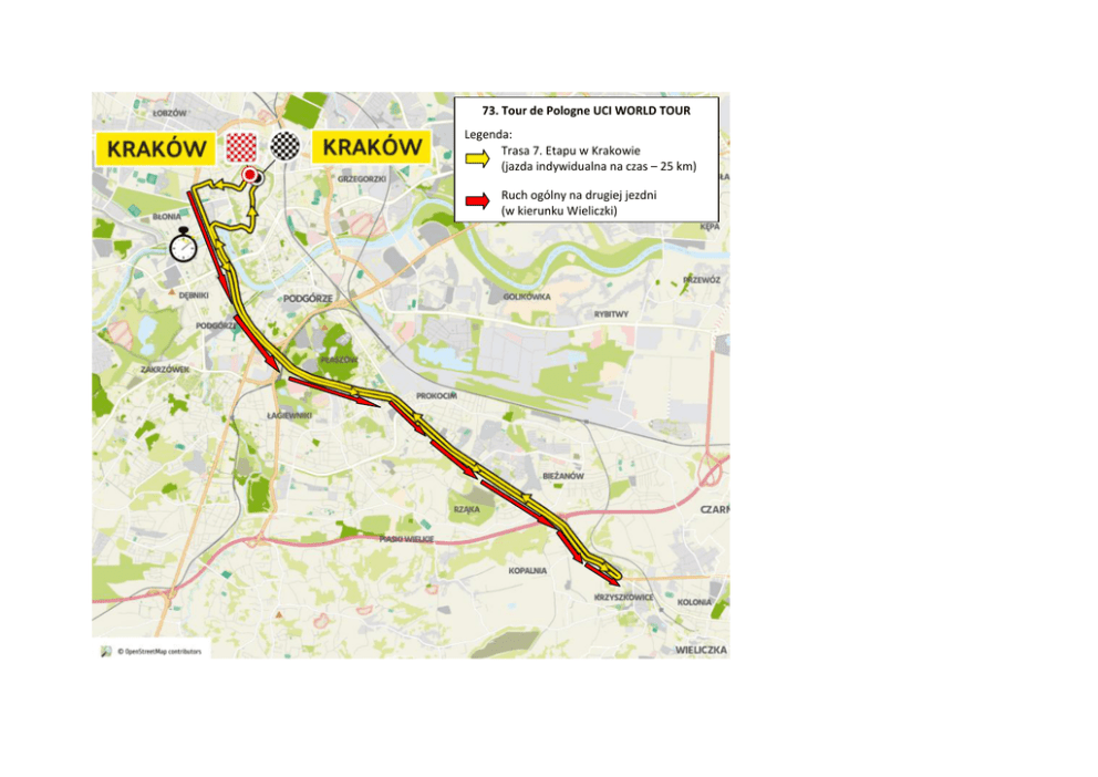 73. Tour de Pologne UCI WORLD TOUR Legenda: Trasa 7. Etapu w Krakowie (jazda indywidualna na czas – 25 km) Ruch ogólny na drugiej jezdni (w kierunku Wieliczki)