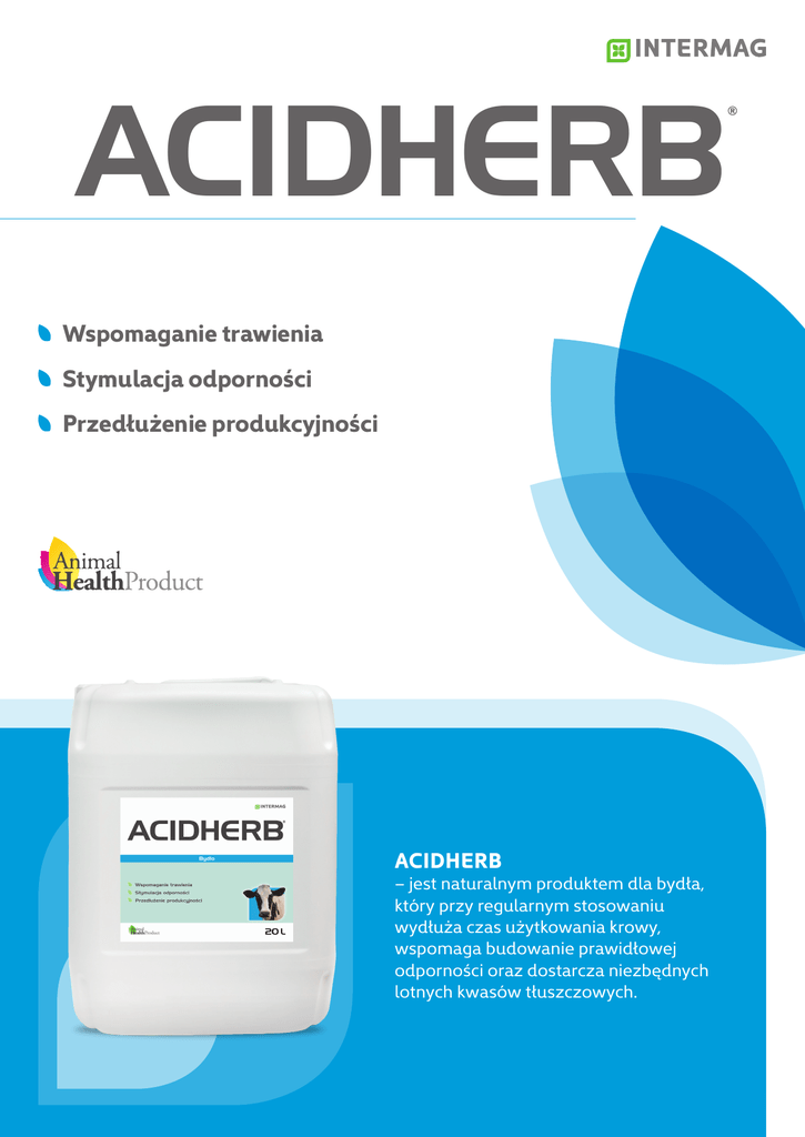 ACIDHERB xx Wspomaganie trawienia xx Stymulacja odporności xx Przedłużenie produkcyjności ACIDHERB – jest naturalnym produktem dla bydła, który przy regularnym stosowaniu wydłuża czas użytkowania krowy, wspomaga budowanie prawidłowej odporności oraz dostarcza niezbędnych lotnych kwasów tłuszczowych. PRZEZNACZENIE WSKAZANIA ACIDHERB® stosuje się u krów w przypadkach gorszego pobrania paszy oraz niskich parametrów produkcyjnych. xx xx xx xx słaby apetyt niska odporność długotrwałe choroby stada wysoki poziom komórek somatycznych SKŁAD WŁAŚCIWOŚCI Materiały paszowe (w 1 kg produktu): Chlorek sodu (11.4.1.), Ksyloza (13.2.6) Dodatki paszowe (w 1 kg produktu): Dodatki sensoryczne: ekstrakt alkoholowy Echinacea purpurea oleorezyna Thymus vulgaris oleorezyna Salvia officinalis ekstrakt olejowy Rosmarinus officinalis 20 000 mg 3000 mg 1700 mg 1400 mg Dodatki technologiczne: Kategoria 1a (Konserwanty): kwas mrówkowy (E 236) 3060 mg kwas octowy (E 260) 2730 mg kwas mlekowy (E 270) 1590 mg przeciwutleniacz: etoksyquina (E324) 100 mg emulgator: rycynolan gliceryno-polietylenoglikolu (E484) 30 g STOSOWANIE Preparat należy wymieszać z wodą i podawać z wozu paszowego: xx w czasie laktacji: - 80 ml/szt./dzień; xx w okresie okołowycieleniowym – 100 ml/szt./dzień. ACIDHERB® stosowany regularnie w paszy, poprawia odporność swoistą organizmu czego efektem jest spadek komórek somatycznych w mleku. Dodatkowo generuje oszczędności na paszach treściwych przy jednoczesnym utrzymaniu wydajności a także wydłuża okres użytkowania krowy. Zawarte w preparacie lotne kwasy tłuszczowe (mrówkowy, octowy, mlekowy) pobudzają krowę do lepszego wykorzystania składników z paszy, wspomagają trawienie oraz stymulują odporność i działają antybakteryjnie. Obecność wysoko skoncentrowanych ekstraktów w postaci oleorezyny tymianku i szałwii oraz wyciągów z jeżówki i rozmarynu wspomagają trawienie poprzez wzmożone wydzielanie soku żołądkowego i żółci. Olejki eteryczne a także tymol i karwakrolu zawarte w użytych ziołach wspomagają odporność, działają antyseptycznie, przyśpieszają procesy regeneracyjne oraz pobudzają laktacje. Dodatek ksylozy poprawia smakowitość paszy a sód odpowiada za system buforujący, neutralizujący nadmierne zakwaszenie organizmu. Zastosowanie ACIDHERB w okresie okołoporodowym zapobiega niedoborom energii i w konsekwencji występowaniu chorób metabolicznych takich jak np. ketoza . KORZYŚCI xx xx xx xx xx wspomaganie trawienia stymulacja odporności przedłużenie produkcyjności obniżenie liczby komórek somatycznych w mleku wzrost produkcji mleka PRODUCENT: INTERMAG sp. z o.o. Al. 1000-lecia 15 G, 32-300 Olkusz Tel. +48 32 64 55 900; Fax. +48 32 64 27 044 www.intermag.pl 03.2016