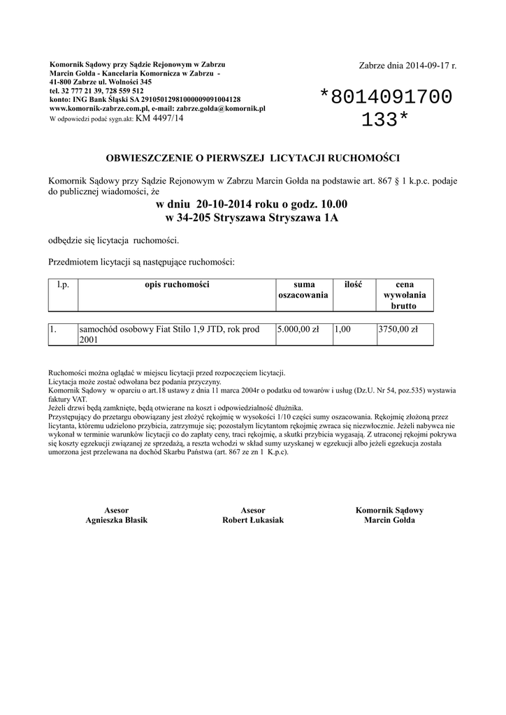 Komornik Sądowy przy Sądzie Rejonowym w Zabrzu Marcin Gołda - Kancelaria Komornicza w Zabrzu 41-800 Zabrze ul. Wolności 345 tel. 32 777 21 39, 728 559 512 konto: ING Bank Śląski SA 29105012981000009091004128 www.komornik-zabrze.com.pl, e-mail: [email protected] W odpowiedzi podać sygn.akt: KM Zabrze dnia 2014-09-17 r. *8014091700 133* 4497/14 OBWIESZCZENIE O PIERWSZEJ LICYTACJI RUCHOMOŚCI Komornik Sądowy przy Sądzie Rejonowym w Zabrzu Marcin Gołda na podstawie art. 867 § 1 k.p.c. podaje do publicznej wiadomości, że w dniu 20-10-2014 roku o godz. 10.00 w 34-205 Stryszawa Stryszawa 1A odbędzie się licytacja ruchomości. Przedmiotem licytacji są następujące ruchomości: l.p. 1. opis ruchomości suma oszacowania samochód osobowy Fiat Stilo 1,9 JTD, rok prod 2001 5.000,00 zł ilość 1,00 cena wywołania brutto 3750,00 zł Ruchomości można oglądać w miejscu licytacji przed rozpoczęciem licytacji. Licytacja może zostać odwołana bez podania przyczyny. Komornik Sądowy w oparciu o art.18 ustawy z dnia 11 marca 2004r o podatku od towarów i usług (Dz.U. Nr 54, poz.535) wystawia faktury VAT. Jeżeli drzwi będą zamknięte, będą otwierane na koszt i odpowiedzialność dłużnika. Przystępujący do przetargu obowiązany jest złożyć rękojmię w wysokości 1/10 części sumy oszacowania. Rękojmię złożoną przez licytanta, któremu udzielono przybicia, zatrzymuje się; pozostałym licytantom rękojmię zwraca się niezwłocznie. Jeżeli nabywca nie wykonał w terminie warunków licytacji co do zapłaty ceny, traci rękojmię, a skutki przybicia wygasają. Z utraconej rękojmi pokrywa się koszty egzekucji związanej ze sprzedażą, a reszta wchodzi w skład sumy uzyskanej w egzekucji albo jeżeli egzekucja została umorzona jest przelewana na dochód Skarbu Państwa (art. 867 ze zn 1 K.p.c). Asesor Agnieszka Błasik Asesor Robert Łukasiak Komornik Sądowy Marcin Gołda
