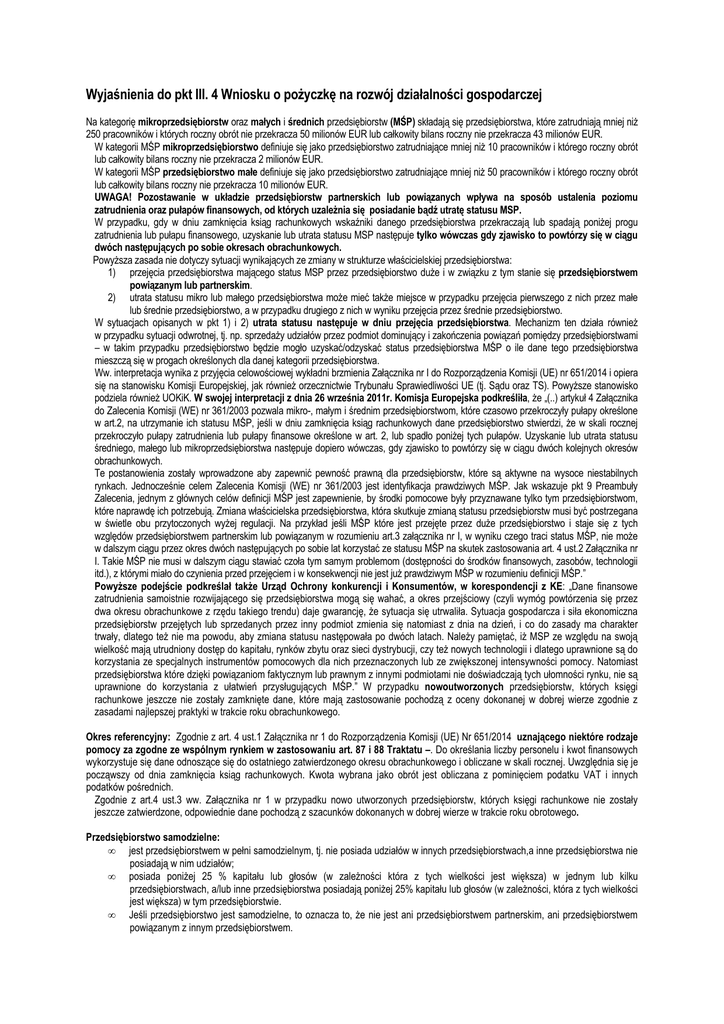 Wyjaśnienia do pkt III. 4 Wniosku o pożyczkę na rozwój działalności gospodarczej Na kategorię mikroprzedsiębiorstw oraz małych i średnich przedsiębiorstw (MŚP) składają się przedsiębiorstwa, które zatrudniają mniej niż 250 pracowników i których roczny obrót nie przekracza 50 milionów EUR lub całkowity bilans roczny nie przekracza 43 milionów EUR. W kategorii MŚP mikroprzedsiębiorstwo definiuje się jako przedsiębiorstwo zatrudniające mniej niż 10 pracowników i którego roczny obrót lub całkowity bilans roczny nie przekracza 2 milionów EUR. W kategorii MŚP przedsiębiorstwo małe definiuje się jako przedsiębiorstwo zatrudniające mniej niż 50 pracowników i którego roczny obrót lub całkowity bilans roczny nie przekracza 10 milionów EUR. UWAGA! Pozostawanie w układzie przedsiębiorstw partnerskich lub powiązanych wpływa na sposób ustalenia poziomu zatrudnienia oraz pułapów finansowych, od których uzależnia się posiadanie bądź utratę statusu MSP. W przypadku, gdy w dniu zamknięcia ksiąg rachunkowych wskaźniki danego przedsiębiorstwa przekraczają lub spadają poniżej progu zatrudnienia lub pułapu finansowego, uzyskanie lub utrata statusu MSP następuje tylko wówczas gdy zjawisko to powtórzy się w ciągu dwóch następujących po sobie okresach obrachunkowych. Powyższa zasada nie dotyczy sytuacji wynikających ze zmiany w strukturze właścicielskiej przedsiębiorstwa: 1) przejęcia przedsiębiorstwa mającego status MSP przez przedsiębiorstwo duże i w związku z tym stanie się przedsiębiorstwem powiązanym lub partnerskim. 2) utrata statusu mikro lub małego przedsiębiorstwa może mieć także miejsce w przypadku przejęcia pierwszego z nich przez małe lub średnie przedsiębiorstwo, a w przypadku drugiego z nich w wyniku przejęcia przez średnie przedsiębiorstwo. W sytuacjach opisanych w pkt 1) i 2) utrata statusu następuje w dniu przejęcia przedsiębiorstwa. Mechanizm ten działa również w przypadku sytuacji odwrotnej, tj. np. sprzedaży udziałów przez podmiot dominujący i zakończenia powiązań pomiędzy przedsiębiorstwami – w takim przypadku przedsiębiorstwo będzie mogło uzyskać/odzyskać status przedsiębiorstwa MŚP o ile dane tego przedsiębiorstwa mieszczą się w progach określonych dla danej kategorii przedsiębiorstwa. Ww. interpretacja wynika z przyjęcia celowościowej wykładni brzmienia Załącznika nr I do Rozporządzenia Komisji (UE) nr 651/2014 i opiera się na stanowisku Komisji Europejskiej, jak również orzecznictwie Trybunału Sprawiedliwości UE (tj. Sądu oraz TS). Powyższe stanowisko podziela również UOKiK. W swojej interpretacji z dnia 26 września 2011r. Komisja Europejska podkreśliła, że „(..) artykuł 4 Załącznika do Zalecenia Komisji (WE) nr 361/2003 pozwala mikro-, małym i średnim przedsiębiorstwom, które czasowo przekroczyły pułapy określone w art.2, na utrzymanie ich statusu MŚP, jeśli w dniu zamknięcia ksiąg rachunkowych dane przedsiębiorstwo stwierdzi, że w skali rocznej przekroczyło pułapy zatrudnienia lub pułapy finansowe określone w art. 2, lub spadło poniżej tych pułapów. Uzyskanie lub utrata statusu średniego, małego lub mikroprzedsiębiorstwa następuje dopiero wówczas, gdy zjawisko to powtórzy się w ciągu dwóch kolejnych okresów obrachunkowych. Te postanowienia zostały wprowadzone aby zapewnić pewność prawną dla przedsiębiorstw, które są aktywne na wysoce niestabilnych rynkach. Jednocześnie celem Zalecenia Komisji (WE) nr 361/2003 jest identyfikacja prawdziwych MŚP. Jak wskazuje pkt 9 Preambuły Zalecenia, jednym z głównych celów definicji MŚP jest zapewnienie, by środki pomocowe były przyznawane tylko tym przedsiębiorstwom, które naprawdę ich potrzebują. Zmiana właścicielska przedsiębiorstwa, która skutkuje zmianą statusu przedsiębiorstw musi być postrzegana w świetle obu przytoczonych wyżej regulacji. Na przykład jeśli MŚP które jest przejęte przez duże przedsiębiorstwo i staje się z tych względów przedsiębiorstwem partnerskim lub powiązanym w rozumieniu art.3 załącznika nr I, w wyniku czego traci status MŚP, nie może w dalszym ciągu przez okres dwóch następujących po sobie lat korzystać ze statusu MŚP na skutek zastosowania art. 4 ust.2 Załącznika nr I. Takie MŚP nie musi w dalszym ciągu stawiać czoła tym samym problemom (dostępności do środków finansowych, zasobów, technologii itd.), z którymi miało do czynienia przed przejęciem i w konsekwencji nie jest już prawdziwym MŚP w rozumieniu definicji MŚP.” Powyższe podejście podkreślał także Urząd Ochrony konkurencji i Konsumentów, w korespondencji z KE: „Dane finansowe zatrudnienia samoistnie rozwijającego się przedsiębiorstwa mogą się wahać, a okres przejściowy (czyli wymóg powtórzenia się przez dwa okresu obrachunkowe z rzędu takiego trendu) daje gwarancję, że sytuacja się utrwaliła. Sytuacja gospodarcza i siła ekonomiczna przedsiębiorstw przejętych lub sprzedanych przez inny podmiot zmienia się natomiast z dnia na dzień, i co do zasady ma charakter trwały, dlatego też nie ma powodu, aby zmiana statusu następowała po dwóch latach. Należy pamiętać, iż MSP ze względu na swoją wielkość mają utrudniony dostęp do kapitału, rynków zbytu oraz sieci dystrybucji, czy też nowych technologii i dlatego uprawnione są do korzystania ze specjalnych instrumentów pomocowych dla nich przeznaczonych lub ze zwiększonej intensywności pomocy. Natomiast przedsiębiorstwa które dzięki powiązaniom faktycznym lub prawnym z innymi podmiotami nie doświadczają tych ułomności rynku, nie są uprawnione do korzystania z ułatwień przysługujących MŚP.” W przypadku nowoutworzonych przedsiębiorstw, których księgi rachunkowe jeszcze nie zostały zamknięte dane, które mają zastosowanie pochodzą z oceny dokonanej w dobrej wierze zgodnie z zasadami najlepszej praktyki w t