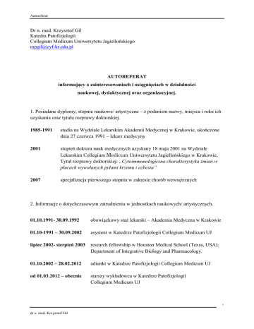Autoreferat Dr n. med. Krzysztof Gil Katedra Patofizjologii Collegium Medicum Uniwersytetu Jagiellońskiego [email protected] AUTOREFERAT informujący o zainteresowaniach i osiągnięciach w działalności naukowej, dydaktycznej oraz organizacyjnej. 1. Posiadane dyplomy, stopnie naukowe/ artystyczne – z podaniem nazwy, miejsca i roku ich uzyskania oraz tytułu rozprawy doktorskiej. 1985-1991 studia na Wydziale Lekarskim Akademii Medycznej w Krakowie, ukończone dnia 27 czerwca 1991 – lekarz medycyny 2001 stopień doktora nauk medycznych uzyskany 18 maja 2001 na Wydziale Lekarskim Collegium Medicum Uniwersytetu Jagiellońskiego w Krakowie, Tytuł rozprawy doktorskiej: „Cytoimmunologiczna charakterystyka zmian w płucach wywołanych pyłami krzemu i azbestu” 2007 specjalizacja pierwszego stopnia w zakresie chorób wewnętrznych 2. Informacje o dotychczasowym zatrudnieniu w jednostkach naukowych/ artystycznych. 01.10.1991- 30.09.1992 obowiązkowy staż lekarski – Akademia Medyczna w Krakowie 01.10-1991 – 30.09.2002 asystent w Katedrze Patofizjologii Collegium Medicum UJ lipiec 2002- sierpień 2003 research fellowship w Houston Medical School (Texas, USA); Department of Integrative Biology and Pharmacology. 01.10.2002 – 28.02.2012 adiunkt w Katedrze Patofizjologii Collegium Medicum UJ od 01.03.2012 – obecnie starszy wykładowca w Katedrze Patofizjologii Collegium Medicum UJ 1 dr n. med. Krzysztof Gil Autoreferat 3. Wskazanie osiągnięcia* wynikającego z art. 16 ust. 2 ustawy z dnia 14 marca 2003 r. o stopniach naukowych i tytule naukowym oraz o stopniach i tytule w zakresie sztuki (Dz. U. nr 65, poz. 595 ze zm.): „Zastosowanie obwodowej stymulacji nerwu błędnego w regulacji przyjmowania pokarmu” w oparciu o jednotematyczny cykl publikacji. 1. Bugajski AJ, Gil K, Ziomber A, Zurowski D, Zaraska W, Thor PJ.: Effect of long-term vagal stimulation on food intake and body weight during diet induced obesity in rats. J Physiol Pharmacol. 2007;58 Suppl 1:5-12. IF: 4.466 2. Gil K, Bugajski A, Kurnik M, Zaraska W, Thor P: Physiological and morphological effects of long-term vagal stimulation in diet induced obesity in rats. J Physiol Pharmacol. 2009, 60, Suppl 3, 61-66. IF=1.489 3. Gil Krzysztof, Bugajski Andrzej, Skowron Beata, Thor Piotr: Increased c-Fos expression in nodose ganglion in rats with electrical vagus nerve stimulation. Folia Medica Cracoviensia 2011, 51, 1-4: 45-58. MNiSW: 4 4. Gil K, Bugajski A, Thor P: Electrical vagus nerve stimulation decreases food consumption and weight gain in rats fed high-fat diet. J Physiol Pharmacol. 2011, 62; 637-646. IF=2.267 5. Gil K, Bugajski A, Kurnik M, Thor P: Chronic vagus nerve stimulation reduces body fat, blood cholesterol and triglyceride levels in rats fed a high-fat diet. Folia Medica Cracoviensia 2012, LII (52), 3-4: 79-96. MNiSW: 4 6. Gil K, Bugajski A, Kurnik M, Thor P: Electrical chronic vagus nerve stimulation activates the hypothalamic-pituitary-adrenal axis in rats fed high-fat diet. Neuroendocrinol Lett 2013; 34(4):101–108. IF= 1.296 Łączny impact factor w/w prac: 9.518 pkt. Omówienie celu naukowego ww. prac i osiągniętych wyników wraz z omówieniem ich ewentualnego wykorzystania. Nerw błędny (Nervus Vagus, nerw X), najdłuższy nerw czaszkowy, stanowi główną strukturę anatomiczną parasympatycznego układu nerwowego, unerwiając liczne narządy szyi, klatki piersiowej i jamy brzusznej. Prawy i lewy nerw błędny po wyjściu z pnia mózgu przechodzą przez otwory szyjne, następnie zmierzają w okolice szyi współtworząc zwoje guzowate (ganglion nodosum), i dalej biegnąc wzdłuż przełyku wchodzą do jamy brzusznej jako dwa pnie (grzbietowy – prawy, brzuszny – lewy). W odcinku podprzeponowym przełyku pnie te dzielą się na kilka gałęzi, unerwiając żołądek, dwunastnicę, jelito cienkie oraz okrężnicę proksymalną aż do zstępującej. Gałąź wątrobowa wspólna nerwu błędnego unerwia wątrobę i trzustkę, a ponadto reguluje perystaltykę pęcherzyka żółciowego i dróg żółciowych. 2 dr n. med. Krzysztof Gil Autoreferat Pnie nerwu błędnego unerwiające trzewia składają się głównie z niezmielinizowanych włókien, których ponad 80% ma charakter włókien aferentnych (dośrodkowych), podczas gdy włókna eferentne (odśrodkowe) stanowią pozostałe 20%. Włókna aferentne przewodzą do mózgu informacje z narządów szyi, klatki piersiowej i jamy brzusznej, regulując między innymi przyjmowanie pokarmu oraz odruchy trawienne. Neurony aferentne nerwu błędnego znajdują się w zwojach guzowatych, zbierając, a następnie przenosząc informacje czuciowe do jądra pasma samotnego (nucleus tractus solitarius - NTS); stamtąd sygnały przekazywane są do dalszych ośrodków nerwowych, między innymi do podwzgórza. Włókna eferentne nerwu błędnego wychodzą z neuronów leżących w pniu mózgu (dorsal motor nucleus – DMX oraz nucleus ambiguus), kontrolujących funkcje autonomiczne. NTS wraz z dorsal motor nucleus oraz area postrema tworzą tzw. dorsal vagal complex, który pełni rolę głównego centrum integracyjnego autonomicznego układu nerwowego. Nerw błędny reguluje częstość akcji serca, ciśnienie krwi, a także motorykę i wydzielanie przewodu pokarmowego. Prawy nerw błędny unerwia węzeł zatokoprzedsionkowy (odpowiedzialny za funkcję rozrusznikową serca), podczas gdy lewy nerw błędny zaopatruje węzeł przedsionkowo – komorowy (wpływając na siłę skurczu mięśnia sercowego, ale ma mniejszy wpływ na częstość skurczów). Stymulacja nerwu błędnego (vagus nerve stimulation - VNS) prawego powoduje znaczne zwolnienie akcji serca, podczas gdy stymulacja lewego nerwu błędnego nie wywiera znaczącego wpływu na częstość skurczów serca. Dlatego zarówno w warunkach eksperymentalnych, jak również w celach terapeutycznych VNS przeprowadza się na lewym nerwie błędnym. Możliwości wpływania na ośrodki układu nerwowego za pośrednict