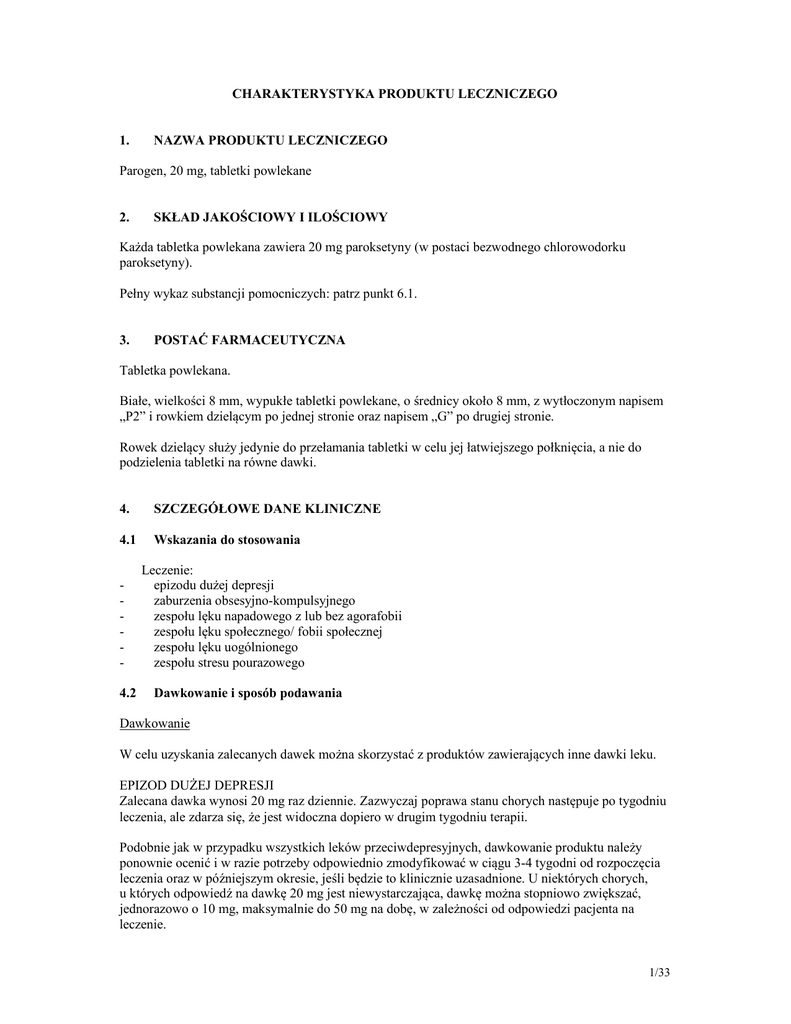 CHARAKTERYSTYKA PRODUKTU LECZNICZEGO 1. NAZWA PRODUKTU LECZNICZEGO Parogen, 20 mg, tabletki powlekane 2. SKŁAD JAKOŚCIOWY I ILOŚCIOWY Każda tabletka powlekana zawiera 20 mg paroksetyny (w postaci bezwodnego chlorowodorku paroksetyny). Pełny wykaz substancji pomocniczych: patrz punkt 6.1. 3. POSTAĆ FARMACEUTYCZNA Tabletka powlekana. Białe, wielkości 8 mm, wypukłe tabletki powlekane, o średnicy około 8 mm, z wytłoczonym napisem „P2” i rowkiem dzielącym po jednej stronie oraz napisem „G” po drugiej stronie. Rowek dzielący służy jedynie do przełamania tabletki w celu jej łatwiejszego połknięcia, a nie do podzielenia tabletki na równe dawki. 4. SZCZEGÓŁOWE DANE KLINICZNE 4.1 Wskazania do stosowania 4.2 Leczenie: epizodu dużej depresji zaburzenia obsesyjno-kompulsyjnego zespołu lęku napadowego z lub bez agorafobii zespołu lęku społecznego/ fobii społecznej zespołu lęku uogólnionego zespołu stresu pourazowego Dawkowanie i sposób podawania Dawkowanie W celu uzyskania zalecanych dawek można skorzystać z produktów zawierających inne dawki leku. EPIZOD DUŻEJ DEPRESJI Zalecana dawka wynosi 20 mg raz dziennie. Zazwyczaj poprawa stanu chorych następuje po tygodniu leczenia, ale zdarza się, że jest widoczna dopiero w drugim tygodniu terapii. Podobnie jak w przypadku wszystkich leków przeciwdepresyjnych, dawkowanie produktu należy ponownie ocenić i w razie potrzeby odpowiednio zmodyfikować w ciągu 3-4 tygodni od rozpoczęcia leczenia oraz w późniejszym okresie, jeśli będzie to klinicznie uzasadnione. U niektórych chorych, u których odpowiedź na dawkę 20 mg jest niewystarczająca, dawkę można stopniowo zwiększać, jednorazowo o 10 mg, maksymalnie do 50 mg na dobę, w zależności od odpowiedzi pacjenta na leczenie. 1/33 Pacjenci z depresją powinni być leczeni dostatecznie długo, (co najmniej przez 6 miesięcy), aby zapewnić ustąpienie objawów. ZABURZENIE OBSESYJNO-KOMPULSYJNE Zalecana dawka wynosi 40 mg dziennie. Pacjenci powinni zaczynać leczenie od dawki 20 mg na dobę. Dawkę tę można stopniowo zwiększać, jednorazowo o 10 mg, aż do uzyskania dawki zalecanej. Jeśli po kilku tygodniach stosowania zalecanej dawki odpowiedź na leczenie jest nadal niezadowalająca, niektórzy pacjenci mogą odnieść korzyść z dalszego stopniowego zwiększenia dawki, maksymalnie do 60 mg dziennie. Chorzy z zaburzeniami obsesyjno-kompulsyjnymi powinni być leczeni dostatecznie długo, aby mieć pewność, że objawy ustąpiły. Leczenie może trwać kilka miesięcy lub nawet dłużej (patrz punkt 5.1.). ZESPÓŁ LĘKU NAPADOWEGO Zalecana dawka dobowa wynosi 40 mg. Pacjenci powinni rozpoczynać leczenie od 10 mg dziennie. W zależności od odpowiedzi pacjenta na leczenie dawkę tę należy stopniowo zwiększać, jednorazowo o 10 mg, aż do osiągnięcia zalecanej dawki dobowej. Zaleca się rozpoczynanie leczenia od małej dawki, aby zminimalizować ryzyko nasilenia objawów lękowych, co - jak wiadomo - może wystąpić w pierwszym okresie leczenia tej choroby. Jeśli po kilku tygodniach stosowania zalecanej dawki odpowiedź na leczenie jest nadal niezadowalająca, niektórzy pacjenci mogą odnieść korzyść z dalszego stopniowego zwiększenia dawki, maksymalnie do 60 mg dziennie. Chorzy z zespołem lęku napadowego powinni być leczeni dostatecznie długo, aby mieć pewność, że objawy ustąpiły.. Leczenie może trwać kilka miesięcy lub nawet dłużej (patrz punkt 5.1). ZESPÓŁ LĘKU SPOŁECZNEGO/ FOBIA SPOŁECZNA Zalecana dawka dobowa wynosi 20 mg. Jeśli po kilku tygodniach stosowania zalecanej dawki odpowiedź na leczenie jest nadal niezadowalająca, niektórzy pacjenci mogą odnieść korzyść z dalszego stopniowego zwiększania dawki, jednorazowo o 10 mg, maksymalnie do 50 mg dziennie. Leczenie długoterminowe należy regularnie oceniać (patrz punkt 5.1.). ZESPÓŁ LĘKU UOGÓLNIONEGO Zalecana dawka wynosi 20 mg dziennie. Jeśli po kilku tygodniach stosowania zalecanej dawki odpowiedź na leczenie jest nadal niezadowalająca, niektórzy pacjenci mogą odnieść korzyść z dalszego stopniowego zwiększania dawki, jednorazowo o 10 mg, maksymalnie do 50 mg dziennie. Leczenie długoterminowe należy regularnie oceniać (patrz punkt 5.1.). ZESPÓŁ STRESU POURAZOWEGO Zalecana dawka wynosi 20 mg dziennie. Jeśli po kilku tygodniach stosowania zalecanej dawki odpowiedź na leczenie jest nadal niezadowalająca, niektórzy pacjenci mogą odnieść korzyść z dalszego stopniowego zwiększania dawki, jednorazowo o 10 mg, maksymalnie do 50 mg dziennie. Leczenie długoterminowe należy regularnie oceniać (patrz punkt 5.1.). INFORMACJE OGÓLNE OBJAWY ODSTAWIENIA OBSERWOWANE PO ZAKOŃCZENIU LECZENIA PAROKSETYNĄ Należy unikać nagłego odstawiania produktu (patrz punkty 4.4. i 4.8.). Schemat stopniowego odstawiania produktu stosowany w badaniach klinicznych polegał na zmniejszaniu dawki dobowej o 10 mg w odstępach tygodniowych. Jeśli po zmniejszeniu dawki lub odstawieniu produktu wystąpią bardzo dokuczliwe objawy, można rozważyć powrót do wcześniej stosowanej dawki. Po takim epizodzie lekarz może kontynuować zmniejszanie dawki, ale w wolniejszym tempie. 2/33 Szczególne grupy pacjentów: Pacjenci w podeszłym wieku U osób w podeszłym wieku obserwuje się zwiększone stężenia paroksetyny w osoczu, ale zakres stwierdzanych stężeń pokrywa się z wartościami obserwowanymi u osób młodszych. Dawka początkowa produktu powinna być taka sama, jak dawka początkowa u osób dorosłych. U niektórych pacjentów może być potrzebne zwiększenie dawki, jednak maksymalna dawka dobowa nie powinna przekraczać 40 mg. Dzieci i młodzież (od 7. do 17. roku życia) Paroksetyna nie powinna być stosowana u dzieci i młodzieży, gdyż kontrolowane badania kliniczne wykazały, że stosowanie paroksetyny wiązało się ze zwiększonym ryzykiem zachowań samobójczych i agresji. Poza tym w badaniach tych skuteczność produktu nie zosta