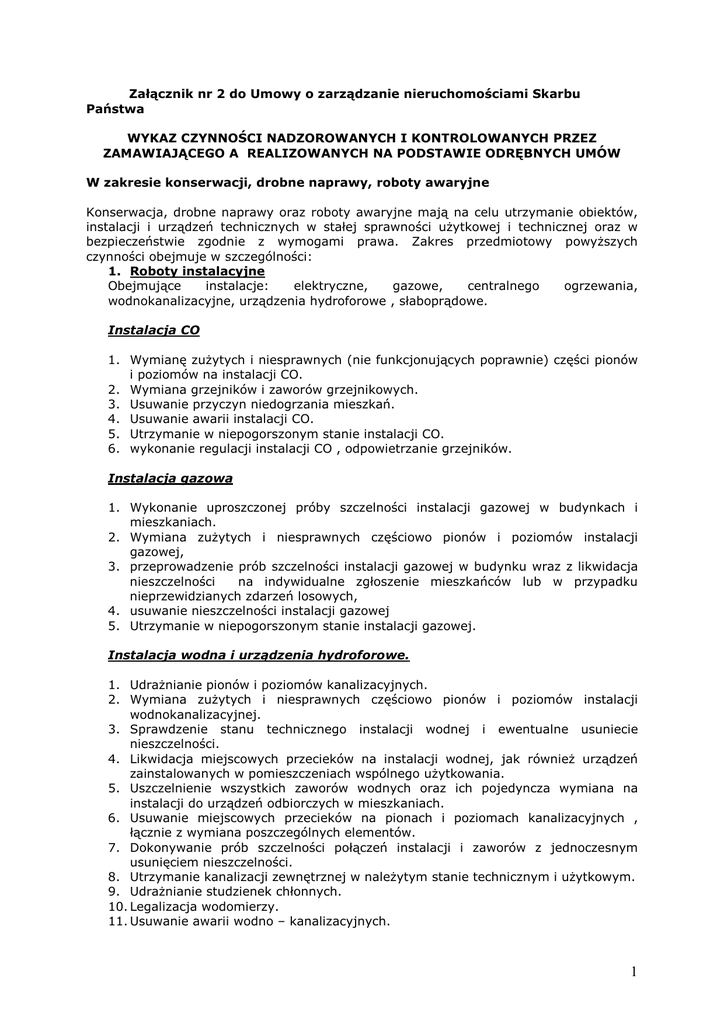 Załącznik nr 2 do Umowy o zarządzanie nieruchomościami Skarbu Państwa WYKAZ CZYNNOŚCI NADZOROWANYCH I KONTROLOWANYCH PRZEZ ZAMAWIAJĄCEGO A REALIZOWANYCH NA PODSTAWIE ODRĘBNYCH UMÓW W zakresie konserwacji, drobne naprawy, roboty awaryjne Konserwacja, drobne naprawy oraz roboty awaryjne mają na celu utrzymanie obiektów, instalacji i urządzeń technicznych w stałej sprawności uŜytkowej i technicznej oraz w bezpieczeństwie zgodnie z wymogami prawa. Zakres przedmiotowy powyŜszych czynności obejmuje w szczególności: 1. Roboty instalacyjne Obejmujące instalacje: elektryczne, gazowe, centralnego ogrzewania, wodnokanalizacyjne, urządzenia hydroforowe , słaboprądowe. Instalacja CO 1. Wymianę zuŜytych i niesprawnych (nie funkcjonujących poprawnie) części pionów i poziomów na instalacji CO. 2. Wymiana grzejników i zaworów grzejnikowych. 3. Usuwanie przyczyn niedogrzania mieszkań. 4. Usuwanie awarii instalacji CO. 5. Utrzymanie w niepogorszonym stanie instalacji CO. 6. wykonanie regulacji instalacji CO , odpowietrzanie grzejników. Instalacja gazowa 1. Wykonanie uproszczonej próby szczelności instalacji gazowej w budynkach i mieszkaniach. 2. Wymiana zuŜytych i niesprawnych częściowo pionów i poziomów instalacji gazowej, 3. przeprowadzenie prób szczelności instalacji gazowej w budynku wraz z likwidacja nieszczelności na indywidualne zgłoszenie mieszkańców lub w przypadku nieprzewidzianych zdarzeń losowych, 4. usuwanie nieszczelności instalacji gazowej 5. Utrzymanie w niepogorszonym stanie instalacji gazowej. Instalacja wodna i urządzenia hydroforowe. 1. UdraŜnianie pionów i poziomów kanalizacyjnych. 2. Wymiana zuŜytych i niesprawnych częściowo pionów i poziomów instalacji wodnokanalizacyjnej. 3. Sprawdzenie stanu technicznego instalacji wodnej i ewentualne usuniecie nieszczelności. 4. Likwidacja miejscowych przecieków na instalacji wodnej, jak równieŜ urządzeń zainstalowanych w pomieszczeniach wspólnego uŜytkowania. 5. Uszczelnienie wszystkich zaworów wodnych oraz ich pojedyncza wymiana na instalacji do urządzeń odbiorczych w mieszkaniach. 6. Usuwanie miejscowych przecieków na pionach i poziomach kanalizacyjnych , łącznie z wymiana poszczególnych elementów. 7. Dokonywanie prób szczelności połączeń instalacji i zaworów z jednoczesnym usunięciem nieszczelności. 8. Utrzymanie kanalizacji zewnętrznej w naleŜytym stanie technicznym i uŜytkowym. 9. UdraŜnianie studzienek chłonnych. 10. Legalizacja wodomierzy. 11. Usuwanie awarii wodno – kanalizacyjnych. 1 12. Utrzymanie w niepogorszonym stanie instalacji wodno – kanalizacyjnej. Instalacja elektryczna 1. Wymiana Ŝarówek i osprzętu we wspólnych częściach budynku 2. Naprawa lub wymiana numerków policyjnych. 3. Wymiana lub uzupełnienie Ŝarówek w lampach, kloszach na klatkach schodowych, piwnicach oraz lampach orientacyjnych, uzupełnienie brakujących kloszy. 4. Wymiana lub naprawa lamp, włączników, przycisków oświetleniowych w pomieszczeniach wspólnego uŜytkowania i na klatkach schodowych. 5. Wymiana bezpieczników i główek bezpiecznikowych w obwodzie administracyjnym danego budynku. 6. Wymiana gniazd bezpiecznikowych w obwodzie danego budynku. 7. Wymiana i uzupełnienie brakujących dekli w puszkach elektrycznych. 8. Wymiana upalonych końcówek w obwodzie administracyjnym danego budynku. 9. Wymian automatów na klatkach schodowych. 10. Wymiana zamków w tablicach oświetlenia administracyjnego. 11. Utrzymanie w niepogorszonym stanie instalacji elektrycznej. 12. Usuwanie awarii instalacji elektrycznej. Przewody kominowe: dymowe, spalinowe, wentylacyjne 1. Reperacja czap kominowych, uzupełnienie spoinowania zewnętrznego pod dachem, tynku i przemurowanie kominów ponad połacią dachową. 2. BieŜący nadzór kominiarski w zakresie konserwacji i czyszczenia przewodów kominowych , wykonywanie zaleceń kominiarskich w zakresie pojedynczych przełączeń przewodów, wymiany kratek wentylacyjnych oraz innych prac konserwacyjnych o niewielkim zakresie (bez remontów). 3. Wymian i uzupełnienie nasad kominowych w oparciu o opinię kominiarską. 2. Roboty budowlane 1. Wykonanie drobnych napraw w częściach wspólnych budynków (np. zamków, klamek, samozamykaczy) 2. Naprawa stolarki okiennej i drzwiowej oraz wymiana szyb w pomieszczeniach wspólnych budynku wraz z uzupełnieniem osprzętu. 3. Wymiana lub naprawa tynku oraz jego malowanie kolorem dobranym do koloru ścian. 4. Malowanie ścian. 5. Utrzymanie w naleŜytym stanie elementów konstrukcyjnych balkonów oraz elewacji. 6. Uzupełnienie tynku w elewacji i płycie balkonowej. 7. Zamurowanie otworów w stropach, uzupełnienie tynków po robotach instalacyjnych. 8. Białkowanie piwnic, suszarni, pralni i strychów. 9. Malowania i naprawa osłon śmietnikowych. 10. Zabezpieczenie pustostanów wykwaterowanych budynków oraz innych lokali. 11. Naprawa lub wymiana urządzeń zabawowych i trzepaków. 12. Wymian kuchni węglowych, pieców akumulacyjnych i pieców etaŜowych. 13. Wymian drzwi wejściowych do budynku, mieszkań oraz innych wspólnych pomieszczeń. 14. Miejscowa naprawa dachów, częściowa wymiana rynien , rur spustowych, opierzeń, udraŜnianie podejść do rur spustowych, uzupełnienie przykryw do czyszczaków oraz czyszczenie rynien dachowych. 15. Naprawa włazów i montowanie nasad kominowych. 16. Usuwanie uszkodzeń podłóg, posadzek, schodów w pomieszczeniach wspólnego uŜytkowania. 2 17. Zabezpieczenie budynku na okres zimowy. 18. Uzupełnienie tralek w balustradach schodowych oraz utrzymanie balustrad w dobrym stanie technicznym, zapewniającym bezpieczeństwo. 19. Naprawa i uzupełnienie ław kominiarskich, zabezpieczeń przeciwśniegowych i drabin strychowych. 20. Naprawa i uzupełnienie naświetli piwnicznych i krat piwnicznych. 3. Pozostałe 1. Drobne naprawy miejscowe nawierzchni dróg, placów i zatok parkingowych. 2. Usuwanie miejscowych zapadnięć i nierówności na chodnik