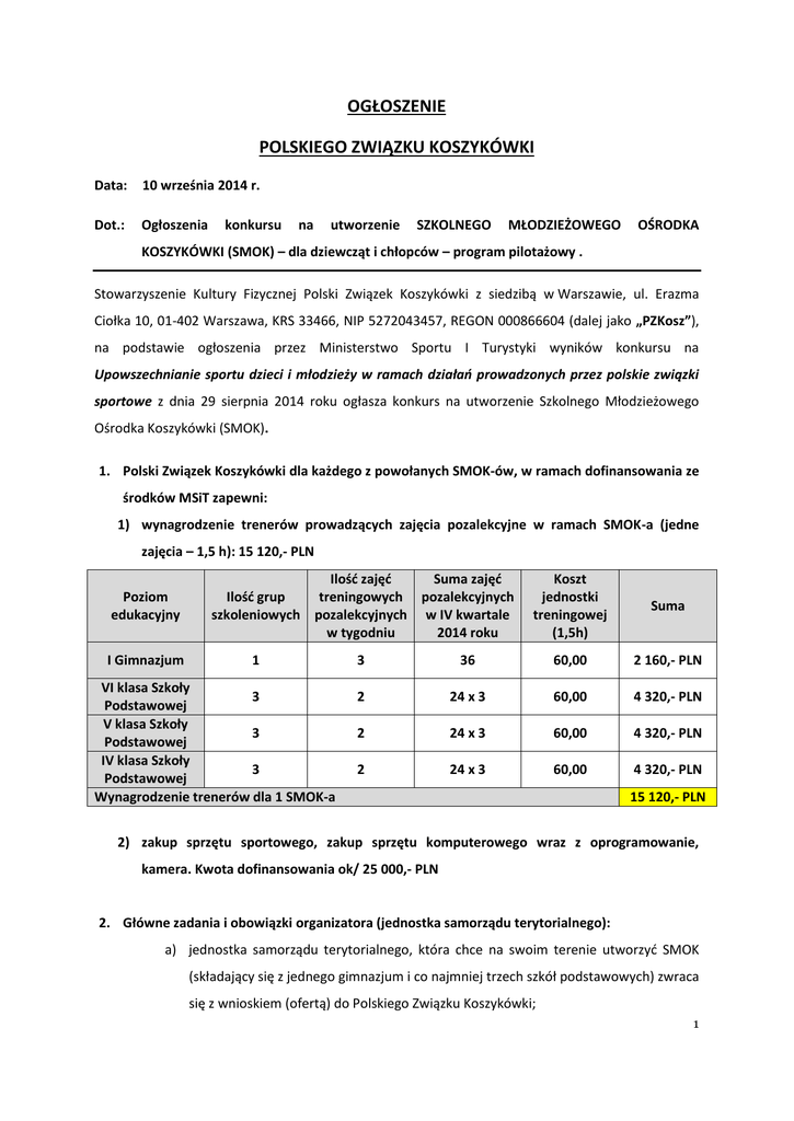 OGŁOSZENIE POLSKIEGO ZWIĄZKU KOSZYKÓWKI Data: 10 września 2014 r. Dot.: Ogłoszenia konkursu na utworzenie SZKOLNEGO MŁODZIEŻOWEGO OŚRODKA KOSZYKÓWKI (SMOK) – dla dziewcząt i chłopców – program pilotażowy . Stowarzyszenie Kultury Fizycznej Polski Związek Koszykówki z siedzibą w Warszawie, ul. Erazma Ciołka 10, 01-402 Warszawa, KRS 33466, NIP 5272043457, REGON 000866604 (dalej jako „PZKosz”), na podstawie ogłoszenia przez Ministerstwo Sportu I Turystyki wyników konkursu na Upowszechnianie sportu dzieci i młodzieży w ramach działań prowadzonych przez polskie związki sportowe z dnia 29 sierpnia 2014 roku ogłasza konkurs na utworzenie Szkolnego Młodzieżowego Ośrodka Koszykówki (SMOK). 1. Polski Związek Koszykówki dla każdego z powołanych SMOK-ów, w ramach dofinansowania ze środków MSiT zapewni: 1) wynagrodzenie trenerów prowadzących zajęcia pozalekcyjne w ramach SMOK-a (jedne zajęcia – 1,5 h): 15 120,- PLN Poziom edukacyjny I Gimnazjum Ilość zajęć Suma zajęć Ilość grup treningowych pozalekcyjnych szkoleniowych pozalekcyjnych w IV kwartale w tygodniu 2014 roku 1 VI klasa Szkoły 3 Podstawowej V klasa Szkoły 3 Podstawowej IV klasa Szkoły 3 Podstawowej Wynagrodzenie trenerów dla 1 SMOK-a Koszt jednostki treningowej (1,5h) Suma 3 36 60,00 2 160,- PLN 2 24 x 3 60,00 4 320,- PLN 2 24 x 3 60,00 4 320,- PLN 2 24 x 3 60,00 4 320,- PLN 15 120,- PLN 2) zakup sprzętu sportowego, zakup sprzętu komputerowego wraz z oprogramowanie, kamera. Kwota dofinansowania ok/ 25 000,- PLN 2. Główne zadania i obowiązki organizatora (jednostka samorządu terytorialnego): a) jednostka samorządu terytorialnego, która chce na swoim terenie utworzyć SMOK (składający się z jednego gimnazjum i co najmniej trzech szkół podstawowych) zwraca się z wnioskiem (ofertą) do Polskiego Związku Koszykówki; 1 b) wyznaczenie koordynatora SMOK (dyrektor gimnazjum lub wyznaczona przez niego kompetentna osoba); c) wyznaczenie trenerów (nauczycieli wychowania fizycznego) prowadzących zajęcia pozalekcyjne w klasach IV – VI szkół podstawowych oraz w klasie I gimnazjum; d) nieodpłatne udostępnienie sal sportowych na zajęcia pozalekcyjne dla dzieci uczących się w wyznaczonych szkołach; e) zakup strojów treningowych dla dzieci biorących udział w zajęciach. 3. Wymagane dokumenty i oświadczenia (na piśmie): a) wniosek jednostki samorządu terytorialnego o utworzenie Szkolnego Młodzieżowego Ośrodka Koszykówki; b) lista szkół wraz z kadrą trenerską (nauczycielską) oraz koordynatorem oraz wstępny plan zajęć pozalekcyjnych prowadzonych w ramach SMOK-a (załącznik nr 1); c) porozumienie o współpracy w ramach jednego SMOK-a pomiędzy trzema szkołami podstawowymi i gimnazjum; 4. Termin i miejsce składania ofert oraz dokumentów: a) dokumenty należy przesłać do dnia 24 września 2014 do godziny 12.00 na adres koordynatora przedsięwzięcia email [email protected] w zamkniętym pliku pdf; b) wszystkie niezbędne dokumenty muszą być złożone pod nazwą: „SZKOLNY MŁODZIEŻOWY OŚRODEK KOSZYKÓWKI w …….. (nazwa miejscowości)”. 5. Procedura i przebieg konkursu: a) komisja konkursowa powołana przez Zarząd PZKosz rozpatrzy nadesłane zgłoszenia oraz przedstawi swoje stanowisko wraz z uzasadnieniem do ostatecznego zatwierdzenia Zarządowi PZKosz; b) komisja konkursowa, spośród nadesłanych ofert wybierze maksymalnie 4 wnioski do realizacji w ramach w/w pilotażu; c) ostateczne wyniki konkursu Zarząd PZKosz ogłosi na oficjalnej stronie internetowej www.pzkosz.pl 6. Inne informacje: a) Zarząd Polskiego Związku Koszykówki zastrzega sobie prawo unieważnienia konkursu bez podania przyczyny. 2 W imieniu Zarządu PZKosz Grzegorz Bachański Prezes Polskiego Związku Koszykówki 3