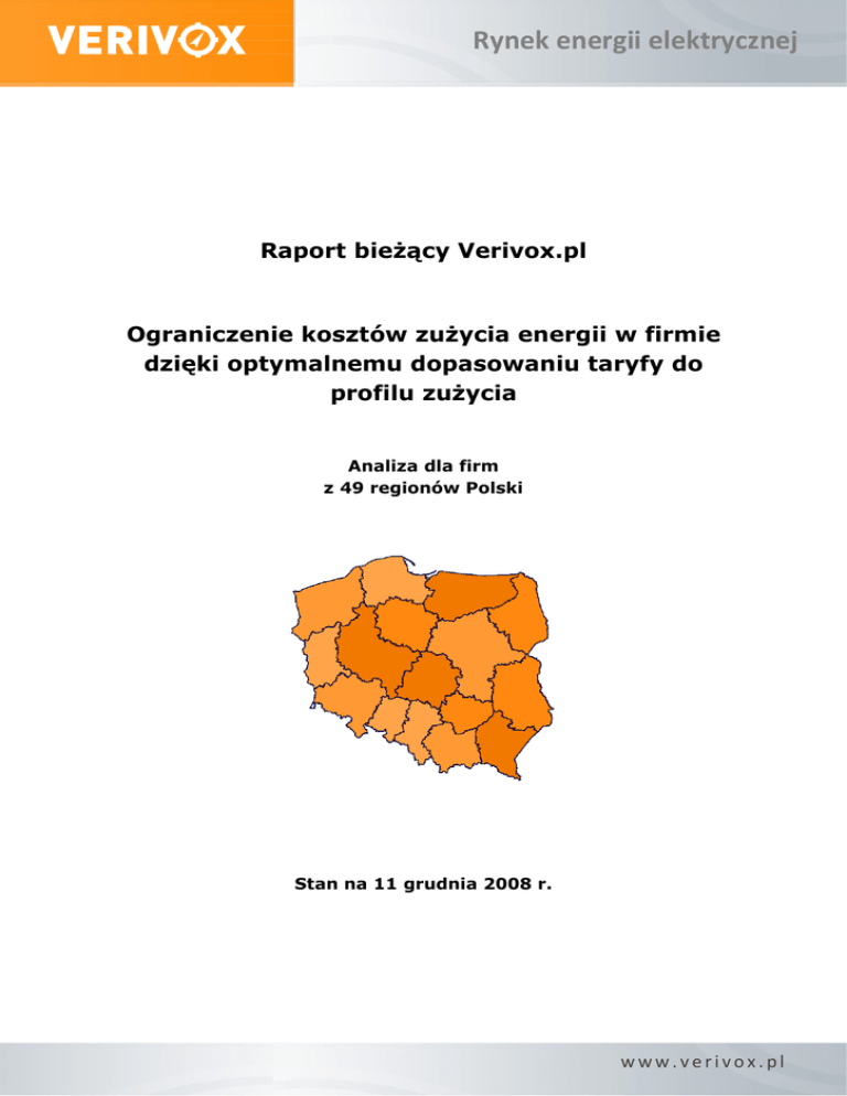 Rynek energii elektrycznej Raport bieŜący Verivox.pl Ograniczenie kosztów zuŜycia energii w firmie dzięki optymalnemu dopasowaniu taryfy do profilu zuŜycia Analiza dla firm z 49 regionów Polski Stan na 11 grudnia 2008 r. www.verivox.pl Spis treści Wstępna informacja o sytuacji na rynku energii w Polsce ........................................... 3 Co przedstawia raport? .............................................................................................................. 3 Jak zmieniają się koszty energii w zaleŜności od wyboru taryfy? ............................. 4 Jaką taryfę wybrać i czy zmiana taryfy się opłaca? ........................................................ 5 Czy kaŜdy przedsiębiorca w Polsce w tym samym stopniu ograniczy koszty poprzez zmianę taryfy? .............................................................................................................. 6 Szczegółowe analizy regionalne .............................................................................................. 9 Jakie inne działania mogą podjąć przedsiębiorcy, aby ograniczać koszty energii w swoich firmach? ...................................................................................................................... 15 Jakie elementy wpływają na wysokość rachunku za energię dla firm? ................. 16 ZałoŜenia przyjęte w kalkulacjach ....................................................................................... 17 Raport Verivox.pl: Ograniczenie kosztów zuŜycia energii w firmie dzięki optymalnemu dopasowaniu taryfy do profilu zuŜycia Strona 2 z 19 Wstępna informacja o sytuacji na rynku energii w Polsce Obecna sytuacja na rynku energii spowodowała, Ŝe przyszłoroczny poziom cen prądu dla przedsiębiorstw to jedna wielka niewiadoma. Firmy energetyczne oczywiście chcą po raz kolejny podnieść ceny energii, nawet o 60 proc, ale głośno sprzeciwiają się temu przedsiębiorcy. Przedstawiciele przedsiębiorców domagają się od rządu podjęcia decyzji o zamroŜeniu na kolejne dwa lata cen energii, powołując się na przykład czeski (CEZ zgodził się na zamroŜenie cen energii w latach 2009-2010). Pomysł zamroŜenia cen popiera Prezes Urzędu Regulacji Energetyki, Mariusz Swora, ale ostateczna decyzja naleŜy do rządu. Ograniczeniu podwyŜek sprzeciwiają się energetycy, którzy argumentują, Ŝe muszą podnieść ceny prądu, poniewaŜ w przyszłym roku znów zdroŜeje węgiel, z którego wytwarza się w Polsce ponad 90 proc. energii. Co przedstawia raport? Raport przedstawia analizę opłacalności zmiany taryfy jednostrefowej na dwustrefową w firmie, na przykładzie niewielkiego biura, restauracji i sklepu. Przedmiotowy raport dowodzi, Ŝe odpowiedni dobór taryfy do profilu zuŜycia energii w firmie pozwala ograniczyć koszty zuŜycia energii nawet o 20,5 proc. NaleŜy jednak zwrócić uwagę na fakt, Ŝe tylko odpowiednio dobrana taryfa daje oszczędności, a sama kwota uzyskanych korzyści w duŜej mierze zaleŜy od regionu, w którym prowadzimy firmę. Nawet o 20,5 proc. mniej za energię płacą przedsiębiorcy, którzy zmienili taryfę jednostrefową na dwustrefową. Tylko dobrze dobrana taryfa do profilu zuŜycia energii w firmie zapewnia oszczędność. Opłacalność zmiany taryfy zaleŜy od regionu, w którym mamy firmę. (dotyczy restauracji w Krakowie lub Nowym Sączu, przy zmianie taryfy C11 na C12a) (dobór najkorzystniejszej taryfy musi opierać się na wstępnej analizie zuŜycia) (w pewnych regionach zmiana taryfy jest bardzo opłacalna, a w innych w ogóle nieopłacalna) Raport Verivox.pl: Ograniczenie kosztów zuŜycia energii w firmie dzięki optymalnemu dopasowaniu taryfy do profilu zuŜycia Strona 3 z 19 Jak zmieniają się koszty energii w zaleŜności od wyboru taryfy? Koszt zuŜycia energii zaleŜy od rodzaju taryfy Przedsiębiorcy prowadzący podstawowe rodzaje taryf: małe i średnie firmy mają do wyboru trzy 1. C11 – jednostrefowa, taka sama cena przez całą dobę. 2. C12a – dwustrefowa, niŜsza cena obowiązuje w godzinach 11-17 i 21-8 od października do końca marca oraz 11-20 i 21-8 od kwietnia do końca września. WyŜsza cena obowiązuje w godzinach 8-11 i 17-21 od października do końca marca oraz 8-11 i 20-21 od kwietnia do końca września. 3. C12b – dwustrefowa, niŜsza cena obowiązuje w godzinach 13-15 i 22-6, a wyŜsza 6-13 i 15-22. Nawet przy jednakowym poziomie zuŜycia energii, w kaŜdej z tych taryf przedsiębiorca zapłaci rachunek za energię w róŜnej wysokości. Wykres 1. Przeciętny roczny koszt zużycia energii w dostępnych taryfach. Jak wynika z analizy, przedsiębiorcy korzystający z taryfy jednostrefowej C11 płacą w większości najwyŜsze rachunki i mogliby je obniŜyć, zmieniając taryfę C11 na C12a lub C12b. Wyjątkiem jest biuro, w którego przypadku taryfa C12b jest nieopłacalna. Raport Verivox.pl: Ograniczenie kosztów zuŜycia energii w firmie dzięki optymalnemu dopasowaniu taryfy do profilu zuŜycia Strona 4 z 19 Jaką taryfę wybrać i czy zmiana taryfy się opłaca? Tylko dobrze dobrana taryfa do profilu zuŜycia energii w firmie zapewnia oszczędność WaŜne jest odpowiednie dopasowanie taryfy do profilu zuŜycia energii w firmie. KaŜdy z analizowanych w raporcie rodzajów działalności ma odmienny profil zuŜycia, tzn. róŜne wielkości zuŜycia, jak i odmienne godziny, w których energia jest zuŜywana. Analiza profilu zuŜycia pozwala na wybranie odpowiedniej taryfy i ocenę opłacalności zmiany. Szczególnie waŜne jest ustalenie ilości energii zuŜytej w godzinach szczytu (wyŜsza cena) i poza szczytem (niŜsza cena). Taryfa dwustrefowa będzie tym bardziej opłacalna, im więcej energii w naszej firmie zuŜywamy poza szczytem. Ze względu na to, Ŝe w taryfach dwustrefowych (C12a i C12b) godziny szczytu i poza szczytu są róŜne, naleŜy ustalić, w jakich godzinach zuŜywamy energię w firmie. Taki godzinowy rozkład zu