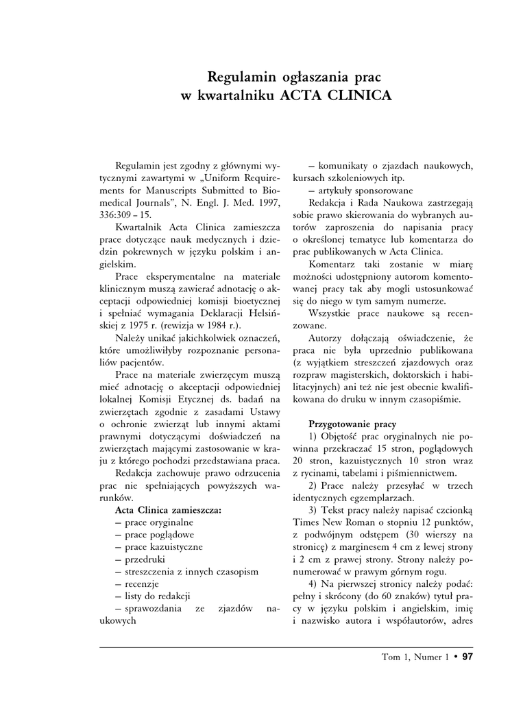 Regulamin ogÆaszania prac w kwartalniku ACTA CLINICA Regulamin jest zgodny z gÆównymi wytycznymi zawartymi w „Uniform Requirements for Manuscripts Submitted to Biomedical Journals”, N. Engl. J. Med. 1997, 336:309 – 15. Kwartalnik Acta Clinica zamieszcza prace dotyczåce nauk medycznych i dziedzin pokrewnych w jæzyku polskim i angielskim. Prace eksperymentalne na materiale klinicznym muszå zawieraì adnotacjæ o akceptacji odpowiedniej komisji bioetycznej i speÆniaì wymagania Deklaracji Helsiñskiej z 1975 r. (rewizja w 1984 r.). Naleºy unikaì jakichkolwiek oznaczeñ, które umoºliwiÆyby rozpoznanie personaliów pacjentów. Prace na materiale zwierzæcym muszå mieì adnotacjæ o akceptacji odpowiedniej lokalnej Komisji Etycznej ds. badañ na zwierzætach zgodnie z zasadami Ustawy o ochronie zwierzåt lub innymi aktami prawnymi dotyczåcymi do¥wiadczeñ na zwierzætach majåcymi zastosowanie w kraju z którego pochodzi przedstawiana praca. Redakcja zachowuje prawo odrzucenia prac nie speÆniajåcych powyºszych warunków. Acta Clinica zamieszcza: — prace oryginalne — prace poglådowe — prace kazuistyczne — przedruki — streszczenia z innych czasopism — recenzje — listy do redakcji — sprawozdania ze zjazdów naukowych — komunikaty o zjazdach naukowych, kursach szkoleniowych itp. — artykuÆy sponsorowane Redakcja i Rada Naukowa zastrzegajå sobie prawo skierowania do wybranych autorów zaproszenia do napisania pracy o okre¥lonej tematyce lub komentarza do prac publikowanych w Acta Clinica. Komentarz taki zostanie w miaræ moºno¥ci udostæpniony autorom komentowanej pracy tak aby mogli ustosunkowaì siæ do niego w tym samym numerze. Wszystkie prace naukowe så recenzowane. Autorzy doÆåczajå o¥wiadczenie, ºe praca nie byÆa uprzednio publikowana (z wyjåtkiem streszczeñ zjazdowych oraz rozpraw magisterskich, doktorskich i habilitacyjnych) ani teº nie jest obecnie kwalifikowana do druku w innym czasopi¥mie. Przygotowanie pracy 1) Objæto¥ì prac oryginalnych nie powinna przekraczaì 15 stron, poglådowych 20 stron, kazuistycznych 10 stron wraz z rycinami, tabelami i pi¥miennictwem. 2) Prace naleºy przesyÆaì w trzech identycznych egzemplarzach. 3) Tekst pracy naleºy napisaì czcionkå Times New Roman o stopniu 12 punktów, z podwójnym odstæpem (30 wierszy na stronicæ) z marginesem 4 cm z lewej strony i 2 cm z prawej strony. Strony naleºy ponumerowaì w prawym górnym rogu. 4) Na pierwszej stronicy naleºy podaì: peÆny i skrócony (do 60 znaków) tytuÆ pracy w jæzyku polskim i angielskim, imiæ i nazwisko autora i wspóÆautorów, adres Tom 1, Numer 1 • 97 Acta Clinica instytucji w których pracujå autorzy pracy, Osobno poniºej naleºy podaì imiæ, nazwisko i adres autora odpowiedzialnego za korespondencjæ dotyczåcå pracy. 5) Na drugiej stronicy naleºy zamie¥ciì streszczenie w jæzyku polskim i angielskim o Æåcznej maksymalnej objæto¥ci do 250 wyrazów. Streszczenie powinno zawieraì zaÆoºenia pracy, okre¥lenie zastosowanych metod, gÆówne wyniki i zasadnicze wnioski. Przed streszczeniem naleºy umie¥ciì peÆny tytuÆ pracy i nazwiska autorów z inicjaÆami imion. Poniºej streszczenia naleºy umie¥ciì sÆowa kluczowe (odpowiednio po polsku i angielsku) po 4 – 5 pozycji, zgodne, o ile to moºliwe, z listå zawartå w Index Medicus (MeSH). 6) Tekst naleºy podzieliì na rozdziaÆy: wstæp, materiaÆ i metody, wyniki (obowiåzujå jednostki SI, ale czæsto¥ì pracy serca moºna podawaì na 1 minutæ, ci¥nienie tætnicze w mm Hg, temperaturæ w stopniach Celsjusza), omówienie, wnioski, podziækowania, pi¥miennictwo, tabele, opisy rycin. Kaºdy rozdziaÆ naleºy rozpoczåì od nowej strony. 7) Na kolejnej stronicy po wnioskach moºna umie¥ciì podziækowania oraz ewentualnå adnotacjæ o finansowym wsparciu przeprowadzonych badañ. 8) Pi¥miennictwo cytowane w tek¥cie naleºy uÆoºyì w ukÆadzie alfabetycznym na kolejnej stronie. PowoÆania w tek¥cie naleºy zaznaczaì nawiasami póÆokrågÆymi. Uwzglædniamy 4 pierwszych autorów i dalej piszemy „i wsp.”. Standardowy artykuÆ naukowy opisujemy w nastæpujåcej kolejno¥ci: Nazwisko, inicjaÆy imion, peÆny tytuÆ pracy, skrót czasopisma (zgodny z Index Medicus), rok, tom, zeszyt (je¥li så one osobno numerowane) pierwszå i ostatniå stronicæ. Dåbrowska M., Andrzejczak A., Ciszek B., Aleksandrowicz R., i wsp.: Microsurgical anatomy of the ve- 98 • Marzec 2001 nous system of the lateral cerebral fossa. Folia Morphol. 1996 55:236 – 237 Pozycje ksiåºkowe opisujemy w kolejno¥ci nazwisko i inicjaÆy imion, tytuÆ, miasto, dom wydawniczy, rok, tom, stronice. Jeºeli powoÆujemy siæ na rozdziaÆ podajemy: nazwisko i inicjaÆy imion autora (autorów), tytuÆ rozdziaÆu, nazwisko i inicjaÆy imion redaktora (redaktorów), tytuÆ ksiåºki, dom wydawniczy, miasto, rok, tom (je¥li så tomy), strony: íuk T.: ZÆamania patologiczne w: Tylman D., Dziak A. (red.): Traumatologia narzådu ruchu. PZWL, Warszawa 1985, t. I, 416 – 447 Wszelkie pozostaÆe rodzaje cytowanych pozycji, jak doktoraty, patenty, materiaÆy audiowizualne i elektroniczne itd. naleºy opisaì zgodnie z zasadami Uniform Requirements. 9) Tabele powinny siæ znajdowaì na kolejnej, osobnej stronie, wydrukowane z podwójnym odstæpem. Powyºej tabeli znajduje siæ jej numer zgodnie z kolejno¥ciå pojawiania siæ w tek¥cie, oraz krótki tytuÆ w jæzyku polskim i angielskim 10) Ryciny (fotografie czarno-biaÆe o szeroko¥ci do 14 cm i wysoko¥ci do 14 cm wykonane na papierze fotograficznym gÆadkim i rysunki oraz wykresy) naleºy doÆåczyì oddzielnie. Na odwrocie u góry miækkim oÆówkiem naleºy je zaopatrzyì w nazwisko i inicjaÆy pierwszego autora, skrócony tytuÆ pracy i numer ryciny. Na kolejnej numerowanej stronie zaopatrzonej u góry w nazwisko i inicjaÆy pierwszego autora oraz skrócony tytuÆ pracy naleºy zaÆåczyì spis kolejno numerowanych rycin z ewentualnymi o