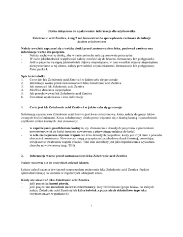 Ulotka dołączona do opakowania: informacja dla użytkownika Zoledronic acid Zentiva, 4 mg/5 ml, koncentrat do sporządzania roztworu do infuzji Acidum zoledronicum Należy uważnie zapoznać się z treścią ulotki przed zastosowaniem leku, ponieważ zawiera ona informacje ważne dla pacjenta. Należy zachować tę ulotkę, aby w razie potrzeby móc ją ponownie przeczytać. W razie jakichkolwiek wątpliwości należy zwrócić się do lekarza, farmaceuty lub pielęgniarki. Jeśli u pacjenta wystąpią jakiekolwiek objawy niepożądane, w tym wszelkie objawy niepożądane niewymienione w tej ulotce, należy powiedzieć o tym lekarzowi, farmaceucie lub pielęgniarce. Patrz punkt 4. Spis treści ulotki: 1. Co to jest lek Zoledronic acid Zentiva i w jakim celu się go stosuje 2. Informacje ważne przed zastosowaniem leku Zoledronic acid Zentiva 3. Jak stosować lek Zoledronic acid Zentiva 4. Możliwe działania niepożądane 5. Jak przechowywać lek Zoledronic acid Zentiva 6. Zawartość opakowania i inne informacje 1. Co to jest lek Zoledronic acid Zentiva i w jakim celu się go stosuje Substancją czynną leku Zoledronic acid Zentiva jest kwas zoledronowy, który należy do grupy leków zwanych bisfosfonianami. Kwas zoledronowy działa przez wiązanie się z tkanką kostną i spowolnienie szybkości zmian kostnych. Jest stosowany: - 2. w zapobieganiu powikłaniom kostnym, np. złamaniom u dorosłych pacjentów z przerzutami nowotworowymi do kości (rozsiew nowotworu z pierwotnego miejsca do kości) w celu zmniejszenia stężenia wapnia we krwi dorosłych pacjentów, kiedy jest zbyt duże z powodu obecności nowotworu. Nowotwory mogą przyspieszać przebudowę tkanki kostnej, powodując zwiększenie uwalniania wapnia z kości. Taki stan określany jest jako hiperkalcemia wywołana chorobą nowotworową (ang. TIH). Informacje ważne przed zastosowaniem leku Zoledronic acid Zentiva Należy stosować się do wszystkich zaleceń lekarza. Lekarz zaleci badania krwi przed rozpoczęciem podawania leku Zoledronic acid Zentiva i będzie sprawdzał reakcję na leczenie w regularnych odstępach czasu. Kiedy nie stosować leku Zoledronic acid Zentiva – jeśli pacjentka karmi piersią. – jeśli pacjent ma uczulenie na kwas zoledronowy, inny bisfosfonian (grupa leków, do których należy Zoledronic acid Zentiva) lub którykolwiek z pozostałych składników tego leku (wymienionych w punkcie 6); 1 Ostrzeżenia i środki ostrożności Przed rozpoczęciem przyjmowania leku Zoledronic acid Zentiva należy omówić to z lekarzem: – jeśli u pacjenta występują lub występowały dolegliwości nerek; – jeśli u pacjenta występuje lub występował ból, obrzęk lub zdrętwienie szczęki, uczucie ciężkości szczęki lub ruszanie się zębów. Lekarz może zalecić pacjentowi zgłoszenie się na badanie stomatologiczne przed rozpoczęciem leczenia lekiem Zoledronic acid Zentiva; – jeśli pacjent jest w trakcie leczenia stomatologicznego albo zamierza poddać się zabiegowi chirurgii szczękowej, powinien poinformować stomatologa o przyjmowaniu leku Zoledronic acid Zentiva i poinformować lekarza prowadzącego o leczeniu stomatologicznym. Podczas leczenia lekiem Zoledronic acid Zentiva należy utrzymywać należytą higienę jamy ustnej (obejmującą regularne mycie zębów) i zgłaszać się na rutynowe badania kontrolne. Należy natychmiast skontaktować się z lekarzem prowadzącym i stomatologiem, jeśli u pacjenta wystąpią jakiekolwiek dolegliwości w obrębie jamy ustnej lub zębów, takie jak obluzowanie zębów, ból lub obrzęk, brak gojenia się owrzodzenia lub obecność wydzieliny, ponieważ mogą one być objawami stanu zwanego martwicą kości szczęki. Pacjenci, którzy poddawani są chemioterapii i (lub) radioterapii, którzy przyjmują kortykosteroidy, którzy poddawani są zabiegom z zakresu chirurgii szczękowej, którzy nie otrzymują rutynowej opieki stomatologicznej, którzy mają choroby dziąseł, którzy palą tytoń, lub którzy w przeszłości przyjmowali bifosfoniany (w celu leczenia lub zapobieżenia zaburzeniom kości) mogą mieć wyższe ryzyko wystąpienia martwicy kości szczęki. U pacjentów leczonych kwasem zoledronowym zgłaszano występowanie zmniejszonego stężenia wapnia we krwi (hipokalcemia), prowadzące do skurczu mięśni, suchości skóry lub uczucia pieczenia. Zgłaszano również jako wtórne do ciężkiej hipokalcemii: nieregularne bicie serca (zaburzenia rytmu serca), napady padaczkowe, skurcz oraz drżenie (tężyczka). W niektórych przypadkach hipokalcemia może prowadzić do zagrożenia życia. Jeśli, którekolwiek z powyższych dotyczy pacjenta należy natychmiast zwrócić się do lekarza. Jeśli u pacjenta występuje hipokalcemia należy ją skorygować przed przyjęciem pierwszej dawki leku Zoledronic acid Zentiva. Pacjent otrzyma odpowiednie suplementy wapnia i witaminy D. Pacjenci w wieku 65 lat i starsi Lek Zoledronic acid Zentiva można stosować u osób w wieku 65 lat i starszych. Brak jest danych odnośnie dodatkowych środków ostrożności wymaganych w tej grupie pacjentów. Dzieci i młodzież Nie zaleca się stosowania leku Zoledronic acid Zentiva u dzieci i młodzieży w wieku poniżej 18 lat. Zoledronic acid Zentiva a inne leki Należy powiedzieć lekarzowi o wszystkich lekach stosowanych przez pacjenta obecnie lub ostatnio, a także o lekach, które pacjent planuje stosować. Szczególnie ważne jest, aby poinformować lekarza o przyjmowaniu: aminoglikozydów (leki stosowane w leczeniu ciężkich zakażeń), kalcytoniny (leku stosowanego w leczeniu osteoporozy pomenopauzalnej i hiperkalcemii), pętlowych leków moczopędnych (leków stosowanych w leczeniu wysokiego ciśnienia krwi i obrzęków) oraz innych leków zmniejszających stężenie wapnia, ponieważ stosowanie ich w połączeniu z bisfosfonianami może powodować nadmierne zmniejszenie stężenia wapnia we krwi; talidomidu (leku stosowanego w leczeniu pewnych nowot