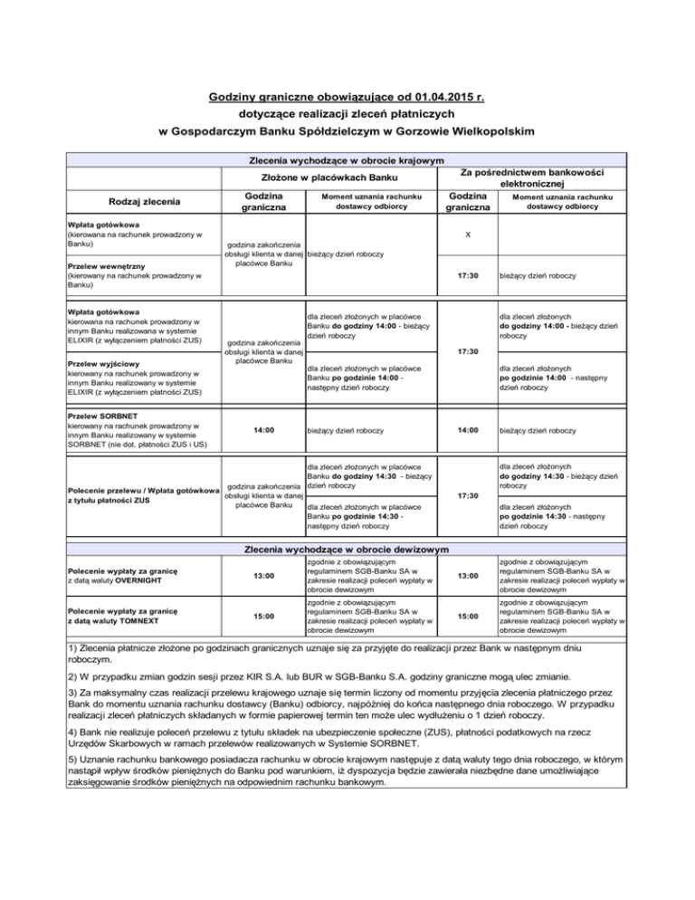 Godziny graniczne obowi zuj ce od 01.04.2015 r. dotycz ce realizacji zlece p atniczych w Gospodarczym Banku Spó dzielczym w Gorzowie Wielkopolskim Zlecenia wychodz ce w obrocie krajowym one w placówkach Banku Rodzaj zlecenia Wp ata gotówkowa (kierowana na rachunek prowadzony w Banku) Przelew wewn trzny (kierowany na rachunek prowadzony w Banku) Wp ata gotówkowa kierowana na rachunek prowadzony w innym Banku realizowana w systemie ELIXIR (z wy czeniem p atno ci ZUS) Przelew wyj ciowy kierowany na rachunek prowadzony w innym Banku realizowany w systemie ELIXIR (z wy czeniem p atno ci ZUS) Przelew SORBNET kierowany na rachunek prowadzony w innym Banku realizowany w systemie SORBNET (nie dot. p atno ci ZUS i US) Godzina graniczna Moment uznania rachunku dostawcy odbiorcy Za po rednictwem bankowo ci elektronicznej Godzina Moment uznania rachunku dostawcy odbiorcy graniczna X godzina zako czenia obs ugi klienta w danej bie placówce Banku cy dzie roboczy 17:30 dla zlece z onych w placówce Banku do godziny 14:00 - bie cy dzie roboczy godzina zako czenia obs ugi klienta w danej placówce Banku cy dzie roboczy dla zlece z onych do godziny 14:00 - bie roboczy cy dzie 17:30 dla zlece z onych w placówce Banku po godzinie 14:00 nast pny dzie roboczy 14:00 bie bie cy dzie roboczy dla zlece z onych w placówce Banku do godziny 14:30 - bie cy godzina zako czenia dzie roboczy Polecenie przelewu / Wp ata gotówkowa obs ugi klienta w danej z tytu u p atno ci ZUS placówce Banku dla zlece z onych w placówce dla zlece z onych po godzinie 14:00 - nast pny dzie roboczy 14:00 bie cy dzie roboczy dla zlece z onych do godziny 14:30 - bie roboczy cy dzie 17:30 dla zlece z onych po godzinie 14:30 - nast pny dzie roboczy Banku po godzinie 14:30 nast pny dzie roboczy Zlecenia wychodz ce w obrocie dewizowym Polecenie wyp aty za granic z dat waluty OVERNIGHT 13:00 zgodnie z obowi zuj cym regulaminem SGB-Banku SA w zakresie realizacji polece wyp aty w obrocie dewizowym 13:00 zgodnie z obowi zuj cym regulaminem SGB-Banku SA w zakresie realizacji polece wyp aty w obrocie dewizowym Polecenie wyp aty za granic z dat waluty TOMNEXT 15:00 zgodnie z obowi zuj cym regulaminem SGB-Banku SA w zakresie realizacji polece wyp aty w obrocie dewizowym 15:00 zgodnie z obowi zuj cym regulaminem SGB-Banku SA w zakresie realizacji polece wyp aty w obrocie dewizowym 1) Zlecenia p atnicze z roboczym. one po godzinach granicznych uznaje si za przyj te do realizacji przez Bank w nast pnym dniu 2) W przypadku zmian godzin sesji przez KIR S.A.,lub BUR w SGB-Banku S.A. godziny graniczne mog ulec zmianie. 3) Za maksymalny czas realizacji przelewu krajowego uznaje si termin liczony od momentu przyj cia zlecenia p atniczego przez Bank do momentu uznania rachunku dostawcy (Banku) odbiorcy, najpó niej do ko ca nast pnego dnia roboczego. W przypadku realizacji zlece p atniczych sk adanych w formie papierowej termin ten mo e ulec wyd eniu o 1 dzie roboczy. 4) Bank nie realizuje polece przelewu z tytu u sk adek na ubezpieczenie spo eczne (ZUS), p atno ci podatkowych na rzecz Urz dów Skarbowych w ramach przelewów realizowanych w Systemie SORBNET. 5) Uznanie rachunku bankowego posiadacza rachunku w obrocie krajowym nast puje z dat waluty tego dnia roboczego, w którym nast pi wp yw rodków pieni nych do Banku pod warunkiem, i dyspozycja b dzie zawiera a niezb dne dane umo liwiaj ce zaksi gowanie rodków pieni nych na odpowiednim rachunku bankowym.