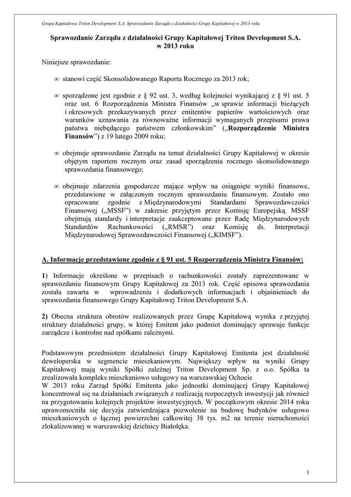 Grupa Kapitałowa Triton Development S.A. Sprawozdanie Zarządu z działalności Grupy Kapitałowej w 2013 roku Sprawozdanie Zarządu z działalności Grupy Kapitałowej Triton Development S.A. w 2013 roku Niniejsze sprawozdanie: • stanowi część Skonsolidowanego Raportu Rocznego za 2013 rok; • sporządzone jest zgodnie z § 92 ust. 3, według kolejności wynikającej z § 91 ust. 5 oraz ust. 6 Rozporządzenia Ministra Finansów „w sprawie informacji bieŜących i okresowych przekazywanych przez emitentów papierów wartościowych oraz warunków uznawania za równowaŜne informacji wymaganych przepisami prawa państwa niebędącego państwem członkowskim” („Rozporządzenie Ministra Finansów”) z 19 lutego 2009 roku; • obejmuje sprawozdanie Zarządu na temat działalności Grupy Kapitałowej w okresie objętym raportem rocznym oraz zasad sporządzenia rocznego skonsolidowanego sprawozdania finansowego; • obejmuje zdarzenia gospodarcze mające wpływ na osiągnięte wyniki finansowe, przedstawione w załączonym rocznym sprawozdaniu finansowym. Zostało ono opracowane zgodnie z Międzynarodowymi Standardami Sprawozdawczości Finansowej („MSSF”) w zakresie przyjętym przez Komisję Europejską. MSSF obejmują standardy i interpretacje zaakceptowane przez Radę Międzynarodowych Standardów Rachunkowości („RMSR”) oraz Komisję ds. Interpretacji Międzynarodowej Sprawozdawczości Finansowej („KIMSF”). A. Informacje przedstawione zgodnie z § 91 ust. 5 Rozporządzenia Ministra Finansów: 1) Informacje określone w przepisach o rachunkowości zostały zaprezentowane w sprawozdaniu finansowym Grupy Kapitałowej za 2013 rok. Część opisowa sprawozdania została zawarta w wprowadzeniu i dodatkowych informacjach i objaśnieniach do sprawozdania finansowego Grupy Kapitałowej Triton Development S.A. 2) Obecna struktura obrotów realizowanych przez Grupę Kapitałową wynika z przyjętej struktury działalności grupy, w której Emitent jako podmiot dominujący sprawuje funkcje zarządcze i kontrolne nad spółkami zaleŜnymi. Podstawowym przedmiotem działalności Grupy Kapitałowej Emitenta jest działalność deweloperska w segmencie mieszkaniowym. Największy wpływ na wyniki Grupy Kapitałowej mają wyniki Spółki zaleŜnej Triton Development Sp. z o.o. Spółka ta zrealizowała kompleks mieszkaniowo usługowy na warszawskiej Ochocie W 2013 roku Zarząd Spółki Emitenta jako jednostki dominującej Grupy Kapitałowej koncentrował się na działaniach związanych z realizacją rozpoczętych inwestycji jak równieŜ na przygotowaniu kolejnych projektów inwestycyjnych. W początkowym okresie 2014 roku uprawomocniła się decyzja zatwierdzająca pozwolenie na budowę budynków usługowo mieszkaniowych o łącznej powierzchni całkowitej 38 tys. m2 na terenie nieruchomości zlokalizowanej w warszawskiej dzielnicy Białołęka. 1 Grupa Kapitałowa Triton Development S.A. Sprawozdanie Zarządu z działalności Grupy Kapitałowej w 2013 roku Na wynik z działalności Grupy Kapitałowej osiągnięty w 2013 roku miały wpływ następujące czynniki: - wynik brutto ze sprzedaŜy wyniósł 5 tys. zł, a na działalności podstawowej (wynik brutto ze sprzedaŜy pomniejszony o koszty administracyjne i sprzedaŜy) wyniósł -4.477 tys. zł. Wynik ten związany był głównie z rozpoznaniem wyniku na sprzedaŜy lokali w zrealizowanej inwestycji TRITON PARK. - wynik na pozostałej działalności operacyjnej 146 tys. zł - wynik z działalności finansowej wynoszący – 4.209 tys. zł był związany głównie z kosztami obsługi kredytu na realizację inwestycji i kosztami finansowymi poniesionymi w związku z realizacją projektu Triton Park. W 2013 roku nie wystąpiły inne czynniki i zdarzenia mające znaczny wpływ na działalność Grupy Kapitałowej i osiągnięte przez niego wyniki finansowe – poza typowymi dla prowadzonej działalności i opisanymi w niniejszym sprawozdaniu. Perspektywy rozwoju działalności Grupy Kapitałowej omówione są w punkcie B. 14 poniŜej (w części zgodnej z wymaganiami §91 ust. 6 Rozporządzenia Ministra Finansów). 3) Poza opisanymi w niniejszym sprawozdaniu wewnętrznymi czynnikami ryzyka, na które naraŜone są spółki z Grupy Kapitałowej, na przyszłe wyniki finansowe grupy będą miały wpływ czynniki zewnętrzne związane z: sytuacją makroekonomiczną w Polsce, koniunkturą na rynku budownictwa mieszkaniowego, zmianą kosztów budowy, cenami nieruchomości itp. oraz dostępnością kredytów mieszkaniowych. Zmiany gospodarcze i pobudzenie aktywności gospodarczej w kraju, mogą spowodować wzrost sprzedaŜy towarów Emitenta oraz spółek z Grupy Kapitałowej. Funkcjonowanie rządowego programu wspierającego zakup mieszkań – Mieszkanie dla Młodych (MdM) oraz Funduszu Mieszkań na Wynajem, zwiększenie maksymalnych cen kwalifikujących do programu MdM będą miały pozytywny wpływ na sprzedaŜ lokali oferowanych przez spółki z grupy. 4) Emitent informuje, Ŝe zgodnie z zapisem § 91 ust. 5 pkt 4) Rozporządzenia Ministra Finansów – treść pełnego oświadczenia o stosowaniu ładu korporacyjnego stanowi wraz z raportem wyodrębnioną część sprawozdania z działalności Emitenta w 2013 roku zatytułowaną „Raport i oświadczenie dotyczące stosowania zasad ładu korporacyjnego w 2013r”. Przy czym Emitent jako podmiot dominujący Grupy Kapitałowej zgodnie z § 92 ust. 3 Rozporządzenia Ministra Finansów (zdanie pierwsze podaje w niniejszym sprawozdaniu opis podstawowych cech stosowanych w spółce systemów kontroli wewnętrznej i zarządzania ryzykiem w odniesieniu do procesu sporządzania sprawozdań finansowych zgodnie z § 91 ust. 5 pkt 4 ppkt c) Rozporządzenia Ministra Finansów. Poszczególne narzędzia stosowane do kontroli wewnętrznej i zarządzania ryzykiem nie stanowią w spółce wyodrębnionych systemów. Proces sporządzania sprawozdań finansowych jest realizowany przez dział finansowy i ks