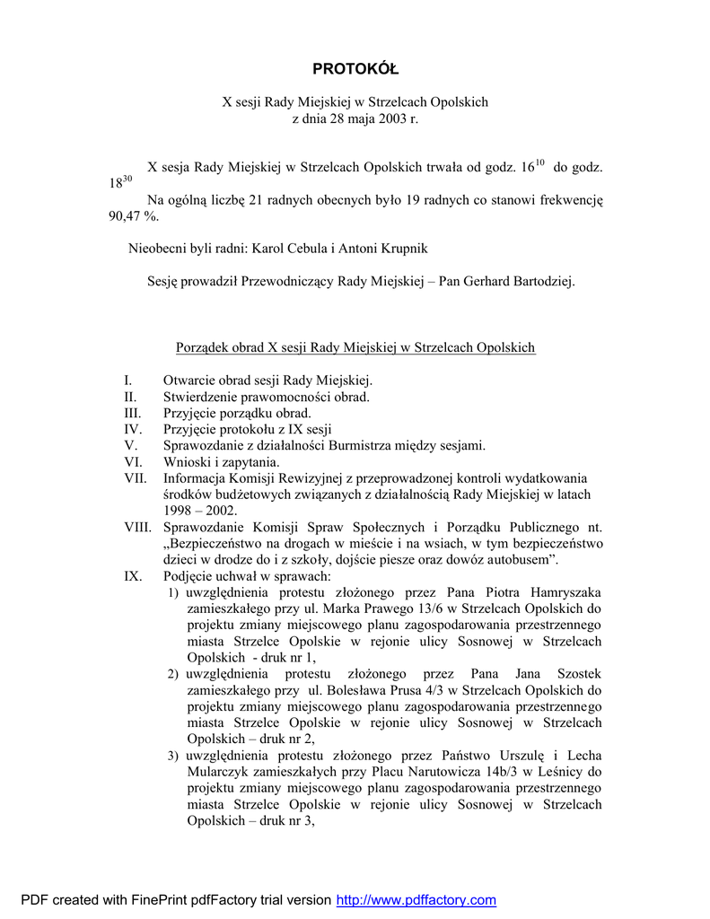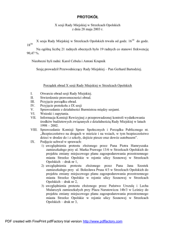 PROTOKÓŁ X sesji Rady Miejskiej w Strzelcach Opolskich z dnia 28 maja 2003 r. X sesja Rady Miejskiej w Strzelcach Opolskich trwała od godz. 16 10 do godz. 1830 Na ogólną liczbę 21 radnych obecnych było 19 radnych co stanowi frekwencję 90,47 %. Nieobecni byli radni: Karol Cebula i Antoni Krupnik Sesję prowadził Przewodniczący Rady Miejskiej – Pan Gerhard Bartodziej. Porządek obrad X sesji Rady Miejskiej w Strzelcach Opolskich I. II. III. IV. V. VI. VII. Otwarcie obrad sesji Rady Miejskiej. Stwierdzenie prawomocności obrad. Przyjęcie porządku obrad. Przyjęcie protokołu z IX sesji Sprawozdanie z działalności Burmistrza między sesjami. Wnioski i zapytania. Informacja Komisji Rewizyjnej z przeprowadzonej kontroli wydatkowania środków budżetowych związanych z działalnością Rady Miejskiej w latach 1998 – 2002. VIII. Sprawozdanie Komisji Spraw Społecznych i Porządku Publicznego nt. „Bezpieczeństwo na drogach w mieście i na wsiach, w tym bezpieczeństwo dzieci w drodze do i z szkoły, dojście piesze oraz dowóz autobusem”. IX. Podjęcie uchwał w sprawach: 1) uwzględnienia protestu złożonego przez Pana Piotra Hamryszaka zamieszkałego przy ul. Marka Prawego 13/6 w Strzelcach Opolskich do projektu zmiany miejscowego planu zagospodarowania przestrzennego miasta Strzelce Opolskie w rejonie ulicy Sosnowej w Strzelcach Opolskich - druk nr 1, 2) uwzględnienia protestu złożonego przez Pana Jana Szostek zamieszkałego przy ul. Bolesława Prusa 4/3 w Strzelcach Opolskich do projektu zmiany miejscowego planu zagospodarowania przestrzennego miasta Strzelce Opolskie w rejonie ulicy Sosnowej w Strzelcach Opolskich – druk nr 2, 3) uwzględnienia protestu złożonego przez Państwo Urszulę i Lecha Mularczyk zamieszkałych przy Placu Narutowicza 14b/3 w Leśnicy do projektu zmiany miejscowego planu zagospodarowania przestrzennego miasta Strzelce Opolskie w rejonie ulicy Sosnowej w Strzelcach Opolskich – druk nr 3, PDF created with FinePrint pdfFactory trial version http://www.pdffactory.com - 2 - 4) odrzucenia protestu złożonego przez Państwo Brygidę i Antoniego Szaton zamieszkałych przy ul. Strzelców Bytomskich 20 w Strzelcach Opolskich do projektu zmiany miejscowego planu zagospodarowania przestrzennego miasta Strzelce Opolskie w rejonie ulicy Sosnowej w Strzelcach Opolskich – druk nr 4, 5) uchwalenia zmiany miejscowego planu zagospodarowania przestrzennego miasta Strzelce Opolskie dotyczącej terenu w rejonie ul. Sosnowej w Strzelcach Opolskich – druk nr 5, 6) powołania doraźnej Komisji ds. sprzedaży gminnych lokali użytkowych oraz ustalenia jej składu osobowego – druk nr 6, 7) ustalenia wysokości stawki procentowej opłaty adiacenckiej – druk nr 7, 8) wyrażenia zgody na sprzedaż nieruchomości gminnej położonej w Strzelcach Opolskich – druk nr 8, 9) zmiany uchwały Nr VII/40/03 Rady Miejskiej w Strzelcach Opolskich z dnia 26 marca 2003 r. o uchwaleniu budżetu gminy na 2003 r. – druk nr 9. X. Odpowiedzi na wnioski i zapytania. XI. Dyskusja, sprawy różne. XII. Sprawy organizacyjne Rady Miejskiej. XIII. Ustalenie daty następnej sesji. XIV. Zamknięcie obrad X sesji Rady Miejskiej. Ad. I) Otwarcia obrad X sesji Rady Miejskiej w Strzelcach Opolskich dokonał Przewodniczący Rady Miejskiej – Pan Gerhard Bartodziej. Ad. II) Na podstawie listy obecności, prowadzący sesję stwierdził jej prawomocność. Ad. III) W dalszej części Przewodniczący zaprezentował porządek obrad Porządek obrad został przyjęty przez aklamację. Ad. IV) Protokół był wyłożony w Biurze Rady Miejskiej od 30 kwietnia 2003 r. Protokół IX sesji został przyjęty przez aklamację. Ad. V) Sprawozdanie z działalności Burmistrza między sesjami W imieniu Burmistrza informacje o ważniejszych sprawach i wydarzeniach, które miały miejsce w ostatnim czasie przedstawił Z-ca Burmistrza – p. Ginter Kostrzewa. (ww. informacja stanowi załącznik do niniejszego protokołu). PDF created with FinePrint pdfFactory trial version http://www.pdffactory.com - 3 - p. K. Mutz – ja chciałem się zapytać jaka jest sytuacja w obrębie budowy wodociągu na Osiedlu w Szymiszowie. Poza tym może ja nie dosłyszałem, kiedy będzie przetarg na remont ul. Brzozowej w Rożniątowie. p. A. Karecki – Pan Burmistrz w swoim sprawozdaniu szeroko nas poinformowa ł o przeprowadzonych przetargach i tu nikt mnie nie upoważnił, więc w imieniu własnym chciałem wyrazić zadowolenie, że w tych przetargach znakomitą większość wygrały przedsiębiorstwa strzeleckie, chociaż, był przypadek, jak wynikało ze sprawozdania, że strzeleckie przedsiębiorstwo nie zawsze wywiązywało się z terminów. Chciałbym tu powiedzieć, że bardzo dobrze, że popiera się rodzime firmy. Natomiast rodzi się pytanie, dlaczego ogłoszenia o tych przetargach są zamieszczane w „Trybunie Opolskiej”, a nie w gazecie lokalnej, chyba, że „Strzelec Opolski” jest droższy a może nie chce w ogóle drukować tych ogłoszeń? W odpowiedzi na powyższe p. Kostrzewa przekazał, iż w Szymiszowie jest wykonawca z Opola, który nie dotrzymuje terminów, pozostaje wyegzekwowanie zakończenia robót oraz kar, które się gminie należą. Ponadto przekazał, iż przetarg na ul. Brzezową zostanie przeprowadzony zgodnie z harmonogramem, radny zostanie poinformowany telefonicznie. W kwestii zamieszczania ogłoszeń o przetargach na łamach Nowej Trybuny Opolskiej przekazał, iż sprawy przetargów są załatwiane przez Kierownika Referatu Zamówień Publicznych ściśle z przepisami. Gazeta „Strzelec Opolski” ma tylko zasięg powiatowy, a w przetargach biorą udział przedsiębiorstwa nie tylko z województwa opolskiego. Informacja na ten temat zostanie przekazana radnemu w ciągu najbliższych dni zapewnił Burmistrz Kostrzewa. Brak dalszych uwag do sprawozdania. Ad. VI) Wnioski i zapytania p. J. Bocian - „dlaczego wpuszcza się szczupaki między płotki” – sprawa dotyczy przetarg