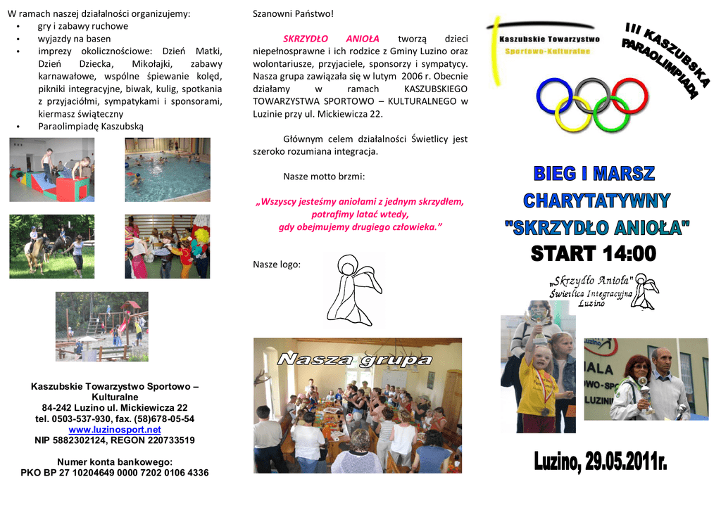 W ramach naszej działalności organizujemy: • gry i zabawy ruchowe • wyjazdy na basen • imprezy okolicznościowe: Dzieo Matki, Dzieo Dziecka, Mikołajki, zabawy karnawałowe, wspólne śpiewanie kolęd, pikniki integracyjne, biwak, kulig, spotkania z przyjaciółmi, sympatykami i sponsorami, kiermasz świąteczny • Paraolimpiadę Kaszubską Szanowni Paostwo! SKRZYDŁO ANIOŁA tworzą dzieci niepełnosprawne i ich rodzice z Gminy Luzino oraz wolontariusze, przyjaciele, sponsorzy i sympatycy. Nasza grupa zawiązała się w lutym 2006 r. Obecnie działamy w ramach KASZUBSKIEGO TOWARZYSTWA SPORTOWO – KULTURALNEGO w Luzinie przy ul. Mickiewicza 22. Głównym celem działalności Świetlicy jest szeroko rozumiana integracja. Nasze motto brzmi: „Wszyscy jesteśmy aniołami z jednym skrzydłem, potrafimy latad wtedy, gdy obejmujemy drugiego człowieka.” Nasze logo: Kaszubskie Towarzystwo Sportowo – Kulturalne 84-242 Luzino ul. Mickiewicza 22 tel. 0503-537-930, fax. (58)678-05-54 www.luzinosport.net NIP 5882302124, REGON 220733519 Numer konta bankowego: PKO BP 27 10204649 0000 7202 0106 4336 8. REGULAMIN II CHARYTATYWNY BIEG I CHARYTATYWNY MARSZ SKRZYDŁO ANIOŁA 1. Cel imprezy integracja biegaczy pełno- i niepełnosprawnych zebranie funduszy na cele rehabilitacyjne dzieci ze świetlicy integracyjnej „Skrzydło Anioła” w Luzinie popularyzacja i upowszechnienie biegania jako najprostszej formy aktywności fizycznej O r ganizat or Kaszubskie Towarzystwo Sportowo-Kulturalne w Luzinie Świetlica integracyjna „Skrzydło Anioła” w Luzinie Ter min i miejsce impr ezy 29.05.2011r., tereny przy hali widowiskowo-sportowej im. Macieja Płażyńskiego w Luzinie G o d z i n a s t a r t u, d y s t a n s Start do biegu i marszu charytatywnego: 14:00 dystans biegu 5km (5 pętli po 1km) dystans marszu: 3km (3 pętle po 1km) Zapisy do dnia 27.05.2011r. – zapisy przez internet prosimy o wysłanie maila na adres: [email protected] z poniższymi danymi imię i nazwisko, data urodzenia, szkoła/klub sportowy/miejsce zamieszkania, adres zamieszkania, adres e-mail w dniu zawodów, 29.05.2011r., w biurze zawodów od godz. 11 Wpisowe wysokość wpisowego jest dobrowolna można uiszczać je przelewem: Numer konta bankowego: PKO BP 27 102046490000 7202 0106 4336 w tytule: Bieg charytatywny „Skrzydło Anioła” lub w biurze zawodów, w dniu startu W arunki ucz est nict w a w biegu i marszu mogą wziąć udział wszyscy chętni, którzy zgłosili swój udział i zostali wpisani na listę uczestników biegu zgodnie z pkt.5 regulaminu do biegu i marszu zostaną dopuszczone osoby, które podpiszą zaświadczenie o braku przeciwwskazań zdrowotnych do startu na dystansie 5km; na start zawodnika poniżej 18 roku życia pisemną zgodę powinien podpisać rodzic; w przypadku zgłoszeń grupowych za sprawdzenie zaświadczeń lekarskich odpowiedzialny jest opiekun grupy zawodnicy startują na własną odpowiedzialność jeżeli chciałbyś z nami pobiec ale tego dnia nie możesz przyjechać do Luzina napisz maila na adres: [email protected] 2. 3. 4. 5. 6. 7. 9. K l a s y f i k a c j a, n a g r o d y i w y r ó ż n i e n i a osobna klasyfikacja kobiet i mężczyzn wszyscy zawodnicy na mecie otrzymują pamiątkowego aniołka zawodnicy, którzy podadzą w zgłoszeniu adres e-mail otrzymają pamiątkowy dyplom uczestnictwa w biegu dla wszystkich uczestników przewidziany jest słodki poczęstunek i kawa/herbata za zajęcie miejsc I-III w klasyfikacji kobiet i mężczyzn pamiątkowe puchary wśród wszystkich uczestników biegu zostaną rozlosowane atrakcyjne nagrody Inne postanow ienia zabroniony jest start w kolcach organizator zapewnia szatnie i natryski dzieciom zawodników zapewniamy fachową opiekę pedagogów-wychowawców w czasie związanym z przygotowaniami do startu interpretacja niniejszego regulaminu należy wyłącznie do Organizatora i Sędziego Głównego zawodów informacje dotyczące biegu można uzyskać pod numerem telefonu: 692109021, 660572461 lub wysyłając maila na adres: [email protected] za rzeczy zgubione organizator nie odpowiada SERDECZNIE ZAPRASZAMY Organizatorzy biegu LICZYMY, ŻE TEGO DNIA NIE ZABRAKNIE CIĘ WŚRÓD NAS :) 29.05.2011 r. odbędzie się III KASZUBSKA PARAOLIMPIADA, podczas której organizatorzy planują WIELKĄ SPORTOWĄ INTEGRACJĘ: zawody sportowe osób z niepełnosprawnością oraz bieg i marsz charytatywny dla SKRZYDŁA ANIOŁA pełnosprawnych sportowców. Paraolimpiada rozgrywać się będzie w pełni wyposażonej Hali Widowiskowo Sportowej GOSRiT im. Macieja Płażyńskiego w Luzinie, wraz z wyspecjalizowaną kadrą sędziowską oraz obsługą medyczną. Patronat honorowy obejmie: Marszałek Województwa Pomorskiego, Wójt Gminy Luzino, Rada Gminy Luzino. Patronat medialny: TTM Chopin, Panorama Powiatu, Radio KASZEBE, Express Powiatu oraz inne media lokalne. Zorganizowanie imprezy będzie możliwe wyłącznie dzięki sponsorom, którym my, jako organizatorzy, gwarantujemy: o miejsca na banery, wizytówki i ulotki, o informacje w mediach, o dyplomy – podziękowania, o niezapomniane przeżycia, o symboliczne upominki Zapraszamy do wspólnej zabawy i radości dzielenia się z innymi – Społeczność Świetlicy Integracyjnej SKRZYDŁO ANIOŁA.