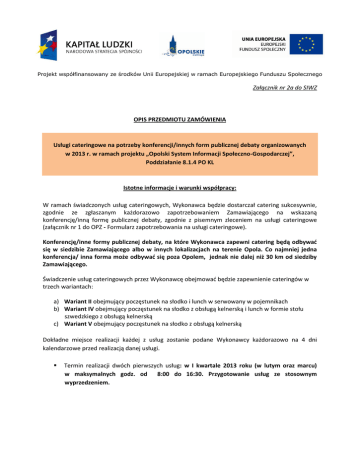 Projekt współfinansowany ze środków Unii Europejskiej w ramach Europejskiego Funduszu Społecznego Społecznego Załącznik nr 2a do SIWZ OPIS PRZEDMIOTU ZAMÓWIENIA Usługi cateringowe na potrzeby konferencji/innych form publicznej debaty organizowanych w 2013 r. w ramach projektu „Opolski System Informacji Społeczno-Gospodarczej”, Poddziałanie 8.1.4 PO KL Istotne informacje i warunki współpracy: W ramach świadczonych usług cateringowych, Wykonawca będzie dostarczał catering sukcesywnie, zgodnie ze zgłaszanym każdorazowo zapotrzebowaniem Zamawiającego na wskazaną konferencję/inną formę publicznej debaty, zgodnie z pisemnym zleceniem na usługi cateringowe (załącznik nr 1 do OPZ - Formularz zapotrzebowania na usługi cateringowe). Konferencję/inne formy publicznej debaty, na które Wykonawca zapewni catering będą odbywać się w siedzibie Zamawiającego albo w innych lokalizacjach na terenie Opola. Co najmniej jedna konferencja/ inna forma może odbywać się poza Opolem, jednak nie dalej niż 30 km od siedziby Zamawiającego. Świadczenie usług cateringowych przez Wykonawcę obejmować będzie zapewnienie cateringów w trzech wariantach: a) Wariant II obejmujący poczęstunek na słodko i lunch w serwowany w pojemnikach b) Wariant IV obejmujący poczęstunek na słodko z obsługą kelnerską i lunch w formie stołu szwedzkiego z obsługą kelnerską c) Wariant V obejmujący poczęstunek na słodko z obsługą kelnerską Dokładne miejsce realizacji każdej z usług zostanie podane Wykonawcy każdorazowo na 4 dni kalendarzowe przed realizacją danej usługi. Termin realizacji dwóch pierwszych usług: w I kwartale 2013 roku (w lutym oraz marcu) w maksymalnych godz. od 8:00 do 16:30. Przygotowanie usług ze stosownym wyprzedzeniem. Projekt współfinansowany ze środków Unii Europejskiej w ramach Europejskiego Funduszu Społecznego Społecznego W przypadku realizacji usług cateringowych w siedzibie Zamawiającego, tj. w Urzędzie Marszałkowskim Województwa Opolskiego, Zamawiający udostępni na potrzeby cateringu obejmującego poczęstunek stoły ustawione przed wejściem do sali lub w sali, a na potrzeby cateringu obejmującego lunch salę cateringową wraz ze stołami. W ramach poszczególnych wariantów zamówienia zostaną zapewnione co najmniej: WARIANT II obejmujący: 1). Poczęstunek na słodko napoje zimne: butelkowana woda – gazowana i niegazowana w równych proporcjach (o pojemności co najmniej 250 ml każda butelka, co najmniej 500 ml/os.) z zapewnieniem jednakowych szklanek (literatek) o pojemności 100-150 ml, soki owocowe (100%) w kartonach – w dwóch smakach w równych proporcjach – w ilości co najmniej 0,4 l/os., soki serwowane w szklanych dzbankach o pojemności od 1-2 litra z przezroczystego szkła, z zapewnieniem jednakowych szklanek (literatek) o pojemności 100-150 ml. napoje gorące serwowane bez ograniczeń, co najmniej 450 ml/os. każdy: kawa zaparzana i serwowana z ekspresu do ceramicznych filiżanek herbata wybór spośród minimum czterech rodzajów herbat ekspresowych w torebkach, w tym herbata czarna (woda do zaparzenia herbaty serwowana do ceramicznych filiżanek z termosów gastronomicznych z kranem, torebki herbaty pakowane w indywidualne koperty) dodatki: porcjowana śmietanka UHT w małych kubeczkach o wadze co najmniej 10 g każdy, cukier pakowany w małe saszetki, świeża cytryna w plasterkach, przekrojonych na połowę, (wszystkie dodatki mają być w ilości proporcjonalnej do liczby uczestników i napoi), ciastka: wybór spośród minimum sześciu rodzajów, np.: małe nadziewane rogaliki, babeczki z owocami, ciastka w polewie czekoladowej lub inne propozycje ciastek z wyłączeniem herbatników – w ilości minimum 80 g/os., ciasta porcjowane: 3 rodzaje, w tym sernik i kołocz śląski z nadzieniem jabłkowym (80 g/os. każde ciasto), owoce świeże: sezonowe podane w dekoracyjny sposób, 4 rodzaje z niżej wymienionych (łącznie co najmniej 300 g/os.): słodkie mandarynki bez pestek, białe, czerwone winogrona w kiściach, ananas z wydrążonym trzpieniem pokrojony w plastry, kiwi obrane, pokrojone w plastry, słodka pomarańcza bez pestek obrana pokrojona w okrągłe plastry, grejpfrut czerwony obrany pokrojony w okrągłe plastry, całe banany, całe truskawki, melon pokrojony w plastry, nektarynka/brzoskwinia pokrojone w ćwiartki bez pestki), Projekt współfinansowany ze środków Unii Europejskiej w ramach Europejskiego Funduszu Społecznego Społecznego 2). Lunch serwowany w pojemnikach danie na gorąco: np. kotlet z kurczaka z ananasem, rolada drobiowa z warzywami, pieczeń z karczku, kotlet devolaille, rolada wołowa; gołąbki z pieczarkami, łosoś w sosie śmietanowo koperkowym, makaron z warzywami w sosie pomidorowym, ryżowe kotleciki z warzywami przeznaczone do konsumpcji przy użyciu jednego sztućca, w ilości łącznej co najmniej 150 g/os., ciepły dodatek do dania na gorąco: np. kluski śląskie, pieczone talarki ziemniaczane, kopytka z ziołami, ryż z dodatkami, krokiety ziemniaczane w ilości łącznej co najmniej 150 g/os., surówki/sałatki do dań na gorąco: minimum dwie w ilości łącznej co najmniej 200 g/os. Sałatki składają się z min. 4 składników głównych (świeże warzywa) i odpowiednich składników dodatkowych. Ewentualne przyprawy, majonez, śmietana, jogurt, oliwa, sosy, dipy, ser feta itp. stanowią element dodatkowy sałatek i nie należy je zaliczać do 4 składników głównych, Podane gramatury dotyczą dań i posiłków po obróbce gastronomicznej. ------------------------------------------------------------------------------------------------------------------------------------WARIANT IV obejmujący: Poczęstunek na słodko z obsługą kelnerską napoje zimne: butelkowana woda – gazowana i niegazowana w równych proporcjach (o pojemności co najmniej 250 ml każda butelka, co najmniej 250 ml/os.), z zapewnieniem jednakowych szklanek (literatek) o poj