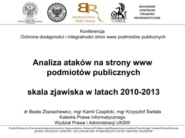 Konferencja Ochrona dostępności i integralności stron www podmiotów publicznych Analiza ataków na strony www podmiotów publicznych skala zjawiska w latach 2010-2013 dr Beata Zbarachewicz, mgr Kamil Czaplicki, mgr Krzysztof Świtała Katedra Prawa Informatycznego Wydział Prawa i Administracji UKSW Zagrożenia związane z rozwojem cywilizacyjnym Cyberterroryzm - politycznie umotywowana, przemyślana działalność grup narodowych lub innych wrogich sił wymierzona przeciw informacji, systemom komputerowym, programom i danym, która powoduje straty cywilne. Cyberterroryzm - terroryzm wymierzony przeciwko newralgicznym dla państwa systemom, sieciom i usługom teleinformatycznym. Newralgiczne dla państwa systemy to min. systemy i sieci teleinformatyczne wykorzystywane przez administrację rządową, władzę ustawodawczą, władzę sądowniczą, organy administracji terytorialnej, organy bezpieczeństwa czy nawet wybrane podmioty gospodarcze takie jak: firmy telekomunikacyjne, energetyczne, rafinerie, banki. Bógdał-Brzezińska Agnieszka, Gawrycki Marcin Florian, Cyberterroryzm i problemy bezpieczeństwa informacyjnego we współczesnym świecie. Wydawnictwo ASPRA-JR, Warszawa 2003r. s. 66 Przykład metod i form cyberprzestępczosci • • • • • • • • Hacking komputerowy Podsłuch komputerowy Sabotaż komputerowy Szpiegostwo komputerowe Bezprawne niszczenie informacji Zakłócenie automatycznego przetwarzania informacji związane ze sprowadzeniem niebezpieczeństwa powszechnego Fałszerstwo komputerowe Oszustwo komputerowe Skala ataków W 2012 r. odnotowano 1168 zgłoszeń o przestępstwach komputerowych, z czego 457 zostało potwierdzonych przez zespół CERT.GOV.PL. W 2011 r. zarejestrowano 854 zgłoszenia, z czego 249 zostało potwierdzonych, a w 2010 r. - 621 zgłoszeń i 155 potwierdzonych. 1168 1500 1000 854 621 155 500 457 249 0 2010 2011 zarejstrowane zgłoszenia 2012 incydenty Statystyki z systemu ARAKIS–GOV Statystyka ataków z podziałem na kategorie 2012 0 20 40 60 49 Botnets 42 Inne 36 Błędy aplikacj i WEB 27 Spam 26 23 Włam anie do aplikacj i Rozproszony atak blokuj ący serwis (DDoS) 19 17 Wirus Koń Troj ański 16 13 Nieusprawiedliwiona zm ian inform acj i Nieuprawniony dostęp do inform acj i 9 9 Inży nieria społeczna Kradzież tożsam osci, podszy cie się (w ty m Phishing) Błednna konfiguracj a urządzenia Próby nieuprawnionego logowania Dy skredy tacj a, obrażanie Działania adm inów 100 120 117 Skanowanie Atak blokuj ący serwis (DoS) 80 8 8 6 5 5 Statystyka ataków z podziałem na kategorie 2011 0 5 10 15 20 25 30 31 30 Inne 27 Spam 19 Nieusprawiedliwiona zm ian inform acj i 13 13 Włam anie do aplikacj i Wirus 10 Błednna konfiguracj a urządzenia 9 Robak sieciowy 7 7 Kradzież tożsam osci, podszy cie się (w ty m Phishing) Działania adm inów 6 6 Próby nieuprawnionego logowania Inży nieria społeczna 5 5 Oprogram owanie szpiegowskie Nieuprawnione wy korzy stanie zasobów 4 4 Koń Troj ański Atak blokuj ący serwis (DoS) 3 3 3 Rozproszony atak blokuj ący serwis (DDoS) Nieuprawniony dostęp do inform acj i Dy skredy tacj a, obrażanie Brak klasy fikacj i Botnets 40 40 Skanowanie Błędy aplikacj i WEB Wy korzy stanie znany ch luk sy stem owy ch 35 2 1 1 45 Statystyka ataków z podziałem na kategorie 2010 Ataki na publiczne strony www w 2012r. Najbardziej spektakularnym w ostatnich latach atakiem był przeprowadzony w pierwszym i drugim kwartale 2012 r. przez Anonymous, działającą w ramach protestu przeciwko porozumieniu (Anti-Counterfeiting Trade Agrement). Początkowo były to ataki typu jednakże w drugim kwartale 2012 dochodziło już do zmiany na stronach internetowych oraz wykradania danych z baz danych. atak grupę ACTA Ddos, treści Ataki na publiczne strony www w 2012 r. w ramach protestu przeciw ACTA Przykładami stron które padły ofiarą ataku są strony: Kancelarii Prezesa Rady Ministrów, Ministerstwa Edukacji Narodowej, Ministerstwa Kultury i Dziedzictwa Narodowego, Narodowego Funduszu Zdrowia, Centralnej Komisji Egzaminacyjnej, Ministerstwa Zdrowia. W sumie, w czasie zmasowanego ataku w 2012 r. na administrację publiczną, zaatakowano 45 stron internetowych. Oprócz wspomnianych wyżej stron administracji rządowej atakom uległy strony Sądu Okręgowego w Gdańsku, Muzeum Okręgowego w Toruniu, Schroniska dla Nieletnich w Stawiszynie, Sądu Okręgowego w Piotrkowie Trybunalskim, Okręgowego Inspektoratu Pracy w Katowicach, Powiatowego Inspektoratu Weterynarii w Mińsku Mazowieckim, Powiatowego Inspektoratu Nadzoru Budowlanego Miasta Skierniewice, Biuletynu Informacji Publicznej Powiatowego Inspektoratu Weterynarii w Giżycku, Sądu Rejonowego w Mogilnie, Ataki na publiczne strony www w 2012 r. w ramach protestu przeciw ACTA Sądu Rejonowego w Tucholi, Sądu Rejonowego w Bydgoszczy, Sądu Rejonowego w Nakle, Sądu Rejonowego w Szubinie, Sądu Rejonowego w Inowrocławiu, Prokuratury Okręgowej w Poznaniu, Prokuratury Apelacyjnej w Białymstoku, Prokuratury Okręgowej w Poznaniu, Agencji Rynku Rolnego, Centralnej Komisji Egzaminacyjnej, Instytutu Biologii Doświadczalnej im M. Nenckiego w Warszawie, Sądu Rejonowego w Tarnobrzegu, Centrum Doradztwa Rolniczego w Brwinowie, Sądu Rejonowego w Gryfinie, Komendy Miejskiej Państwowej Straży Pożarnej w Sosnowcu, Sądu Rejonowego w Brzozowie, Sadu Rejonowego w Lesku, Agend ONZ w Polsce, Parlamentarnego Zespołu ds. zbadania przyczyn katastrofy smoleńskiej, Archiwum Państwowego w Bydgoszczy, Komendy Wojewódzkiej Policji w Gorzowie Wielkopolskim, Archiwum Państwowego w Kielcach, Komendy Powiatowej Państwowej Straży Pożarnej Tarnowskie Góry, Archiwum Państwowego w Koszalinie, Komitetu Badań Polarnych Polskiej Akademii Nauk. Statystyki incydentów koordynowanych przez zespół CERT.GOV.PL w 2012 roku Ataki na publiczne strony www w 2012 r. w ramach protestu przeciw ACTA Dziękuję za uwagę [email protected]