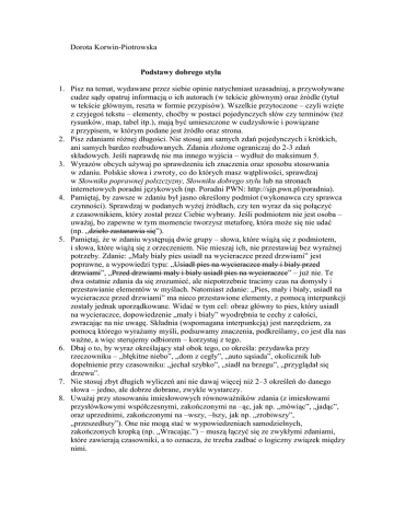 Dorota Korwin-Piotrowska Podstawy dobrego stylu 1. Pisz na temat, wydawane przez siebie opinie natychmiast uzasadniaj, a przywoływane cudze sądy opatruj informacją o ich autorach (w tekście głównym) oraz źródle (tytuł w tekście głównym, reszta w formie przypisów). Wszelkie przytoczone – czyli wzięte z czyjegoś tekstu – elementy, choćby w postaci pojedynczych słów czy terminów (też rysunków, map, tabel itp.), mają być umieszczone w cudzysłowie i powiązane z przypisem, w którym podane jest źródło oraz strona. 2. Pisz zdaniami różnej długości. Nie stosuj ani samych zdań pojedynczych i krótkich, ani samych bardzo rozbudowanych. Zdania złożone ograniczaj do 2-3 zdań składowych. Jeśli naprawdę nie ma innego wyjścia – wydłuż do maksimum 5. 3. Wyrazów obcych używaj po sprawdzeniu ich znaczenia oraz sposobu stosowania w zdaniu. Polskie słowa i zwroty, co do których masz wątpliwości, sprawdzaj w Słowniku poprawnej polszczyzny, Słowniku dobrego stylu lub na stronach internetowych poradni językowych (np. Poradni PWN: http://sjp.pwn.pl/poradnia). 4. Pamiętaj, by zawsze w zdaniu był jasno określony podmiot (wykonawca czy sprawca czynności). Sprawdzaj w podanych wyżej źródłach, czy ten wyraz da się połączyć z czasownikiem, który został przez Ciebie wybrany. Jeśli podmiotem nie jest osoba – uważaj, bo zapewne w tym momencie tworzysz metaforę, która może się nie udać (np. „dzieło zastanawia się”). 5. Pamiętaj, że w zdaniu występują dwie grupy – słowa, które wiążą się z podmiotem, i słowa, które wiążą się z orzeczeniem. Nie mieszaj ich, nie przestawiaj bez wyraźnej potrzeby. Zdanie: „Mały biały pies usiadł na wycieraczce przed drzwiami” jest poprawne, a wypowiedzi typu: „Usiadł pies na wycieraczce mały i biały przed drzwiami”, „Przed drzwiami mały i biały usiadł pies na wycieraczce” – już nie. Te dwa ostatnie zdania da się zrozumieć, ale niepotrzebnie tracimy czas na domysły i przestawianie elementów w myślach. Natomiast zdanie: „Pies, mały i biały, usiadł na wycieraczce przed drzwiami” ma nieco przestawione elementy, z pomocą interpunkcji zostały jednak uporządkowane. Widać w tym cel: obraz główny to pies, który usiadł na wycieraczce, dopowiedzenie „mały i biały” wyodrębnia te cechy z całości, zwracając na nie uwagę. Składnia (wspomagana interpunkcją) jest narzędziem, za pomocą którego wyrażamy myśli, podsuwamy znaczenia, podkreślamy, co jest dla nas ważne, a więc sterujemy odbiorem – korzystaj z tego. 6. Dbaj o to, by wyraz określający stał obok tego, co określa: przydawka przy rzeczowniku – „błękitne niebo”, „dom z cegły”, „auto sąsiada”, okolicznik lub dopełnienie przy czasowniku: „jechał szybko”, „siadł na brzegu”, „przyglądał się drzewu”. 7. Nie stosuj zbyt długich wyliczeń ani nie dawaj więcej niż 2–3 określeń do danego słowa – jedno, ale dobrze dobrane, zwykle wystarczy. 8. Uważaj przy stosowaniu imiesłowowych równoważników zdania (z imiesłowami przysłówkowymi współczesnymi, zakończonymi na –ąc, jak np. „mówiąc”, „jadąc”, oraz uprzednimi, zakończonymi na –wszy, –łszy, jak np. „zrobiwszy”, „przeszedłszy”). One nie mogą stać w wypowiedzeniach samodzielnych, zakończonych kropką (np. „Wracając.”) – muszą łączyć się ze zwykłymi zdaniami, które zawierają czasowniki, a to oznacza, że trzeba zadbać o logiczny związek między nimi. 9. Omijaj z daleka rafy lub naucz się je pokonywać. Oto jedna z nich, czyli imiesłowowe równoważniki zdania. Niepoprawne jest powiedzenie „Jadąc autem, była ładna pogoda”, bo to nie pogoda jechała autem – podmiot drugiego zdania musi być ten sam w obu wypowiedzeniach. Wersja poprawna: „Gdy jechałem autem, była ładna pogoda”. Pamiętaj też zawsze o oddzieleniu przecinkiem całego wypowiedzenia z tymi imiesłowami od pozostałych zdań składowych. Kiedy piszesz słowo z –ąc, –wszy, –łszy na końcu, zaraz szukaj miejsca, gdzie wstawić ten znak. Zobacz zdania: „Jadąc autem, śpiewałem wesoło”, „Wypiwszy kawę, poszedłem pościelić łóżko”. Zupełnie czym innym jest użycie gotowych zwrotów, typu: „mówiąc krótko”, „podsumowując”, po nich po prostu umieszcza się po przecinku kolejne zdanie, w którym dokonuje się krótkiego przedstawienia stanu rzeczy – np. „Mówiąc krótko, sytuacja nie jest dobra. 10. Zostaw zaskakujące efekty artystyczne pisarzom i nie mieszaj stylów. Dobierz styl (urzędowy, naukowy, publicystyczny itp.) oraz ton wypowiedzi (poważny, podniosły albo żartobliwy czy ironiczny) do tematu – i tego się trzymaj. Nie używaj krańcowo różnych stylów w jednym tekście, nie zastępuj języka rozprawy o charakterze naukowym innymi „poważnymi” stylami: urzędowym lub archaizującym czy patetycznym. Zostaw na boku język potoczny i jego formy ekspresji: słowa i zwroty należące do niższego stylu lub właściwe w spontanicznej rozmowie, określenia nieprzyzwoite czy ujawniające nieporadność, jak również wykrzyknienia, zamilknięcia, wielokropki. 11. Nie nadużywaj wyrazów obcych – jeśli da się coś wyrazić z użyciem polskich słów, zrób to. Nie stosuj terminów, których sam dobrze nie rozumiesz. Uważaj na złudne podobieństwa między różnymi językami. Zawsze upewniaj się, czy stosujesz prawidłową pisownię i odmianę. Korzystaj ze Słownika wymowy i odmiany nazwisk obcych. 12. Uważaj na emocje – traktuj czytelnika jak dorosłego, umiarkowanie zainteresowanego Twoim tekstem człowieka. Twoim celem jest oprowadzenie go w gościnny sposób po pewnych zagadnieniach, zainteresowanie nimi, przekonanie do Twoich tez, podzielenie się spostrzeżeniami. Nie kokietuj, nie próbuj nadmiernie imponować, nie tłumacz jak małemu dziecku, nie pisz banałów. Wypowiadaj się jasno, ciekawie, dobier