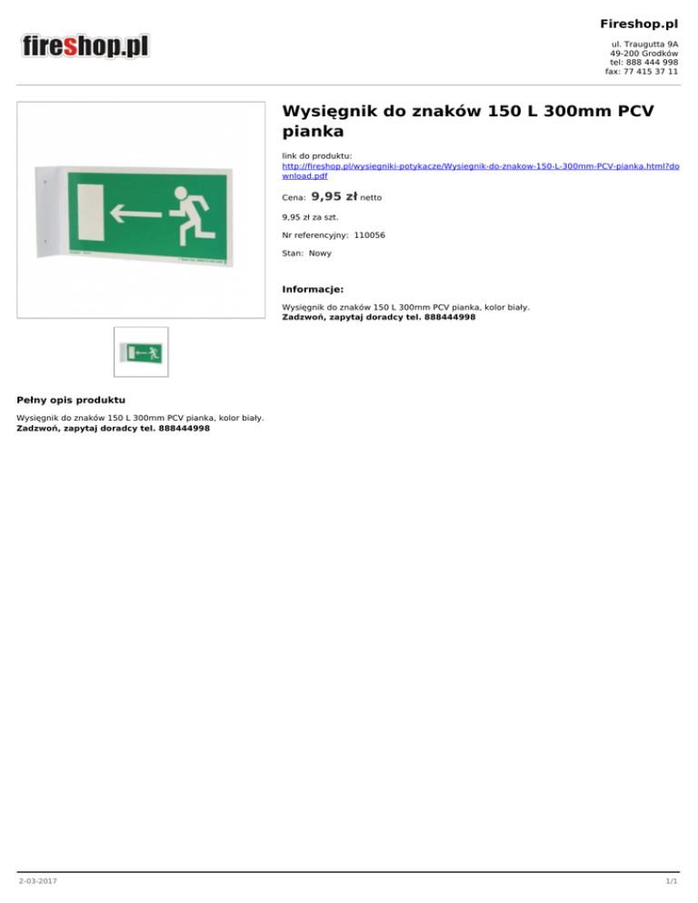 Fireshop.pl ul. Traugutta 9A 49-200 Grodków tel: 888 444 998 fax: 77 415 37 11 Wysięgnik do znaków 150 L 300mm PCV pianka link do produktu: http://fireshop.pl/wysiegniki-potykacze/Wysiegnik-do-znakow-150-L-300mm-PCV-pianka.html?do wnload.pdf Cena: 9,95 zł netto 9,95 zł za szt. Nr referencyjny: 110056 Stan: Nowy Informacje: Wysięgnik do znaków 150 L 300mm PCV pianka, kolor biały. Zadzwoń, zapytaj doradcy tel. 888444998 Pełny opis produktu Wysięgnik do znaków 150 L 300mm PCV pianka, kolor biały. Zadzwoń, zapytaj doradcy tel. 888444998 2-03-2017 1/1