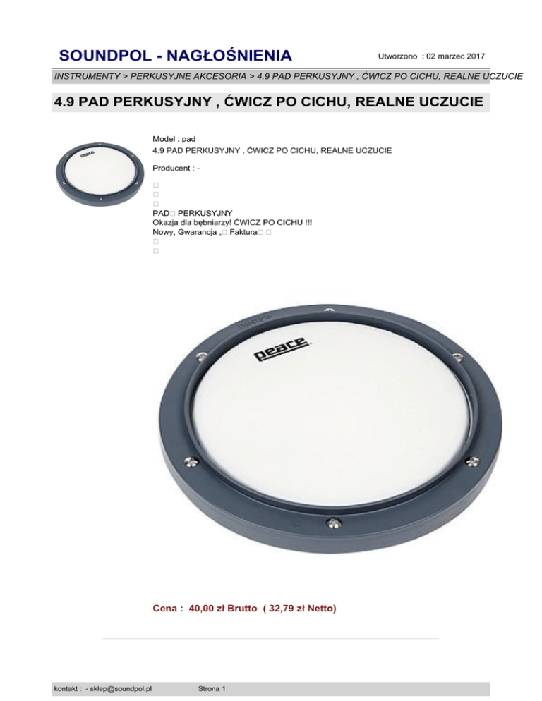 SOUNDPOL - NAGŁOŚNIENIA Utworzono : 02 marzec 2017 INSTRUMENTY > PERKUSYJNE AKCESORIA > 4.9 PAD PERKUSYJNY , ĆWICZ PO CICHU, REALNE UCZUCIE 4.9 PAD PERKUSYJNY , ĆWICZ PO CICHU, REALNE UCZUCIE Model : pad 4.9 PAD PERKUSYJNY , ĆWICZ PO CICHU, REALNE UCZUCIE Producent : � � � PAD�PERKUSYJNY Okazja dla bębniarzy! ĆWICZ PO CICHU !!! Nowy, Gwarancja ,�Faktura�� � � Cena : 40,00 zł Brutto ( 32,79 zł Netto) kontakt : - [email protected] Strona 1 SOUNDPOL - NAGŁOŚNIENIA Utworzono : 02 marzec 2017 INSTRUMENTY > PERKUSYJNE AKCESORIA > 4.9 PAD PERKUSYJNY , ĆWICZ PO CICHU, REALNE UCZUCIE 4.9 PAD PERKUSYJNY , ĆWICZ PO CICHU, REALNE UCZUCIE Dostępność: Produkt dostępny w naszym sklepie od 30 listopad 2010 kontakt : - [email protected] Strona 2