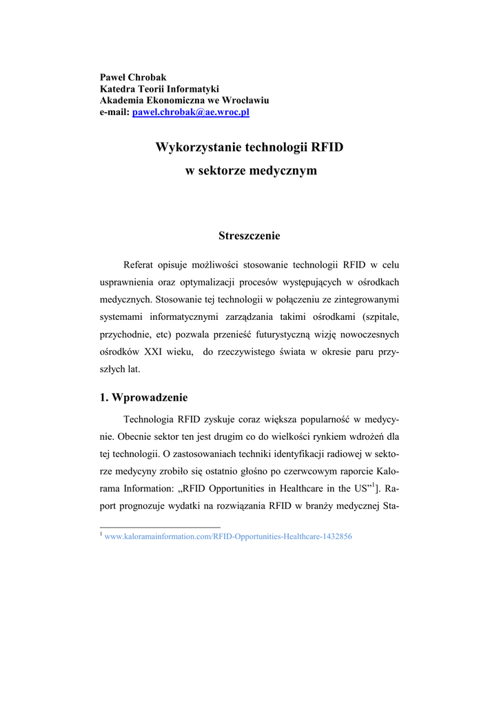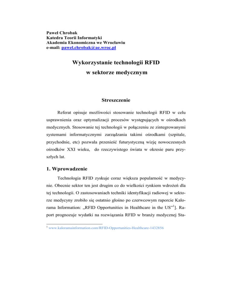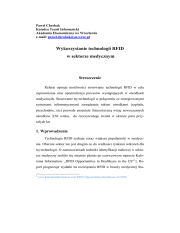 Paweł Chrobak Katedra Teorii Informatyki Akademia Ekonomiczna we Wrocławiu e-mail: [email protected] Wykorzystanie technologii RFID w sektorze medycznym Streszczenie Referat opisuje moŜliwości stosowanie technologii RFID w celu usprawnienia oraz optymalizacji procesów występujących w ośrodkach medycznych. Stosowanie tej technologii w połączeniu ze zintegrowanymi systemami informatycznymi zarządzania takimi ośrodkami (szpitale, przychodnie, etc) pozwala przenieść futurystyczną wizję nowoczesnych ośrodków XXI wieku, do rzeczywistego świata w okresie paru przyszłych lat. 1. Wprowadzenie Technologia RFID zyskuje coraz większa popularność w medycynie. Obecnie sektor ten jest drugim co do wielkości rynkiem wdroŜeń dla tej technologii. O zastosowaniach techniki identyfikacji radiowej w sektorze medycyny zrobiło się ostatnio głośno po czerwcowym raporcie Kalorama Information: „RFID Opportunities in Healthcare in the US”1]. Raport prognozuje wydatki na rozwiązania RFID w branŜy medycznej Sta1 www.kaloramainformation.com/RFID-Opportunities-Healthcare-1432856 nów Zjednoczonych na 297 mln USD w 2007 roku. Kwoty te, według analityków raportu, wzrosną do 1 mld USD w 2010 roku i 3,1 mld USD w 2012 roku. Oznacza to ponad 10-cio krotny wzrost nakładów, przy czym warto wspomnieć, iŜ w ubiegłym roku korporacja IdTechEx oszacowała, iŜ wzrost rozwiązań RFID w światowym sektorze medycznym do kwotę 2,1 biliona USD w 2016 roku2. Techniki RFID zostały ogłoszone przez raport za najbardziej efektywny, dostępny system dla medycyny, która z kolei jest najszybciej rozwijającym sie sektorem na świecie. (ok. 6 bilionów USD w 2005 roku. Raport RFID Opportunities in Healthcare in the US” liczy sobie 240 stron i dostępny jest w cenie 3 995 USD, na stronach korporacji. 2. Rozwinięcie Czym jest technologia RFID Technologia RFID (radio frequency identification) jest rozwinięciem doskonale sprawdzonej technologii kodów paskowych, przy czym do odczytu informacji wykorzystuje się fale radiową zamiast układów optycznych. Tak więc o ile w przypadku odczytu metki z kodem paskowym wymagane jest odpowiednie ustawienie czytnika aby umoŜliwić odczyt informacji z odpowiednio zadrukowanego paska, to w przypadku układów RFID nie jest juŜ wymagany kontakt optyczny między czytnikiem a „Tagiem” (układem przechowującym informacje o obiekcie). Sytuację tę podglądowo przedstawia rysunek 1. 2 www.idtechex.com/products/en/articles/00000487.asp Rysunek 1. Technologie kodów paskowych i RFID Źródło: opracowanie własne na podstawie: http://www.e-health-insider.com/Features/codegate/images/2dbarcode-small.jpg oraz http://www.psqh.com/julsep04/art/rfid.jpg Główną implikacją tej zmiany jest automatyzacja procesu identyfikowania danego obiektu. Wzrasta takŜe odległość z jakiej moŜna dany obiekt zidentyfikować. Obecna technologia umoŜliwia odczyty do jednego a nawet paru metrów. Odpowiednio więc zaprojektowana oraz wdroŜona sieć czytników umoŜliwia pełne śledzenie, oraz zapisywanie pozycji w czasie, obiektów wyposaŜonych w odpowiednie „tagi” na zadanym terenie. Oczywiście obiektem moŜe być tu zarówno pacjent, wyposaŜenie ruchome szpitali czy opakowania z lekami. Technologia RFIF w medycynie Stosowanie technologii RFID w segmencie infrastruktury medycznej moŜe przynieść korzyści w trzech podstawowych obszarach3: 3 www.rfidhealthcare.com/Default.aspx 1. Poprawa zarządzania wyposaŜeniem Choć głównym celem medycyny jest zapewnienie zdrowia pacjentom, waŜna jest takŜe ekonomiczna gospodarka zasobami i minimalizacja kosztów zapewnienia tej opieki. Jednym z istotnych problemów gospodarowania jest kontrola „inwentarza ruchomego”. Według szacunków BlueBean Company4: • Ośrodki medyczne zuŜywają 20-30% więcej swoich zasobów niŜ potrzebują • Pielęgniarki spędzają 10-30% czasu na poszukując wyposaŜenia, narzędzi i innych środków • Serwisowanie sprzętu zajmuje około 8 godzin, gdzie 75% tego czasu zajmuje jego znalezienie • Sprzęt nie jest uŜywany i serwisowany kiedy się tego wymaga • NajwaŜniejsze środki i narzędzia nie mogą być zlokalizowane natychmiastowo • Sprzęt jest gubiony i kradziony Choć podane tu wartości mogą wydawać sie duŜe firmy amerykańskie w swoich ofertach obiecują oszczędności rzędu miliona dolarów po pierwszym roku wdroŜenia dla przeciętnego szpitala posiadającego 500 łóŜek oraz około 3000 sztuk wyposaŜenia ruchomego. Na rysunku 2 pokazano przykładowe zdjęcie aplikacji firmy Hewlett-Packard, pokazujące poglądową historię śledzenia pozycji zadanego przedmiotu. 4 www.rfidheathcare.com/Solutions_Asset.aspx Rysunek 2. Śledzenie inwentarza ruchomego - Aplikacja Hewlett-Packard Źródło: http://www.rmoroz.com/2006Conference/WORKSHOP%20HEALTHCARE.pdf 2. Opieka nad pacjentem Wykorzystanie technik radiowej identyfikacji i śledzenia daje nowe moŜliwości opieki nad pacjentem. Właściwie wykorzystane Tagi identyfikujące pacjenta nie tylko mogą skutecznie uniemoŜliwić pomyłki przy dawkowaniu lekarstw lecz choćby minimalizować czas poszukiwania zagubionego pacjenta w szpitalu. Do podstawowych procesów, które moŜna zoptymalizować wykorzystując techniki RFID naleŜą: • czas i precyzja identyfikowania i zlokalizowania pacjenta • kontrolowanie podawania właściwych leków właściwym pacjentom we właściwych dawkach • automatyzacja zbierania danych o pacjencie (np. wyniki badań lekarskich) • przepływ danych o pacjencie między personelem • bezpieczeństwo dzieci i pacjentów cierpiących na zaburzenia pamięci • integracja wiedzy o pacjencie • automatyzacja procesu zapisywania informacji o wynikach badań pacjenta • eliminowanie błędu ludzkiego 3. Kontrola zaopatrzenia i dostaw Programy pilotaŜowe RFID w sektorze sprzedaŜy detalicznej pokazują, iŜ moŜliwa jest optymalizacja procesu logistycznego w zakresie dostarczania produ
