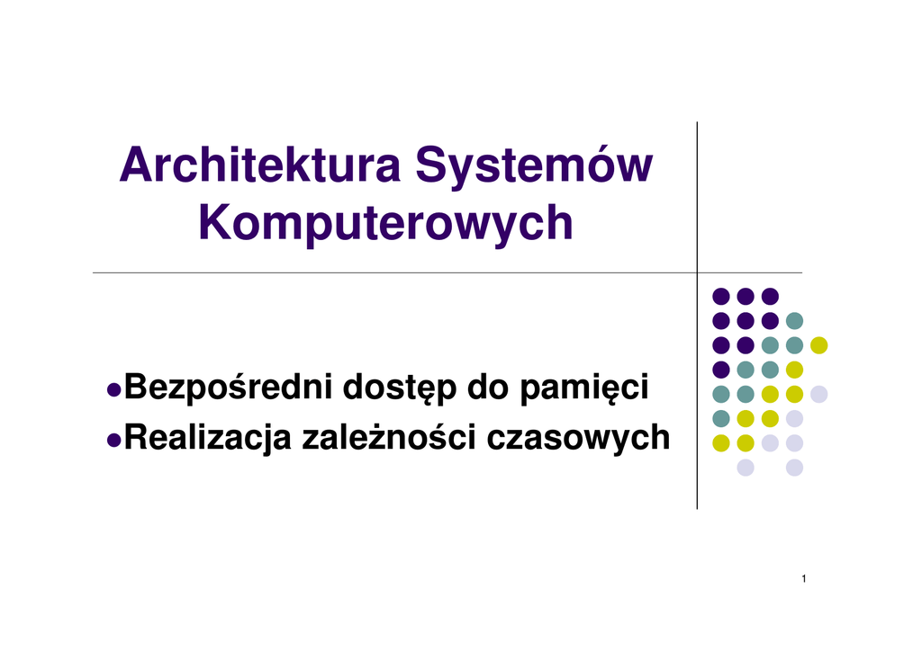 Architektura Systemów Komputerowych Bezpośredni dostęp do pamięci Realizacja zależności czasowych 1 Bezpośredni dostęp do pamięci Bezpośredni dostęp do pamięci (ang: direct memory access - DMA) to transfer danych pomiędzy pamięcią systemu mikroprocesorowego i urządzeniem peryferyjnym bez udziału mikroprocesora Tego typu transfer musi być realizowany przez samodzielną jednostkę, przejmującą od mikroprocesora sterowanie magistralami mikrokomputera – kontroler DMA 2 Bezpośredni dostęp do pamięci – architektura Magistrala danych Magistrala adresowa Mikroprocesor HRQ HLDA Magistrala sterująca IOR IOW MEMR MEMW Kontroler DMA DREQ DACK Pamięć Układy wejścia – wyjścia 3 Bezpośredni dostęp do pamięci Cechy: Transfer danych odbywa się na żądanie urządzenia I/O w tzw. kanale DMA Kontroler DMA wytwarza adresy komórek pamięci i sygnały odczytu/zapisu zarówno dla pamięci jak i urządzenia I/O Transfer pojedynczego słowa odbywa się w jednym cyklu dostępu do pamięci Podczas transferu DMA mikroprocesor może wykonywać program z wewnętrznej pamięci podręcznej (CACHE) 4 Bezpośredni dostęp do pamięci Zalety: Transfer pojedynczego słowa jest dwa razy szybszy, niż z udziałem mikroprocesora, gdyż nie wymaga dwóch dostępów do pamięci Transmisja w trybie DMA przynosi znaczącą oszczędność czasu w przypadku przesyłania większych bloków danych 5 Bezpośredni dostęp do pamięci: transfer pamięć - I/O Magistrala danych Magistrala adresowa WR DREQ DACK RD IOR IOW MEMR MEMW Kontroler DMA Pamięć Układy wejścia – wyjścia 6 Bezpośredni dostęp do pamięci: transfer I/O - pamięć Magistrala danych Magistrala adresowa RD DREQ DACK WR IOR IOW MEMR MEMW Kontroler DMA Pamięć Układy wejścia – wyjścia 7 Bezpośredni dostęp do pamięci Cykl: otwarcie kanału DMA, transfer, zamknięcie Urządzenie I/O zgłasza żądanie transferu danych kontrolerowi DMA sygnałem DREQ Kontroler DMA żąda zwolnienia magistral przez mikroprocesor sygnałem HRQ Mikroprocesor zwalnia magistrale i informuje o tym kontroler sygnałem HLDA Kontroler DMA potwierdza otwarcie kanału DMA sygnałem DACK Kontroler DMA steruje przesłaniem bloku danych pomiędzy pamięcią i urządzeniem I/O Kontroler zamyka kanał przez zwolnienie sygnałów HOLD i DACK po przesłaniu założonego bloku danych lub zwolnieniu DREQ 8 Kontroler DMA Cechy kontrolera DMA: Kontroler DMA jest samodzielnym procesorem mogącym przejąć sterowanie magistral systemu mikroprocesorowego. Kontroler DMA zazwyczaj posiada zwielokrotnione zasoby pozwalające na realizację kilku kanałów DMA o różnym priorytecie. Każdy kanał jest obsługiwany przez oddzielną, wewnętrzną logikę w kontrolerze połączoną z rejestrem adresującym pamięć i licznikiem słów pozostałych do przesłania. 9 Kontroler DMA Cechy kontrolera DMA, cd: Kontroler jest układem programowalnym, pozwala na zaprogramowanie: - początkowego adresu bloku danych w pamięci - wielkości transferowanego bloku danych – liczby słów - trybu transmisji - priorytetu kanału DMA Programowanie kontrolera DMA jest realizowane przez mikroprocesor i polega na zapisaniu odpowiednich wartości do jego wewnętrznych rejestrów, widzianych jako rejestry w przestrzeni I/O. 10 Kontroler DMA Schemat blokowy IOR IOW MEMR MEMW Kontroler DMA DREQ0 DACK0 D A DREQ1 DACK2 … HRQ HLDA DREQn DACKn 11 Kontroler DMA – symbol i logika kontrolera 8237 12 Kontroler DMA – tryby pracy Tryby pracy na przykładzie kontrolera Intel82C37 Idle – brak transferu, obserwacja linii DREQ Single – wykonanie pojedynczego przesłania po każdym zgłoszeniu przerwania Block – przesłanie bloku danych aż do wyzerowania licznika słów Demand – tryb podobny do Block, ale przerywany zaniknięciem sygnału DRQ albo zgłoszeniem o wyższym priorytecie Cascade – tryb używany przez kontroler podrzędny w kaskadowym połączeniu kontrolerów Verify – wewnętrzna diagnostyka układu 13 Przykład współpracy kontrolera DMA z kontrolerem dźwięku Magistrala danych Magistrala adresowa Dane dźwiękowe WR RD IOR IOW MEMR MEMW Kontroler DMA Pamięć Kontroler dźwięku Bufor DREQ DACK DAC 14 Realizacja zależności czasowych – układ czasowy Zadania układu czasowego: Generowanie precyzyjnych opóźnień czasowych Generowanie sygnałów o zadanej częstotliwości Historyczne wykorzystanie: - inicjalizacja cyklu odświeżania pamięci DRAM - realizacja zegara czasu rzeczywistego Generowanie sygnału PWM (realizowane w mikrokontrolerach do sterowania urządzeniami) 15 Realizacja zależności czasowych – układ czasowy Cechy układu czasowego: Zawiera zbiór liczników taktowanych sygnałem zegarowym pochodzącym z zewnętrznego źródła lub wewnętrznego oscylatora Zazwyczaj zapewnia różne tryby zliczania: NBC, BCD, w górę, w dół Jest układem programowalnym, pozwala na: - wybór źródła sygnału zegarowego i ew. podziału preskalera - zaprogramowanie stanu początkowego liczników - konfigurację trybu pracy liczników 16 Przykład układu czasowego Widok i schemat blokowy układu Intel82C54 17 Przykładowe zastosowanie układu czasowego Generowanie sygnału dźwiękowego o zaprogramowanej częstotliwości dla głośnika systemowego w komputerze klasy PC Filtr dolnoprzepustowy Wzmacniacz audio 18