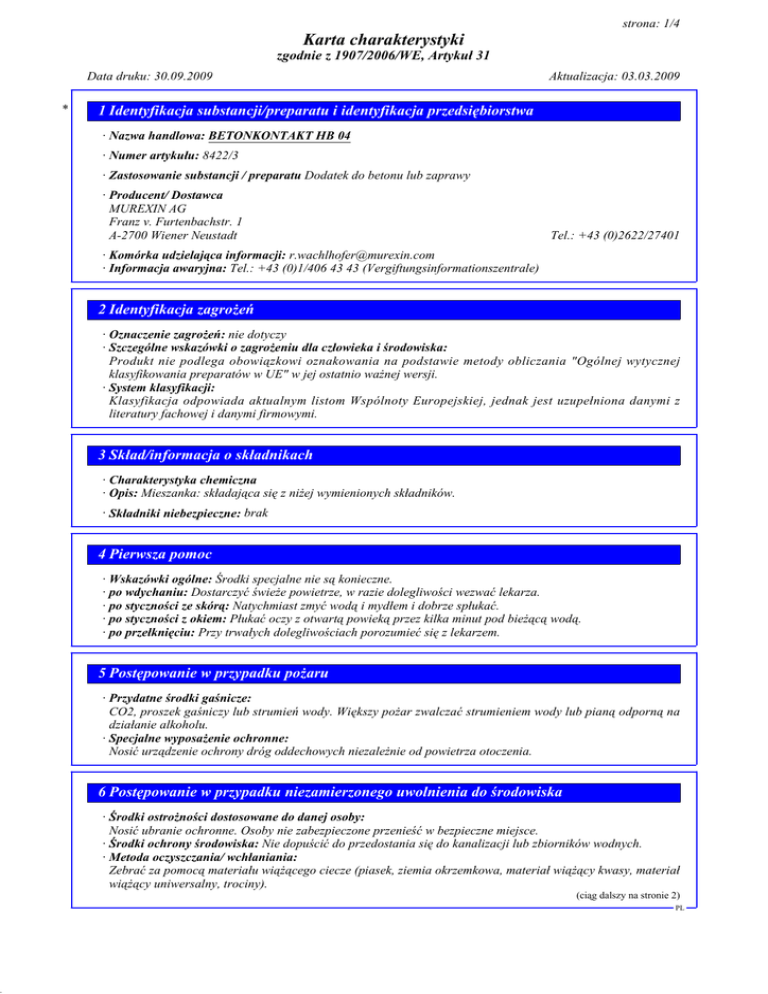 DR strona: 1/4 Karta charakterystyki zgodnie z 1907/2006/WE, Artykuł 31 Data druku: 30.09.2009 * Aktualizacja: 03.03.2009 1 Identyfikacja substancji/preparatu i identyfikacja przedsiębiorstwa · Nazwa handlowa: BETONKONTAKT HB 04 · Numer artykułu: 8422/3 · Zastosowanie substancji / preparatu Dodatek do betonu lub zaprawy · Producent/ Dostawca MUREXIN AG Franz v. Furtenbachstr. 1 A-2700 Wiener Neustadt Tel.: +43 (0)2622/27401 · Komórka udzielająca informacji: [email protected] · Informacja awaryjna: Tel.: +43 (0)1/406 43 43 (Vergiftungsinformationszentrale) 2 Identyfikacja zagrożeń · Oznaczenie zagrożeń: nie dotyczy · Szczególne wskazówki o zagrożeniu dla człowieka i środowiska: Produkt nie podlega obowiązkowi oznakowania na podstawie metody obliczania "Ogólnej wytycznej klasyfikowania preparatów w UE" w jej ostatnio ważnej wersji. · System klasyfikacji: Klasyfikacja odpowiada aktualnym listom Wspólnoty Europejskiej, jednak jest uzupełniona danymi z literatury fachowej i danymi firmowymi. 3 Skład/informacja o składnikach · Charakterystyka chemiczna · Opis: Mieszanka: składająca się z niżej wymienionych składników. · Składniki niebezpieczne: brak 4 Pierwsza pomoc · Wskazówki ogólne: Środki specjalne nie są konieczne. · po wdychaniu: Dostarczyć świeże powietrze, w razie dolegliwości wezwać lekarza. · po styczności ze skórą: Natychmiast zmyć wodą i mydłem i dobrze spłukać. · po styczności z okiem: Płukać oczy z otwartą powieką przez kilka minut pod bieżącą wodą. · po przełknięciu: Przy trwałych dolegliwościach porozumieć się z lekarzem. 5 Postępowanie w przypadku pożaru · Przydatne środki gaśnicze: CO2, proszek gaśniczy lub strumień wody. Większy pożar zwalczać strumieniem wody lub pianą odporną na działanie alkoholu. · Specjalne wyposażenie ochronne: Nosić urządzenie ochrony dróg oddechowych niezależnie od powietrza otoczenia. 6 Postępowanie w przypadku niezamierzonego uwolnienia do środowiska · Środki ostrożności dostosowane do danej osoby: Nosić ubranie ochronne. Osoby nie zabezpieczone przenieść w bezpieczne miejsce. · Środki ochrony środowiska: Nie dopuścić do przedostania się do kanalizacji lub zbiorników wodnych. · Metoda oczyszczania/ wchłaniania: Zebrać za pomocą materiału wiążącego ciecze (piasek, ziemia okrzemkowa, materiał wiążący kwasy, materiał wiążący uniwersalny, trociny). (ciąg dalszy na stronie 2) PL DR strona: 2/4 Karta charakterystyki zgodnie z 1907/2006/WE, Artykuł 31 Data druku: 30.09.2009 Aktualizacja: 03.03.2009 Nazwa handlowa: BETONKONTAKT HB 04 (ciąg dalszy od strony 1) · Wskazówki dodatkowe: Nie powstają żadne materiały niebezpieczne. 7 Postępowanie z substancją/preparatem i jej/jego magazynowanie · Sposób obchodzenia się: · Wskazówki dla bezpiecznego użytkowania: Środki specjalne nie są konieczne. · Wskazówki dla ochrony przeciwpożarowej i przeciwwybuchowej: Nie są potrzebne szczególne zabiegi. · Składowanie: · Wymagania w stosunku do pomieszczeń składowych i zbiorników: Przechowywać tylko w oryginalnych beczkach. · Wskazówki odnośnie wspólnego składowania: nie konieczne · Dalsze wskazówki odnośnie warunków składowania: Zbiornik trzymać szczelnie zamknięty. Chronić przed mrozem. * 8 Kontrola narażenia i środki ochrony indywidualnej · Dodatkowe wskazówki dla wykonania urządzeń technicznych: Brak dalszych danych, patrz punkt 7. · Składniki wraz z kontrolowanymi wartościami granicznymi zależnymi od miejsca pracy: Produkt nie zawiera znaczących ilości materiałów, których wartości graniczne musiałyby być kontrolowane pod kątem warunków miejsca pracy. · Wskazówki dodatkowe: Podstawą były aktualnie obowiązujące wykazy. · Osobiste wyposażenie ochronne: · Ogólne środki ochrony i higieny: Trzymać z dala od środków spożywczych napojów i pasz. Zabrudzoną, nasączoną odzież natychmiast zdjąć. Myć ręce przed przerwą i przed końcem pracy. · Ochrona dróg oddechowych: Nie konieczne przy dobrej wentylacji pomieszczenia. · Ochrona rąk: Rękawice ochronne. · Materiał, z którego wykonane są rękawice Wybór odpowiednich rękawic nie zależy tylko od materiału, lecz także od innych cech jakościowych i zmienia się od producenta do producenta. Ponieważ produkt jest preparatem składającym się z kilku substancji, to odporności materiałów, z których wykonano rękawice nie można wcześniej wyliczyć i dlatego też musi być ona sprawdzona przed zastosowaniem. · Czas penetracji dla materiału, z którego wykonane są rękawice Od producenta rękawic należy uzyskać informację na temat dokładnego czasu przebicia i go przestrzegać. · Ochrona oczu: Okulary ochronne zalecane podczas napełniania. · Ochrona ciała: Robocza odzież ochronna. 9 Właściwości fizyczne i chemiczne · Ogólne dane Forma: Kolor: Zapach: płynny różowy łagodny · Zmiana stanu Punkt topnienia/ Zakres topnienia: nie jest określony 100°C Punkt wrzenia/ Zakres wrzenia: · Punkt zapłonu: n.a. °C · Temperatura palenia się: n.a. °C (ciąg dalszy na stronie 3) PL DR strona: 3/4 Karta charakterystyki zgodnie z 1907/2006/WE, Artykuł 31 Data druku: 30.09.2009 Aktualizacja: 03.03.2009 Nazwa handlowa: BETONKONTAKT HB 04 (ciąg dalszy od strony 2) · Samozapłon: Produkt nie jest samozapalny. · Niebezpieczeństwo wybuchu: Produkt nie jest grozi wybuchem. · Granice niebezpieczeństwa wybuchu: n.a. Vol % dolna: n.a. Vol % górna: · Gęstość w 20°C: 1,4 g/cm3 · Rozpuszczalność w/ mieszalność z Woda: rozpuszczalny · Wartość pH w 20°C: 6,0-7,0 · Lepkość: dynamiczna w 20°C: 20-25 mPas 10 Stabilność i reaktywność · Reakcje niebezpieczne Reakcje niebezpieczne nie są znane. · Niebezpieczne produkty rozkładu: - 11 Informacje toksykologiczne · Ostra toksyczność: · Pierwotne działanie drażniące: Działanie Gatunek Metoda · na skórze: Brak działania drażniąc