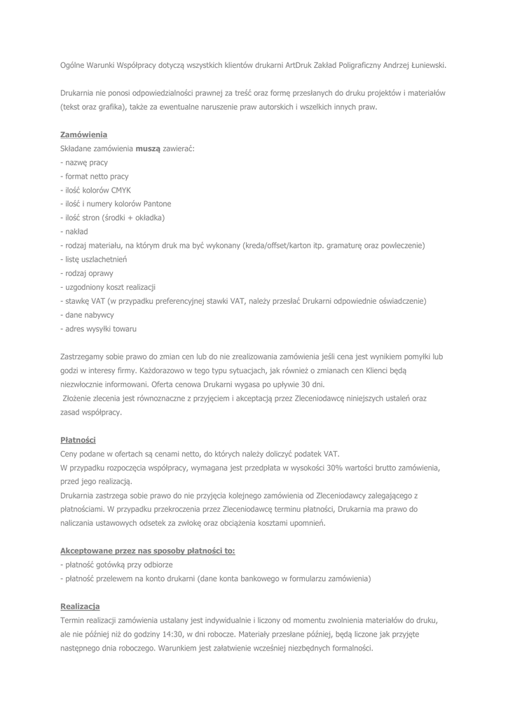 Ogólne Warunki Współpracy dotyczą wszystkich klientów drukarni ArtDruk Zakład Poligraficzny Andrzej Łuniewski. Drukarnia nie ponosi odpowiedzialności prawnej za treść oraz formę przesłanych do druku projektów i materiałów (tekst oraz grafika), także za ewentualne naruszenie praw autorskich i wszelkich innych praw. Zamówienia Składane zamówienia muszą zawierać: - nazwę pracy - format netto pracy - ilość kolorów CMYK - ilość i numery kolorów Pantone - ilość stron (środki + okładka) - nakład - rodzaj materiału, na którym druk ma być wykonany (kreda/offset/karton itp. gramaturę oraz powleczenie) - listę uszlachetnień - rodzaj oprawy - uzgodniony koszt realizacji - stawkę VAT (w przypadku preferencyjnej stawki VAT, należy przesłać Drukarni odpowiednie oświadczenie) - dane nabywcy - adres wysyłki towaru Zastrzegamy sobie prawo do zmian cen lub do nie zrealizowania zamówienia jeśli cena jest wynikiem pomyłki lub godzi w interesy firmy. Każdorazowo w tego typu sytuacjach, jak również o zmianach cen Klienci będą niezwłocznie informowani. Oferta cenowa Drukarni wygasa po upływie 30 dni. Złożenie zlecenia jest równoznaczne z przyjęciem i akceptacją przez Zleceniodawcę niniejszych ustaleń oraz zasad współpracy. Płatności Ceny podane w ofertach są cenami netto, do których należy doliczyć podatek VAT. W przypadku rozpoczęcia współpracy, wymagana jest przedpłata w wysokości 30% wartości brutto zamówienia, przed jego realizacją. Drukarnia zastrzega sobie prawo do nie przyjęcia kolejnego zamówienia od Zleceniodawcy zalegającego z płatnościami. W przypadku przekroczenia przez Zleceniodawcę terminu płatności, Drukarnia ma prawo do naliczania ustawowych odsetek za zwłokę oraz obciążenia kosztami upomnień. Akceptowane przez nas sposoby płatności to: - płatność gotówką przy odbiorze - płatność przelewem na konto drukarni (dane konta bankowego w formularzu zamówienia) Realizacja Termin realizacji zamówienia ustalany jest indywidualnie i liczony od momentu zwolnienia materiałów do druku, ale nie później niż do godziny 14:30, w dni robocze. Materiały przesłane później, będą liczone jak przyjęte następnego dnia roboczego. Warunkiem jest załatwienie wcześniej niezbędnych formalności. W przypadku rozpoczęcia współpracy, zamówienie powinno zostać nadesłane min. 2 dni przed wysłaniem plików. Rozdzielnik/lista wysyłkowa powinny być przesłane min 2 dni przed planowanym terminem spedycji. Wprowadzenie wszelkiego rodzaju zmian (np. zmiana jakichkolwiek parametrów pracy tj. rodzaju papieru, wymiaru, sposobu obróbki introligatorskiej, zmiana miejsca lub sposobu dostawy i innych odbiegających od pierwotnie złożonego zamówienia), w momencie rozpoczęcia produkcji, będzie skutkowało wydłużeniem terminu realizacji. Wprowadzenie takich zmian może być objęte dodatkowymi kosztami. W przypadku gdy klient nie akceptuje dodatkowych kosztów, zamówienie jest realizowane w pierwotnym brzmieniu. W szczególnych przypadkach drukarnia może odmówić realizacji zlecenia, bez podania przyczyn po zapoznaniu się z projektem bądź szczegółami zlecenia, nie później niż na drugi dzień od momentu otrzymania zamówienia. Terminy realizacji zamówień podawane są w dniach roboczych. Wprowadzenie jakichkolwiek zmian do zamówienia przyjętego do realizacji, każdorazowo musi potwierdzić zleceniodawca pisemnie lub drogą e-mailową. Drukarnia ArtDruk nie ponosi odpowiedzialności za opóźnienia w realizacji wynikłe z przyczyn niezależnych od wykonawcy. W każdym przypadku wystąpienia opóźnień w realizacji Klient zostanie niezwłocznie poinformowany. Reklamacje Drukarnia ArtDruk Zakład Poligraficzny Andrzej Łuniewski nie ponosi odpowiedzialności za ewentualne uszkodzenia, zagubienia lub opóźnienia przesyłek podczas transportu w przypadku gdy wysyłka realizowana jest za pośrednictwem Poczty Polskiej lub firmy kurierskiej. Reklamacje dotyczące uszkodzeń przesyłek w transporcie należy zgłosić kurierowi w momencie odbioru towarów. Osoba odbierająca jest zobowiązana sporządzić protokół reklamacyjny w obecności pracownika firmy kurierskiej i niezwłocznie powiadomić pisemnie o tym zdarzeniu drukarnię. Reklamacje nie spełniające powyższej procedury nie będą uwzględniane. Decyzje w sprawie zakresu oraz wymiaru reklamacji dotyczących przesyłek zależą wyłącznie od firmy kurierskiej. Jeśli powodem reklamacji są różnice w kolorze otrzymanego produktu, warunkiem podstawowym dochodzenia reklamacji jest porównanie wydrukowanej pracy certyfikowanym wydrukiem próbnym, który możemy wykonać na zlecenie klienta przed drukiem (koszt 1szt proofa A4 – 40 zł netto), lub który powinien być przesłany przez klienta do drukarni, obowiązkowo przed drukiem. Reklamacje dotyczące jakości produktów bądź usług należy zgłaszać do 14 dni od dnia dostawy, pisemnie osobiście, faksem lub pocztą, podając szczegółowy opis wady oraz numer faktury. W terminie do 7 dni od zgłoszenia reklamacji, na adres siedziby drukarni należy dostarczyć 100% reklamowanego nakładu. Przekroczenie podanych wyżej terminów będzie skutkowało automatycznym odrzuceniem reklamacji. Zamawiający składając zamówienie potwierdza, iż udostępniając Drukarni ArtDruk Zakład Poligraficzny Andrzej Łuniewski materiały potrzebne do realizacji zlecenia nie narusza postanowień Ustawy z dnia 4 lutego 1994 r. o prawie autorskim i prawach pokrewnych (DZ. U. z 2006 r. Nr 90, poz. 631 z późn. zm.). Wszelką odpowiedzialność za niezgodność przekazanych materiałów z podaną ustawą ponosi Zamawiający. Obustronna umowa Drukarni z Klientem może zmienić poszczególne postanowienia niniejszych Ogólnych Warunków Współpracy, ale we wszystkich kwestiach nieuregulowanych umową obustronną obowiązują niniejsze Ogólne Warunki Współpracy