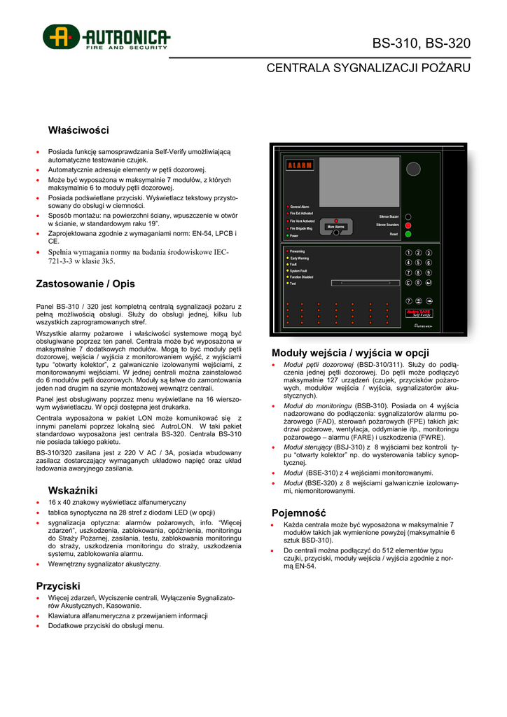 BS-310, BS-320 CENTRALA SYGNALIZACJI POŻARU Właściwości • • • • • • • Posiada funkcję samosprawdzania Self-Verify umożliwiającą automatyczne testowanie czujek. Automatycznie adresuje elementy w pętli dozorowej. Może być wyposażona w maksymalnie 7 modułów, z których maksymalnie 6 to moduły pętli dozorowej. Posiada podświetlane przyciski. Wyświetlacz tekstowy przystosowany do obsługi w ciemności. Sposób montażu: na powierzchni ściany, wpuszczenie w otwór w ścianie, w standardowym raku 19”. Zaprojektowana zgodnie z wymaganiami norm: EN-54, LPCB i CE. ALARM General Alarm Fire Ext Activated Fire Brigade Msg Power Spełnia wymagania normy na badania środowiskowe IEC721-3-3 w klasie 3k5. Prewarning Early Warning Fault System Fault Function Disabled Zastosowanie / Opis Test Panel jest obsługiwany poprzez menu wyświetlane na 16 wierszowym wyświetlaczu. W opcji dostępna jest drukarka. Centrala wyposażona w pakiet LON może komunikować się z innymi panelami poprzez lokalną sieć AutroLON. W taki pakiet standardowo wyposażona jest centrala BS-320. Centrala BS-310 nie posiada takiego pakietu. BS-310/320 zasilana jest z 220 V AC / 3A, posiada wbudowany zasilacz dostarczający wymaganych układowo napięć oraz układ ładowania awaryjnego zasilania. Wskaźniki • • • • 16 x 40 znakowy wyświetlacz alfanumeryczny tablica synoptyczna na 28 stref z diodami LED (w opcji) sygnalizacja optyczna: alarmów pożarowych, info. “Więcej zdarzeń”, uszkodzenia, zablokowania, opóźnienia, monitoringu do Straży Pożarnej, zasilania, testu, zablokowania monitoringu do straży, uszkodzenia monitoringu do straży, uszkodzenia systemu, zablokowania alarmu. Wewnętrzny sygnalizator akustyczny. Przyciski • • • Więcej zdarzeń, Wyciszenie centrali, Wyłączenie Sygnalizatorów Akustycznych, Kasowanie. Klawiatura alfanumeryczna z przewijaniem informacji Dodatkowe przyciski do obsługi menu. More Alarms Silence Sounders Reset 1 2 3 4 5 6 7 8 9 C 0 ? Panel BS-310 / 320 jest kompletną centralą sygnalizacji pożaru z pełną możliwością obsługi. Służy do obsługi jednej, kilku lub wszystkich zaprogramowanych stref. Wszystkie alarmy pożarowe i właściwości systemowe mogą być obsługiwane poprzez ten panel. Centrala może być wyposażona w maksymalnie 7 dodatkowych modułów. Mogą to być moduły pętli dozorowej, wejścia / wyjścia z monitorowaniem wyjść, z wyjściami typu “otwarty kolektor”, z galwanicznie izolowanymi wejściami, z monitorowanymi wejściami. W jednej centrali można zainstalować do 6 modułów pętli dozorowych. Moduły są łatwe do zamontowania jeden nad drugim na szynie montażowej wewnątrz centrali. Silence Buzzer Fire Vent Activated Self Verify Moduły wejścia / wyjścia w opcji • • • • • Moduł pętli dozorowej (BSD-310/311). Służy do podłączenia jednej pętli dozorowej. Do pętli może podłączyć maksymalnie 127 urządzeń (czujek, przycisków pożarowych, modułów wejścia / wyjścia, sygnalizatorów akustycznych). Moduł do monitoringu (BSB-310). Posiada on 4 wyjścia nadzorowane do podłączenia: sygnalizatorów alarmu pożarowego (FAD), sterowań pożarowych (FPE) takich jak: drzwi pożarowe, wentylacja, oddymianie itp., monitoringu pożarowego – alarmu (FARE) i uszkodzenia (FWRE). Moduł sterujący (BSJ-310) z 8 wyjściami bez kontroli typu “otwarty kolektor” np. do wysterowania tablicy synoptycznej. Moduł (BSE-310) z 4 wejściami monitorowanymi. Moduł (BSE-320) z 8 wejściami galwanicznie izolowanymi, niemonitorowanymi. Pojemność • • Każda centrala może być wyposażona w maksymalnie 7 modułów takich jak wymienione powyżej (maksymalnie 6 sztuk BSD-310). Do centrali można podłączyć do 512 elementów typu czujki, przyciski, moduły wejścia / wyjścia zgodnie z normą EN-54. Centrala sygnalizacji pożaru, BS-310 / 320 Wymiary Dane techniczne 350x350x194 Wymiary (mm) (bez modułów i akumulatorów) 8,5 kg Waga Obudowa metalowa, front ABS/PC Rodzaj materiału Naścienny lub wpuszczany Montaż IEC-529 / IP30 Stopień ochrony obudowy -5 to +40 °C Zakres temperatur pracy 230V AC +10% / -15% Częstotliwość: 44 - 440Hz lub 24V DC Zasilanie 250mA przy 27V DC (bez podłączonych modułów wejścia / wyjścia) Pobór prądu Ilość pakietów Maksymalnie 7 (kombinacja BSD-310, BSB-310, BSE-310/320 i BSJ-310) Ilość pakietów pętli dozorowej Maksymalnie 6 BSD-310 2 x 12 V = 24 V Zasilanie awaryjne Podłączanie czujek Poprzez pakiet BSD-310 Podłączanie sygnałów wejściowych Poprzez pakiet BSE-310 i BSE-320 Podłączanie sygnałów wyjściowych Poprzez pakiet BSB-310 i BSJ-310 Sieć AutroLON (tylko BS-320) AutroCom / Ethernet lub port szeregowy Komunikacja System System samodzielny bez pakietu LON. Centrala BS-310. Zamawianie A L A RM Fire ext.. acktivated Silence buzzer Fire vent. activ. Fire Brig. recvd. Silence sounders More Alarms Reset Power Prewarning 1 Earlywarning 4 Fault System fault 7 Function disabled C Test 2 3 5 6 8 9 0 ? Self Verify Kod produktu Opis BS-310/- Centrala BS-320/- Centrala Autronica KNUS GLASSE T TRYKK H ER PRES S H ER E BREAK G LASS Autronica Opcje: BSD-310/311 Moduł pętli dozorowej BSB-310 Moduł z 4 wyjściami monitorowanymi BSJ-310 Moduł sterujący z 8 wyjściami otwarty kolektor bez monitorowania BSE-310 Moduł 4 wejść monitorowanych BSE-320 Moduł 8 wejść niemonitorowanych z izolacją galwaniczną System paneli podłączonych do sieci LON. Centrala BS-320. AutroLON Centrala AL ARM AL ARM Fire ext .. ackt ivated Silen ce bu zzer Fire vent . act iv . Mo re. Alarm s Silen ce sounde rs Fire Brig . recvd Re set Pow er Prew arn ing Early w arning Fau lt Sy stem f au lt Fu nct ion d isab led Te st 1 2 3 4 5 6 7 8 9 C 0 Fire ext .. ackt ivated Silen ce bu zzer Fire vent . act iv . Mo re. Alarm s Silen ce sounde rs Fire Brig . recvd Re set Pow er Prew arn ing Early w arning Fau lt Sy stem f au lt Fu nct ion d isab led Te st Pow er Fau lt 