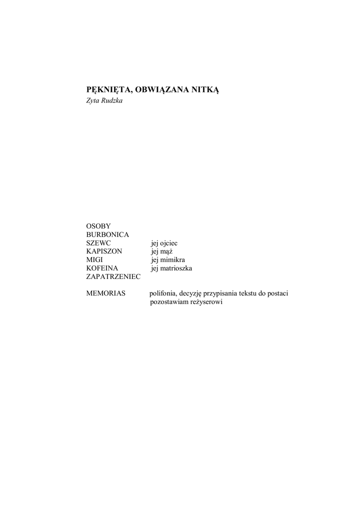 PĘKNIĘTA, OBWIĄZANA NITKĄ Zyta Rudzka OSOBY BURBONICA SZEWC KAPISZON MIGI KOFEINA ZAPATRZENIEC MEMORIAS jej ojciec jej mąż jej mimikra jej matrioszka polifonia, decyzję przypisania tekstu do postaci pozostawiam reżyserowi 1 MEMORIAS Lot tej kuli od początku doskonały najpierw przez chłopca potem w szybę do sklepu w syfon krew ze mnie krew krew po twarzy nie widziałam jak tego małego na drzwiach przez miasto krew krzyczałam zdzielili darłam się jeszcze raz w mordę w mordę we mnie krew krew po twarzy proszę bardzo proszę dotknąć ponad prawym okiem kuliste zgrubienie doskonale zachowany nabój może ktoś z państwa bardzo proszę można palec przyłożyć kula przysięgam to od niej Janek Wiśniewski padł 2 BURBONICA Ulga SZEWC Ulga KAPISZON Jaka ulga SZEWC Teraz mogę umrzeć 2 BURBONICA Zaraz umrzeć. Drzemka wystarczy, w nocy chodzisz, w dzień chodzisz. SZEWC Dziesięć lat. Noc w noc. Od parapetu do parapetu. BURBONICA List przyszedł, sen przyjdzie KAPISZON No i mamy happy end. SZEWC Co znowu? BURBONICA Szczęśliwe zakończenie, tato, happy end. SZEWC Przecież wiem. Jeszcze coś pamiętam z francuskiego BURBONICA Ulga KAPISZON Masz coś na gorąco? BURBONICA Nie jadłeś obiadu? KAPISZON Taki happy end, aż się jeść chce BURBONICA Gdybym wiedziała, że zaraz przyjdziesz. KAPISZON Ślubne filiżanki… BURBONICA Pamiętasz… Nie jak facet… SZEWC Od herbaty schną piersi KAPISZON W pięty idzie, a głodu nie zabije BURBONICA Gdybyś się zapowiedział. SZEWC Dałaby mi na kino. KAPISZON Ale, że się odezwał… BURBONICA Ważne, że jest. Jest… KAPISZON No już dobrze, dobrze. Nie będziemy płakać. BURBONICA Nie będziemy. KAPISZON Co u ciebie? BURBONICA Mam wszystko. Wrzody. Nadciśnienie. 3 KAPISZON A ja szumy w uszach. Wysypka na kostkach. A na froncie jak ręką odjął. Wyobrażasz sobie? Świst, pisk, a ja zdjęcie za zdjęciem. BURBONICA Nasz fotograf na wojnie był, słyszy ojciec. SZEWC No i jak? Dużo koni padło? BURBONICA Opowiedz… chociaż trochę… Nie daj się prosić. KAPISZON Przez moje ciało przeszedł front każdej współczesnej wojny. No czego się śmiejecie? Z czego? BURBONICA Bo tak to… jak komendę SZEWC Obraził się. BURBONICA No co ty, Kapiszon. Kapiszon. KAPISZON Tak łatwo się nie obrażam. Szczególnie na teścia. No jak? Forma bojowa? Jakaś dama na horyzoncie? SZEWC Takie miłości jak kawa bez kofeiny. KAPISZON Ważne, że marzenia jeszcze są. Są? SZEWC A są. KAPISZON No to o czym marzy nasz senior rodu? SZEWC Przed śmiercią popaćkać Murzynkę. BURBONICA Papa lubi teraz udawać degenerata. KAPISZON Degenerat w stanie spoczynku. A ja zbieram kamizelki kuloodporne. Już dwanaście. Dla niego. BURBONICA Po co mu te kuloodporne? KAPISZON Po co? Prezent od ojca. BURBONICA I już go chcesz na wojnę. Ledwo się odnalazł, już na wojnę. SZEWC Jeszcze się nie odnalazł. Dopiero list przysłał. KAPISZON Lubił żołnierzyki. 4 BURBONICA Jak ten list przyszedł …nie mogłam otworzyć…Dopiero po godzinie. KAPISZON Dobrze rżnie partyzanta SZEWC Mój wnuk, moja krew KAPISZON Partyzant nie w ciemię. BURBONICA Ulga… prawda… taka ulga. Nie można było… Tego czekania. KAPISZON Ulga. SZEWC Ulga. KAPISZON Życie po bólu. BURBONICA Ładnie powiedziałeś. Po bólu… Myślałam… już nic z nas nie pamiętam…. Ale jak tylko wszedłeś… Wszystko… KAPISZON Ciekawy jestem, jak on wygląda? Te programy do postarzania… podobno do niczego. BURBONICA List przysłał, to i zdjęć się doczekamy. KAPISZON Oby wcześniej niż za dziesięć latek BURBONICA Ojciec nie chce spać? SZEWC A co mam w dzień? Bo ten twój chce być z tobą szczęśliwy jak barani ogon. BURBONICA Sam widzisz. KAPISZON To co, zrobisz coś? BURBONICA Nie potrafię ugościć. KAPISZON Zadzwonię po pizzę. 3 ZAPATRZENIEC Czy ja wiem… Takie sobie. SZEWC Jak mówię ładne, to ładne ZAPATRZENIEC Zwykłe 5 SZEWC Porządne, za kostkę ZAPATRZENIEC Za kostkę. SZEWC Szyte, sznurowane. ZAPATRZENIEC Być może SZEWC Na pewno. Nie klejone. Widać. Skóra. Na fest zelowane. ZAPATRZENIEC Ciężkie SZEWC Dobre buty muszą być ciężkie. ZAPATRZENIEC Dużo chodzę. SZEWC To ja dużo chodzę, a pan mnie śledzi ZAPATRZENIEC Niech i tak SZEWC Jak pan przestanie za mną łazić, to pan odpocznie. I po co? Nic nie niszczę. Nie sikam. Nie biorę. Zaglądam i idę dalej. ZAPATRZENIEC Ale dlaczego tak? SZEWC Jeszcze nie było takiej wystawki, żeby mi podpasowała. ZAPATRZENIEC Domyślam się SZEWC Pan o mnie myśli, a więc jest gorzej niż ja myślę. ZAPATRZENIEC Ciekawość badacza. Pan mi może dużo powiedzieć. SZEWC Nie wiem, czy chcę. ZAPATRZENIEC Proszę się nie bać. SZEWC Strachu pan nie widział. ZAPATRZENIEC Codziennie wyrusza pan inną trasą. A jednak da się wyczuć pewną logikę Może się mylę, ale wybór śmietników nie jest chyba przypadkowy. Ale może brakuje mi sprawności interpretacyjnej. SZEWC Pan ma rozwiązane sznurowadła 6 ZAPATRZENIEC Faktycznie… Zawsze tak. SZEWC Jak moja córka. Na rencie, a ciągle się śpieszy ZAPATRZENIEC Pan też biega. Nie chodzi, a biega. SZEWC Niech pan najpierw zawiąże. Pogadamy. ZAPATRZENIEC Już SZEWC Lepiej? ZAPATRZENIEC Lepiej SZEWC Skąd pan wie? Nawet kroku pan nie zrobił. Niech… Trzeba poruszać. Teraz kostką. O tak. Lepiej? ZAPATRZENIEC Lepiej. Robię rejestr rzeczy. SZEWC Oczu pan nie ma. Niech pan spisuje. Liszaje nie książki. Abażur ze sznurka. A po wigilii ości nie znajdziesz. Same puszki po tuńczykach. ZAPATRZENIEC Prowadzę enumerację. Również tego, czego pan nie znajduje, a chciałby. SZEWC Naród tęskni za wsią. Obierki przez okno. Wszystko leży. Chleb nasz powszedni. ZAPATRZENIEC Resztki to obecność. SZEWC Śmiecie i tyle. ZAPATRZENIEC Ale obecność. SZEWC Trzeba zakopać. ZAPATRZENIEC Lepiej w tryby recyklingowej maszynerii. SZEWC Ja nie jestem postępowy. I niech pan już za mną nie łazi. Nie jestem śmieciarzem. ZAPATRZENIEC Zagląda pan 