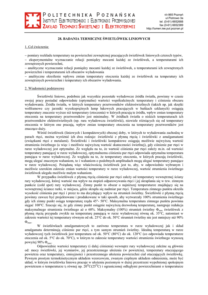 28. BADANIA TERMICZNE ŚWIETLÓWEK LINIOWYCH 1. Cel