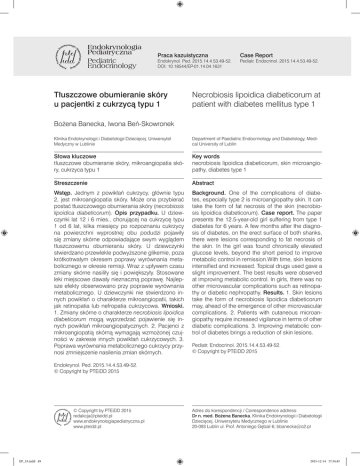 Praca kazuistyczna Endokrynol. Ped. 2015.14.4.53.49-52. DOI: 10.18544/EP-01.14.04.1631 Tłuszczowe obumieranie skóry u pacjentki z cukrzycą typu 1 Case Report Pediatr. Endocrinol. 2015.14.4.53.49-52. Necrobiosis lipoidica diabeticorum at patient with diabetes mellitus type 1 Bożena Banecka, Iwona Beń-Skowronek Klinika Endokrynologii i Diabetologii Dziecięcej, Uniwersytet Medyczny w Lublinie Department of Paediatric Endocrinology and Diabetology, Medical University of Lublin Słowa kluczowe tłuszczowe obumieranie skóry, mikroangiopatia skóry, cukrzyca typu 1 Key words necrobiosis lipoidica diabeticorum, skin microangiopathy, diabetes type 1 Streszczenie Abstract Wstęp. Jednym z powikłań cukrzycy, głównie typu 2, jest mikroangiopatia skóry. Może ona przybierać postać tłuszczowego obumierania skóry (necrobiosis lipoidica diabeticorum). Opis przypadku. U dziewczynki lat 12 i 6 mies., chorującej na cukrzycę typu 1 od 6 lat, kilka miesięcy po rozpoznaniu cukrzycy na powierzchni wyprostnej obu podudzi pojawiły się zmiany skórne odpowiadające swym wyglądem tłuszczowemu obumieraniu skóry. U dziewczynki stwierdzano przewlekle podwyższone glikemie, poza krótkotrwałym okresem poprawy wyrównania metabolicznego w okresie remisji. Wraz z upływem czasu zmiany skórne nasiliły się i powiększyły. Stosowane leki miejscowe dawały nieznaczną poprawę. Najlepsze efekty obserwowano przy poprawie wyrównania metabolicznego. U dziewczynki nie stwierdzono innych powikłań o charakterze mikroangiopatii, takich jak retinopatia lub nefropatia cukrzycowa. Wnioski. 1. Zmiany skórne o charakterze necrobiosis lipoidica diabeticorum mogą wyprzedzać pojawienie się innych powikłań mikroangiopatycznych. 2. Pacjenci z mikroangiopatią skórną wymagają wzmożonej czujności w zakresie innych powikłań cukrzycowych. 3. Poprawa wyrównania metabolicznego cukrzycy przynosi zmniejszenie nasilenia zmian skórnych. Background. One of the complications of diabetes, especially type 2 is microangiopathy skin. It can take the form of fat necrosis of the skin (necrobiosis lipoidica diabeticorum). Case report. The paper presents the 12.5-year-old girl suffering from type 1 diabetes for 6 years. A few months after the diagnosis of diabetes, on the erect surface of both shanks, there were lesions corresponding to fat necrosis of the skin. In the girl was found chronically elevated glucose levels, beyond the short period to improve metabolic control in remission.With time, skin lesions intensified and increased. Topical drugs used gave a slight improvement. The best results were observed at improving metabolic control. In girls, there was no other microvascular complications such as retinopathy or diabetic nephropathy. Results. 1. Skin lesions take the form of necrobiosis lipoidica diabeticorum may, ahead of the emergence of other microvascular complications. 2. Patients with cutaneous microangiopathy require increased vigilance in terms of other diabetic complications. 3. Improving metabolic control of diabetes brings a reduction of skin lesions. Pediatr. Endocrinol. 2015.14.4.53.49-52. © Copyright by PTEiDD 2015 Endokrynol. Ped. 2015.14.4.53.49-52. © Copyright by PTEiDD 2015 © Copyright by PTEiDD 2015 [email protected] www.endokrynologiapediatryczna.pl www.pteidd.pl EP_53.indd 49 Adres do korespondencji / Correspondence address: Dr n. med. Bożena Banecka, Klinika Endokrynologii i Diabetologii Dziecięcej, Uniwersytetu Medycznego w Lublinie 20-093 Lublin ul. Prof. Antoniego Gębali 6; [email protected] 2015-12-14 17:34:43 Wstęp Cukrzyca jest chorobą ogólnoustrojową związaną z zaburzeniami metabolizmu węglowodanów, tłuszczów i białek w wyniku bezwzględnego lub względnego niedoboru insuliny.Wiąże się z uszkodzeniem, zaburzeniem czynności i niewydolnością różnych narządów. Do wielonarządowych powikłań cukrzycy należą również zmiany skórne. Charakteryzują się one dużą różnorodnością. Skóra jest narządem bogatym w białka tkanki łącznej, które w wyniku procesu nieenzymatycznej glikacji ulegają uszkodzeniu, co prowadzi między innymi do rozwoju powikłań cukrzycowych o charakterze mikroangiopatii i zwyrodnienia włókien tkanki łącznej. Zmiany o charakterze mikroangiopatii obejmują powierzchowne naczynia włosowate, tętniczki i żyłki. W wyniku odkładania się glikoprotein w ścianach naczyń oraz wtórnego gromadzenia się komórek tłuszczowych w obrębie uszkodzonego kolagenu dochodzi do pogrubienia i zwężenia światła naczyń. Tłuszczowe obumieranie skóry (necrobiosis lipoidica diabeticorum, NLD) jest chorobą rzadką, związaną głównie z cukrzycą typu 2, należy do grupy dermatoz ziarniniakowych prowadzących do uszkodzenia włókien kolagenowych i zaniku skóry. Na skórze pojawiają się dobrze odgraniczone, naciekowe ogniska o lekko żółtawym zabarwieniu z widocznym zanikiem w części centralnej, następnie rozwija się brzeżna strefa zmienionej zapalnie skóry i centralna strefa martwicy podatna na uszkodzenia i rozwój owrzodzeń. Typowe dla tej dermatozy wykwity lokalizują się głównie na skórze wyprostnej powierzchni podudzi [1–3]. na powierzchni wyprostnej obu podudzi pojawiły się płaskie nacieki barwy sinoczerwonej, rozszerzające się obwodowo,z zanikiem skóry i prześwitującymi naczyniami krwionośnymi w części centralnej. Zmiany były wyraźnie odgraniczone, z wałowatym naciekiem zapalnym na obwodzie. Wraz z upływem czasu zmiany skórne nasiliły się i powiększyły. Pojawiła się skłonność do tworzenia bliznowatych zaników w części centralnej oraz trudno gojących owrzodzeń (ryc. 1). Stosowane leki miejscowe (opatrunki okluzyjne ze steroidami, Argosulfan) dawały nieznaczną poprawę. Najlepsze efekty obserwowano przy dłużej trwającym obniżeniu glikemii i poprawie wyrównania metabolicznego. Mniejsze nasilenie zmian pacjentka obserwowała również latem, po ekspozycji zmienionych ch