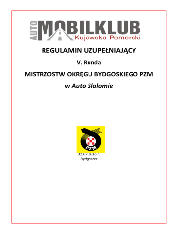 REGULAMIN UZUPEŁNIAJĄCY V. Runda MISTRZOSTW OKRĘGU BYDGOSKIEGO PZM w Auto Slalomie 31.07.2016 r. Bydgoszcz „Zawody zorganizowane zgodnie z Międzynarodowym Kodeksem Sportowym FIA oraz jego Załącznikami i Regulaminem Sportowym PZM” 1. Program Zawodów: 20.07.2016 31.07.2016 12:00 12:00 - 12:30 12:40 12:55 - 13:10 13:15 15:30 16:00 Otwarcie listy zgłoszeń Zamknięcie listy zgłoszeń Odbiór Administracyjny / Badanie Kontrolne/ZSS Odprawa uczestników Zapoznanie z Trasą Start pierwszego uczestnika Ogłoszenie wyników prowizorycznych/ZSS Ogłoszenie wyników oficjalnych / zakończenie zawodów Biuro Zawodów 29.07.2016 do godz. 15:00 Automobilklub Kujawsko-Pomorski ul. Białogardzka7,85-808 Bydgoszcz Tel. 790-484-804, e-mail [email protected] 31.07.2016 godz. 11:30 - 12:30 Bydgoszcz (Kartodrom) ul. Fordońska 116, 85-739 Bydgoszcz 2. Organizator: Automobilklub Kujawsko-Pomorski ul. Białogardzka7, tel. 693-529-066) e-mail [email protected] Zawody rozgrywane są w oparciu o następujące przepisy: - Międzynarodowy Kodeks Sportowy FIA wraz z załącznikami (MKS FIA), - Regulamin Konkursowej Jazdy Samochodowej 2016 (KJS) - Regulamin Ochrony Środowiska w Sportach Motorowych PZM - Regulamin Ramowy Mistrzostwa Okręgu Bydgoskiego w Auto Slalomie na rok 2016, - Regulamin Uzupełniający Zawodów zatwierdzony przez OKSS. 3. Numer wizy OKSS ZO PZM: OKSS.III.420.21.2016 z dnia 11.07.2016r 4. Data i Miejsce: Zawody odbędą się dnia 31.07.2016, PZM Bydgoszcz (Kartodrom) ul. Fordońska 116 Bydgoszcz. 5. Osoby Oficjalne Zespół Sędziów Sportowych Przewodniczący: Magdalena Bajerska I-484/12 Członek: Marcin Jettka I-513/12 Członek: Krzysztof Studziński I-003/12 Dyrektor Zawodów: Mirosław Urbaczewski I-560/13 Tel:606 911 003 Kierownik zabezpieczenia i trasy: Piotr Kobus I-612/14 Kierownik BK: Bartłomiej Gołąb II-02052 Kierownik PO 1: Marcin Kawalec II-02068 Kierownik PO 2: Gabriela Kałamarska II-02069 Kierownik Biura Zawodów: Anna Wrzesińska II 02053 Ratownik Medyczny: Damian Dębecki T/10104275/14 Komisarz Ochrony Środowiska: Kamil Urbaczewski S/K/251/2015(lic s. II-02005) Asystent Dyrektora zawodnikami: ds. Kontaktu z Marta Kobus II-02003, tel. 790484804 6. Dopuszczeni zawodnicy Do udziału w zawodach dopuszczone są wszystkie osoby posiadające aktualne prawo jazdy oraz ubezpieczenie NNW. 7. Zgłoszenia: 7.1. Aby zgłosić udział w zawodach należy skorzystać z formularza zamieszczonego pod adresem internetowym www.akkp.pl Formularz będzie dostępny od dnia 20.07 godz. 8:00 W dniu zawodów tj.31.07.2016r. można zgłaszać się w godzinach od 11:30 do 12:00 w biurze zawodów. Maksymalna ilość uczestników dopuszczonych do zawodów wynosi 50 załóg. 7.2. Wysokość wpisowego za udział w rundzie wynosi: 80zł dla uczestników zrzeszonych w klubie sfederowanym w PZM i legitymujących się opłaconą składką na rok 2016. 110 zł dla pozostałych uczestników. 7.3. Do startu zostaną dopuszczeni kierowcy posiadający ważne prawo jazdy minimum kategorii B, oraz ważne ubezpieczenie NNW. 8. Odbiór administracyjny – rejestracja zawodników Weryfikacja dokumentów potwierdzających uprawnienia do kierowania pojazdem, karta przynależności klubowej. 9. Podział na klasy: K1 -( Art. 251 Zał. „J” pkt.1.2 klasa 1-7) - samochody z silnikami o pojemności do 1.400 cm3 K2 -(Art. 251 Zał. „J” pkt.1.2 klasa 8) - sam. z silnikami o poj. ponad 1.400 do 1.600 cm3 K3 -(Art. 251 Zał. „J” pkt.1.2 klasa 9) - sam. z silnikami o poj. ponad 1.600 do 2000 cm3 K4 - (Art. 251 Zał. „J” pkt.1.2 klasa 10-16) - sam. z silnikami o poj. ponad 2000 do 5.500 cm3, oraz pojazdy z napędem na 4 koła bez względu na pojemność silnika. OPEN - pozostałe samochody (w tym buggy). Gość- kierowca/zawodnik posiadający licencję. Samochody posiadające silniki benzynowe z turbodoładowaniem zaliczone zostaną do klasy według pojemności wynikającej z pomnożenia pojemności silnika przez współczynnik 1,7, natomiast samochody z silnikami wysokoprężnymi z turbodoładowaniem przez współczynnik 1,5. 10. Trasa Długość trasy: 1000m. Nawierzchnia: asfalt 11. Przebieg Zawodów: Uczestnicy będą mieli do pokonania trzykrotny przejazd wyznaczonej pachołkami (słupkami) trasy na czas. Dwa najlepsze czasy będą liczone do klasyfikacji końcowej zawodów. Pomiar czasu odbywać się będzie za pomocą fotokomórki. Uczestnicy nie zatrzymują się na linii mety (meta lotna), zatrzymanie następuje na linii mety stop. 12. Falstart i kary czasowe za wykroczenia: Mają zastosowanie przepisy pkt. 11 Regulaminu Ramowego MOB PZM w Auto Slalomie 2016. 13. Punktacja: Według pkt. 10 Regulaminu Ramowego MOB PZM w Auto Slalomie na rok 2016. 14. Klasyfikacja Zawodnicy będą klasyfikowani w MOB PZM w Auto Slalomie, w poszczególnych klasach oraz klasyfikacji generalnej zgodnie z ustaleniami opublikowanymi w pkt 15 Regulaminu Ramowego MOB PZM w Auto Slalomie na rok 2016. 15. Wyposażenie bezpieczeństwa uczestnika Podczas przejazdów zapoznawczych, treningowych i wyścigowych kierujący uczestnicy zobowiązani są do: a) używania kasku, który posiada homologacje dopuszczającą do sportu samochodowego (w sezonie 2016 dopuszcza się z utracona homologacją). b) zaleca się używanie kombinezonu (dopuszczone jest używanie kombinezonów z utraconą homologacją FIA Standard 1986 ). c) zaleca się bieliznę (długa), balaklawę, skarpety – dopuszczone jest również używanie ww. wyposażenia osobistego z utraconą normą ISO 6940. d) zaleca się używanie butów i rękawic – dopuszczone jest używanie ww. wyposażenia osobistego z utraconą normą ISO 6940. e) poruszania się w zapiętych pasach bezpieczeństwa. f) poruszania się z zamkniętą szybą boczną, po stronie kierującego. 16. Nagrody Mają zastosowanie przepisy pkt. 18 Regulaminu Ramowego MOB PZM w Auto Slalomie 2016. 17. Ubezpieczenie 17.1. Każdy uczestnik bierze udział w imprezie na własną odpowiedzialność. Organizator 