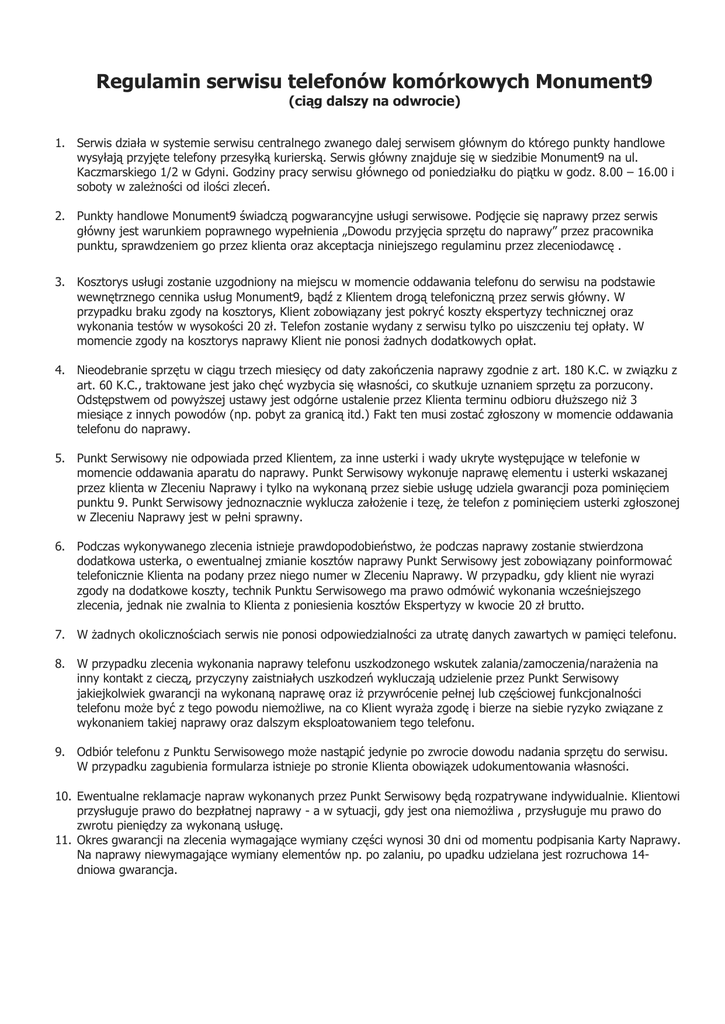 Regulamin serwisu telefonów komórkowych Monument9 (ciąg dalszy na odwrocie) 1. Serwis działa w systemie serwisu centralnego zwanego dalej serwisem głównym do którego punkty handlowe wysyłają przyjęte telefony przesyłką kurierską. Serwis główny znajduje się w siedzibie Monument9 na ul. Kaczmarskiego 1/2 w Gdyni. Godziny pracy serwisu głównego od poniedziałku do piątku w godz. 8.00 – 16.00 i soboty w zależności od ilości zleceń. 2. Punkty handlowe Monument9 świadczą pogwarancyjne usługi serwisowe. Podjęcie się naprawy przez serwis główny jest warunkiem poprawnego wypełnienia „Dowodu przyjęcia sprzętu do naprawy” przez pracownika punktu, sprawdzeniem go przez klienta oraz akceptacja niniejszego regulaminu przez zleceniodawcę . 3. Kosztorys usługi zostanie uzgodniony na miejscu w momencie oddawania telefonu do serwisu na podstawie wewnętrznego cennika usług Monument9, bądź z Klientem drogą telefoniczną przez serwis główny. W przypadku braku zgody na kosztorys, Klient zobowiązany jest pokryć koszty ekspertyzy technicznej oraz wykonania testów w wysokości 20 zł. Telefon zostanie wydany z serwisu tylko po uiszczeniu tej opłaty. W momencie zgody na kosztorys naprawy Klient nie ponosi żadnych dodatkowych opłat. 4. Nieodebranie sprzętu w ciągu trzech miesięcy od daty zakończenia naprawy zgodnie z art. 180 K.C. w związku z art. 60 K.C., traktowane jest jako chęć wyzbycia się własności, co skutkuje uznaniem sprzętu za porzucony. Odstępstwem od powyższej ustawy jest odgórne ustalenie przez Klienta terminu odbioru dłuższego niż 3 miesiące z innych powodów (np. pobyt za granicą itd.) Fakt ten musi zostać zgłoszony w momencie oddawania telefonu do naprawy. 5. Punkt Serwisowy nie odpowiada przed Klientem, za inne usterki i wady ukryte występujące w telefonie w momencie oddawania aparatu do naprawy. Punkt Serwisowy wykonuje naprawę elementu i usterki wskazanej przez klienta w Zleceniu Naprawy i tylko na wykonaną przez siebie usługę udziela gwarancji poza pominięciem punktu 9. Punkt Serwisowy jednoznacznie wyklucza założenie i tezę, że telefon z pominięciem usterki zgłoszonej w Zleceniu Naprawy jest w pełni sprawny. 6. Podczas wykonywanego zlecenia istnieje prawdopodobieństwo, że podczas naprawy zostanie stwierdzona dodatkowa usterka, o ewentualnej zmianie kosztów naprawy Punkt Serwisowy jest zobowiązany poinformować telefonicznie Klienta na podany przez niego numer w Zleceniu Naprawy. W przypadku, gdy klient nie wyrazi zgody na dodatkowe koszty, technik Punktu Serwisowego ma prawo odmówić wykonania wcześniejszego zlecenia, jednak nie zwalnia to Klienta z poniesienia kosztów Ekspertyzy w kwocie 20 zł brutto. 7. W żadnych okolicznościach serwis nie ponosi odpowiedzialności za utratę danych zawartych w pamięci telefonu. 8. W przypadku zlecenia wykonania naprawy telefonu uszkodzonego wskutek zalania/zamoczenia/narażenia na inny kontakt z cieczą, przyczyny zaistniałych uszkodzeń wykluczają udzielenie przez Punkt Serwisowy jakiejkolwiek gwarancji na wykonaną naprawę oraz iż przywrócenie pełnej lub częściowej funkcjonalności telefonu może być z tego powodu niemożliwe, na co Klient wyraża zgodę i bierze na siebie ryzyko związane z wykonaniem takiej naprawy oraz dalszym eksploatowaniem tego telefonu. 9. Odbiór telefonu z Punktu Serwisowego może nastąpić jedynie po zwrocie dowodu nadania sprzętu do serwisu. W przypadku zagubienia formularza istnieje po stronie Klienta obowiązek udokumentowania własności. 10. Ewentualne reklamacje napraw wykonanych przez Punkt Serwisowy będą rozpatrywane indywidualnie. Klientowi przysługuje prawo do bezpłatnej naprawy - a w sytuacji, gdy jest ona niemożliwa , przysługuje mu prawo do zwrotu pieniędzy za wykonaną usługę. 11. Okres gwarancji na zlecenia wymagające wymiany części wynosi 30 dni od momentu podpisania Karty Naprawy. Na naprawy niewymagające wymiany elementów np. po zalaniu, po upadku udzielana jest rozruchowa 14dniowa gwarancja. Szanowny Kliencie, w celu poprawienia jakości usług oraz pewności w prawidłowości przebiegu zlecenia pamiętaj: 1. Sprawdź dokładnie „Dowód przyjęcia sprzętu do naprawy” w trakcie oddawania telefonu do naprawy, zwróć uwagę na poprawnie wpisany model telefonu oraz numer IMEI, powinien mieć 14 lub 15 cyfr i zgadzać się z numerem IMEI telefonu, który oddają Państwo do serwisu. Proszę zwrócić uwagę na poprawnie wpisany numer kontaktowy oraz zrozumiały opis usterki. 2. 3. W momencie odbioru telefonu po naprawie mogą Państwo profilaktycznie przetestować w punkcie naprawioną usterkę oraz zgłosić ewentualne zastrzeżenia. Podczas odbioru powinni dostać Państwo podpisaną „Kartę naprawy” (nie dotyczy usług programowych, np. SIM-Lock, aktualizacja oprogramowania itp.) zawierającą opis przebiegu naprawy, szczegółowy test wszystkich funkcji telefonu i koszt zlecenia. Do karty naprawy pracownik musi dołączyć paragon z kasy fiskalnej lub fakturę VAT na podstawie których realizowane będą ewentualne naprawy gwarancyjne. Terminy napraw uzależnione są od wielu czynników, na niektóre z nich serwis główny nie ma wpływu. Są to m.in. 1. Sprawność dostarczania przesyłek kurierskich przez kuriera. Prawidłowy czas 1-2 dni w jedną stronę (nie dotyczy Gdyni). 2. Harmonogram wysyłek telefonów do naprawy z punktów przyjęć do serwisu głównego ustalony jest na Poniedziałek, Środę i Piątek (harmonogramy wysyłek nie dotyczą punktów przyjęć Monument9 z siedzibą w Gdyni, telefony trafiają do serwisu tego samego dnia, jeśli zostaną przyjęte do godz. 12.00 lub następnego dnia, jeśli zostaną przyjęte po godz. 12.00). 3. Czas dostarczenia części do serwisu głównego w momencie ich braku w magazynie (1-5 dni) 4. Jakość części zamiennych oraz czas realizacji ich reklamacji przez hurtownie – w momencie kiedy serwis główny dostanie 5. 6. pa