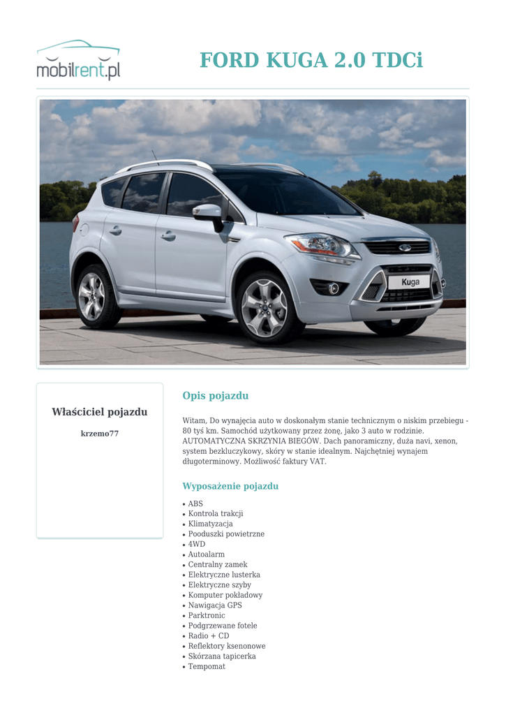 FORD KUGA 2.0 TDCi Opis pojazdu Właściciel pojazdu krzemo77 Witam, Do wynajęcia auto w doskonałym stanie technicznym o niskim przebiegu 80 tyś km. Samochód użytkowany przez żonę, jako 3 auto w rodzinie. AUTOMATYCZNA SKRZYNIA BIEGÓW. Dach panoramiczny, duża navi, xenon, system bezkluczykowy, skóry w stanie idealnym. Najchętniej wynajem długoterminowy. Możliwość faktury VAT. Wyposażenie pojazdu ● ● ● ● ● ● ● ● ● ● ● ● ● ● ● ● ● ABS Kontrola trakcji Klimatyzacja Pooduszki powietrzne 4WD Autoalarm Centralny zamek Elektryczne lusterka Elektryczne szyby Komputer pokładowy Nawigacja GPS Parktronic Podgrzewane fotele Radio + CD Reflektory ksenonowe Skórzana tapicerka Tempomat ● ● ● ● ● ● Wspomaganie kierownicy System multimedialny (np. TV) automatyczna biały diesel suv Rezerwacje Początek rezerwacji Koniec rezerwacji