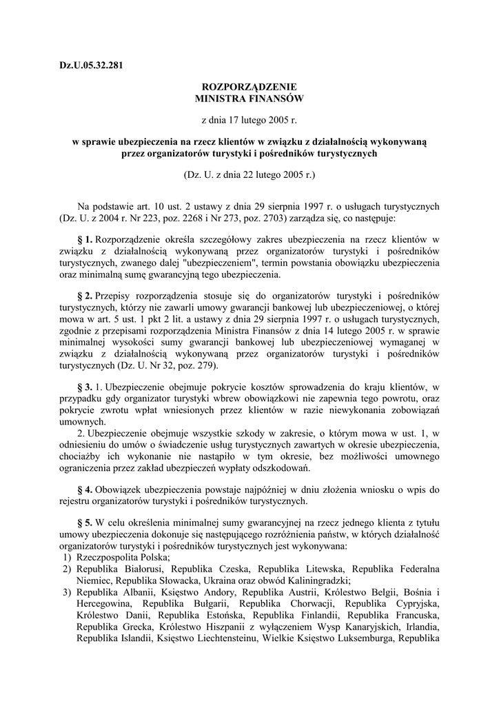 Dz.U.05.32.281 ROZPORZĄDZENIE MINISTRA FINANSÓW z dnia 17 lutego 2005 r. w sprawie ubezpieczenia na rzecz klientów w związku z działalnością wykonywaną przez organizatorów turystyki i pośredników turystycznych (Dz. U. z dnia 22 lutego 2005 r.) Na podstawie art. 10 ust. 2 ustawy z dnia 29 sierpnia 1997 r. o usługach turystycznych (Dz. U. z 2004 r. Nr 223, poz. 2268 i Nr 273, poz. 2703) zarządza się, co następuje: § 1. Rozporządzenie określa szczegółowy zakres ubezpieczenia na rzecz klientów w związku z działalnością wykonywaną przez organizatorów turystyki i pośredników turystycznych, zwanego dalej "ubezpieczeniem", termin powstania obowiązku ubezpieczenia oraz minimalną sumę gwarancyjną tego ubezpieczenia. § 2. Przepisy rozporządzenia stosuje się do organizatorów turystyki i pośredników turystycznych, którzy nie zawarli umowy gwarancji bankowej lub ubezpieczeniowej, o której mowa w art. 5 ust. 1 pkt 2 lit. a ustawy z dnia 29 sierpnia 1997 r. o usługach turystycznych, zgodnie z przepisami rozporządzenia Ministra Finansów z dnia 14 lutego 2005 r. w sprawie minimalnej wysokości sumy gwarancji bankowej lub ubezpieczeniowej wymaganej w związku z działalnością wykonywaną przez organizatorów turystyki i pośredników turystycznych (Dz. U. Nr 32, poz. 279). § 3. 1. Ubezpieczenie obejmuje pokrycie kosztów sprowadzenia do kraju klientów, w przypadku gdy organizator turystyki wbrew obowiązkowi nie zapewnia tego powrotu, oraz pokrycie zwrotu wpłat wniesionych przez klientów w razie niewykonania zobowiązań umownych. 2. Ubezpieczenie obejmuje wszystkie szkody w zakresie, o którym mowa w ust. 1, w odniesieniu do umów o świadczenie usług turystycznych zawartych w okresie ubezpieczenia, chociaŜby ich wykonanie nie nastąpiło w tym okresie, bez moŜliwości umownego ograniczenia przez zakład ubezpieczeń wypłaty odszkodowań. § 4. Obowiązek ubezpieczenia powstaje najpóźniej w dniu złoŜenia wniosku o wpis do rejestru organizatorów turystyki i pośredników turystycznych. § 5. W celu określenia minimalnej sumy gwarancyjnej na rzecz jednego klienta z tytułu umowy ubezpieczenia dokonuje się następującego rozróŜnienia państw, w których działalność organizatorów turystyki i pośredników turystycznych jest wykonywana: 1) Rzeczpospolita Polska; 2) Republika Białorusi, Republika Czeska, Republika Litewska, Republika Federalna Niemiec, Republika Słowacka, Ukraina oraz obwód Kaliningradzki; 3) Republika Albanii, Księstwo Andory, Republika Austrii, Królestwo Belgii, Bośnia i Hercegowina, Republika Bułgarii, Republika Chorwacji, Republika Cypryjska, Królestwo Danii, Republika Estońska, Republika Finlandii, Republika Francuska, Republika Grecka, Królestwo Hiszpanii z wyłączeniem Wysp Kanaryjskich, Irlandia, Republika Islandii, Księstwo Liechtensteinu, Wielkie Księstwo Luksemburga, Republika Łotewska, Była Jugosłowiańska Republika Macedonii, Republika Malty, Republika Mołdowy, Księstwo Monako, Królestwo Niderlandów, Królestwo Norwegii, Republika Portugalska, Federacja Rosyjska z wyłączeniem obwodu Kaliningradzkiego, Rumunia, Republika San Marino, Serbia i Czarnogóra, Republika Słowenii, Konfederacja Szwajcarska, Królestwo Szwecji, Republika Turcji, Stolica Apostolska, Republika Węgierska, Zjednoczone Królestwo Wielkiej Brytanii i Irlandii Północnej i Republika Włoska; 4) inne państwa niewymienione w pkt 1-3 oraz Wyspy Kanaryjskie. § 6. 1. Minimalna suma gwarancyjna na rzecz jednego klienta z tytułu umowy ubezpieczenia wynosi dla: 1) organizatorów turystyki oraz pośredników turystycznych dla imprez organizowanych przez przedsiębiorców niewykonujących działalności na terytorium Rzeczypospolitej Polskiej - kwotę stanowiącą równowartość ceny imprezy turystycznej, nie mniej jednak niŜ równowartość: a) 500 euro - w przypadku uczestniczenia przez klienta w imprezie zagranicznej na terytorium państw, o których mowa w § 5 pkt 4, b) 200 euro - w przypadku uczestniczenia przez klienta w imprezie zagranicznej na terytorium państw, o których mowa w § 5 pkt 3, c) 120 euro - w przypadku uczestniczenia przez klienta w imprezie zagranicznej na terytorium państw, o których mowa w § 5 pkt 2, d) 20 euro - w przypadku uczestniczenia przez klienta w imprezie na terytorium Rzeczypospolitej Polskiej; 2) pośredników turystycznych dla imprez organizowanych przez przedsiębiorców wpisanych do rejestru, o którym mowa w art. 4 ust. 1 ustawy z dnia 29 sierpnia 1997 r. o usługach turystycznych - sumę stanowiącą równowartość 50 euro, a dla usług turystycznych wyłącznie na terytorium Rzeczypospolitej Polskiej - sumę stanowiącą równowartość 20 euro. 2. Kwoty, o których mowa w ust. 1, ustalane są przy zastosowaniu kursu średniego euro ogłoszonego przez Narodowy Bank Polski po raz pierwszy w roku, w którym umowa ubezpieczenia została zawarta. § 7. 1. Przepisy rozporządzenia stosuje się do umów ubezpieczenia zawartych od dnia 22 lutego 2005 r. 2. W przypadku zawarcia umowy ubezpieczenia przed dniem wejścia w Ŝycie rozporządzenia na okres, który upływa po tym dniu, nową umowę ubezpieczenia zawiera się najpóźniej w ostatnim dniu tego okresu. § 8. Rozporządzenie wchodzi w Ŝycie z dniem 22 lutego 2005 r.