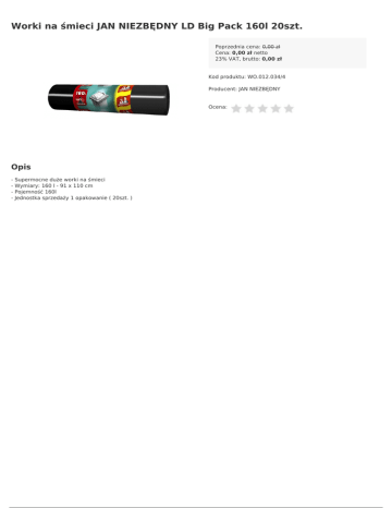 Worki na śmieci JAN NIEZBĘDNY LD Big Pack 160l 20szt. Poprzednia cena: 0,00 zł Cena: 0,00 zł netto 23% VAT, brutto: 0,00 zł Kod produktu: WO.012.034/4 Producent: JAN NIEZBĘDNY Ocena: Opis - Powered by TCPDF (www.tcpdf.org) Supermocne duże worki na śmieci Wymiary: 160 l - 91 x 110 cm Pojemność 160l Jednostka sprzedaży 1 opakowanie ( 20szt. )