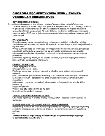 CHOROBA HOROBA PĘCHERZYKOWA ŚWIŃ ( SWINEA VESICULAR DISEASEDISEASE-SVD) CZYNNIK ETIOLOGICZNY: Czynnikiem etiologicznym jest wirus z rodziny Picornaviridae, rodzaj Enterovirus. Zarazek zawarty w mleku ulega inaktywacji w temperaturze 60 st.C w ciągu 2 minut. W gnojowicy w temperaturze 64 st.C w podobnym czasie. W mięsie do zabicia wirusa Wystarcza temperatura 70 st.C. Solenie, wędzenie, peklowanie nie zabija zarazka. Wirus SVD jest wyjątkowo oporny na działanie czynników zewnętrznych i zmienne pH. PATOGENEZA: Choroba szerzy się za pośrednictwem zakaŜonych świń lub odchodów, a takŜe zainfekowanych wirusem odpadów. Rozprzestrzeniane drogą powietrzną jest bardzo ograniczone. Wirus SVD namnaŜa się w miejscu wniknięcia w komórkach nabłonka, powodując powstanie pęcherzyków pierwotnych. W przypadku przełamania odporności miejscowej przedostaje się do krwi, rozprzestrzenia się po całym organizmie co powoduje powstanie pęcherzy wtórnych na skórze koronek, szparach międzyracicowych, jamie ustnej oraz gruczole mlekowym. OBJAWY KLINICZNE: Okres wylęgania 3-14 dni. Chorują tylko świnie i dziki. Pęcherze surowicze na tarczy ryjowej, w obrębie jamy ustnej, na koronkach i piętkach racic, w okolicy szpary międzyracicowej, a takŜe w skórze śródstopia i śródręcza. U macior prośnych i oproszonych, oraz u tuczników objawy nerwowe: ruchy menaŜowe, atakowanie i gryzienie przeszkód, wiosłowanie kończynami i poraŜenia, które prowadzą często do śmierci. Wzrost ciepłoty ciała od 39,8 do 42 st.C U części prośnych loch ronienia. ZMIANY ANATOMOPATOLOGICZNE: Obecność pęcherzy w skórze okolicy racicy, piętek i szparze racicowej oraz na wymieniu. POBIERANIE I PRZESYŁANIE MATERJAŁU DO BADAŃ: Pobiera się materiał ze ścian świeŜych pęcherzy (co najmniej 3 gramy) do jałowej probówki umieszczonej w termosie z lodem i z pismem przewodnim wysyła się gońcem do: Zakładu Badania Pryszczycy Państwowego Instytutu Weterynaryjnego w Zduńskiej Woli ul. Wodna 7 1 ZWALCZANIE: Rozporządzenie ministra rolnictwa z 30 lipca 1973r. w sprawie obowiązku zgłaszania I zwalczania choroby pęcherzykowej świń (Dz.U. Nr 31, poz.181). Instrukcja Ministerstwa Rolnictwa Departamentu Weterynarii z 30 XII 1977r. Nr WETz 4411/CHp-7/77 w sprawie zwalczania choroby pęcherzykowej świń. DEZYNFEKCJA: 2% roztwór sody Ŝrącej- inaktywuje zarazek w ciągu godziny Halamid 1% Clorina 2% Aldehol 0,5-1% Agrosteril 1% Virkon 2% 2