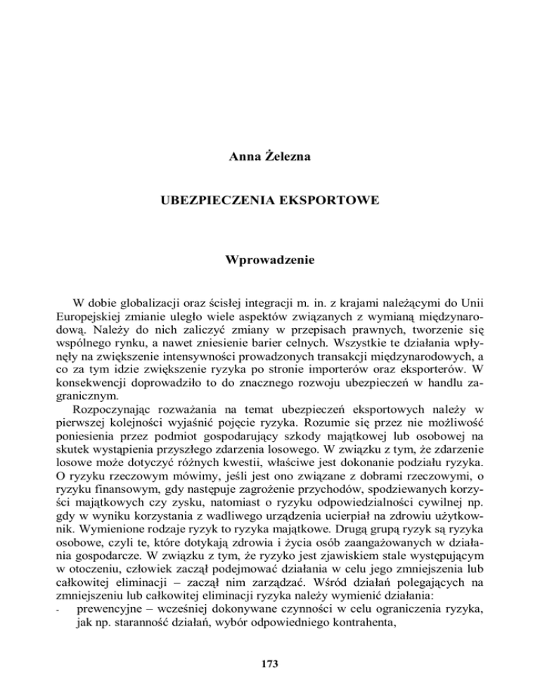 Anna Żelezna UBEZPIECZENIA EKSPORTOWE Wprowadzenie W dobie globalizacji oraz ścisłej integracji m. in. z krajami należącymi do Unii Europejskiej zmianie uległo wiele aspektów związanych z wymianą międzynarodową. Należy do nich zaliczyć zmiany w przepisach prawnych, tworzenie się wspólnego rynku, a nawet zniesienie barier celnych. Wszystkie te działania wpłynęły na zwiększenie intensywności prowadzonych transakcji międzynarodowych, a co za tym idzie zwiększenie ryzyka po stronie importerów oraz eksporterów. W konsekwencji doprowadziło to do znacznego rozwoju ubezpieczeń w handlu zagranicznym. Rozpoczynając rozważania na temat ubezpieczeń eksportowych należy w pierwszej kolejności wyjaśnić pojęcie ryzyka. Rozumie się przez nie możliwość poniesienia przez podmiot gospodarujący szkody majątkowej lub osobowej na skutek wystąpienia przyszłego zdarzenia losowego. W związku z tym, że zdarzenie losowe może dotyczyć różnych kwestii, właściwe jest dokonanie podziału ryzyka. O ryzyku rzeczowym mówimy, jeśli jest ono związane z dobrami rzeczowymi, o ryzyku finansowym, gdy następuje zagrożenie przychodów, spodziewanych korzyści majątkowych czy zysku, natomiast o ryzyku odpowiedzialności cywilnej np. gdy w wyniku korzystania z wadliwego urządzenia ucierpiał na zdrowiu użytkownik. Wymienione rodzaje ryzyk to ryzyka majątkowe. Drugą grupą ryzyk są ryzyka osobowe, czyli te, które dotykają zdrowia i życia osób zaangażowanych w działania gospodarcze. W związku z tym, że ryzyko jest zjawiskiem stale występującym w otoczeniu, człowiek zaczął podejmować działania w celu jego zmniejszenia lub całkowitej eliminacji – zaczął nim zarządzać. Wśród działań polegających na zmniejszeniu lub całkowitej eliminacji ryzyka należy wymienić działania: prewencyjne – wcześniej dokonywane czynności w celu ograniczenia ryzyka, jak np. staranność działań, wybór odpowiedniego kontrahenta, 173 kompensacyjne – transakcje osłonowe, np. na rynku walutowym, tłumiące – które ograniczają straty po wystąpieniu zdarzenia losowego, ubezpieczające – które ograniczają koszty związane z wystąpieniem ewentualnej straty1. Ryzyko to pojęcie, które zasadniczo łączy się z ubezpieczeniem. Ubezpieczenie to klasyczna forma przerzucenia ryzyka na inny podmiot gospodarczy za odpowiednią składkę. Ubezpieczenie (asekuracja) to zapewnienie pokrycia strat powstałych w wyniku nieszczęśliwych wypadków i klęsk żywiołowych. Pokrycie strat następuje przez wypłatę odszkodowań i świadczeń z funduszu tworzonego ze składek wnoszonych przez jednostki zagrożone tymi zdarzeniami. Zatem ubezpieczenie jest metodą zarządzania ryzykiem poprzez transfer ryzyka z jednostki na wyspecjalizowany podmiot zwany zakładem ubezpieczeń, organizujący dystrybucję tego ryzyka pomiędzy większą liczbę podmiotów, którym zagraża podobne ryzyko2. Zgodnie z ujęciem E.J. Vaughana ryzyko w obszarze ubezpieczenia powinno się charakteryzować czterema cechami: 1. powinna powstać odpowiednio duża liczba jednostek zdarzeń o charakterze homogenicznym, co pozwoli na przewidywanie ekonomicznych następstw strat; 2. strata spowodowana przez dane zjawisko musi być definitywna i mierzalna; 3. strata powstała w następstwie ponoszenia ryzyka nie może być niemierzalna; 4. zaistnienie ryzyka musi być nadzwyczajne i przypadkowe3. W dalszej części pracy zostanie omówiony jeden z rodzajów ubezpieczeń w handlu zagranicznym – ubezpieczenia eksportowe. - Istota i rodzaje ubezpieczeń eksportowych W wyniku znacznych odległości dzielących najczęściej kontrahentów w handlu międzynarodowym, a co za tym idzie dłuższego czasu potrzebnego na realizację transakcji, w wielu transakcjach eksportowych powstają należności i zobowiązania. Wówczas jedna ze stron pierwsza przekazuje towar lub zapłatę i jest wierzycielem drugiej strony dopóki nie dojdzie do odwrotnego świadczenia. Regulowanie wzajemnych zobowiązań i należności nosi nazwę rozliczeń międzynarodowych. Finan1 Handel zagraniczny: poradnik dla praktyków. Red. B. Stępień. Warszawa: PWE, 2007, s. 325- 327. 2 Zarządzanie ryzykiem. Red. K. Jajuga. Warszawa: PWN, 2007, s. 291-293. I. Gorzeń-Mitka: Ryzyko w eksporcie. Metody i sposoby ograniczania. Warszawa: Wyd. Key Text, 2007, s. 68. 3 174 sowanie transakcji eksportowej zawsze przebiega w dwóch etapach. Pierwszy to finansowanie cyklu produkcyjnego (produkcji eksportowej), natomiast drugi to finansowanie cyklu rozliczeniowego (okresu od momentu wysłania towaru i dokumentów towarowych do odbiorcy lub jego banku aż do momentu uzyskania efektywnego wpływu należności za dostawę). Zatem elementy kredytowania towarzyszą każdej transakcji eksportowej, nawet przy płatności natychmiastowej, gdyż zawsze występuje choć krótkotrwałe kredytowanie jednej ze stron przez drugą lub przez bank biorący udział w rozliczeniu transakcji. Kredyt eksportowy powstaje więc wówczas, gdy importer korzysta z odroczenia płatności ze strony eksportera lub uzyskuje kredyt od banku eksportera bądź innej instytucji finansowej. Jest to każdy kredyt ułatwiający sprzedaż towarów (usług) za granicę4. W wyniku tej powszechności kredytowania transakcji eksportowych znaczenia nabrało zabezpieczenie kredytu eksportowego. Każdy kredyt zawiera w sobie bowiem ryzyko opóźnienia w zapłacie należności lub nawet ryzyko całkowitej niewypłacalności dłużnika. Eksporter może więc zabezpieczyć terminową płatność od importera w różny sposób: za pomocą akredytywy, gwarancji czy awalu na wekslu - czyli za pośrednictwem banku, lub ubezpieczyć swoje należności w firmie ubezpieczeniowej. Ubezpieczenia eksportowe w Polsce nie mają długiej tradycji. Sięgają dopiero roku 1991, kiedy to powołano do życia pierwszą wyspecjalizowaną instytucję realizującą ubezpieczenia kredytów eksportowych, czyli Korporację U