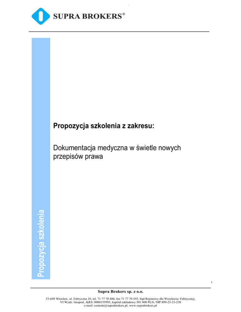 Propozycja szkolenia z zakresu: Propozycja szkolenia Dokumentacja medyczna w świetle nowych przepisów prawa 1 Supra Brokers sp. z o.o. 53-609 Wrocław, ul. Fabryczna 10, tel. 71 77 70 400, fax 71 77 70 455, Sąd Rejonowy dla Wrocławia–Fabrycznej, VI Wydz. Gospod., KRS: 0000155993, kapitał zakładowy 501 800 PLN, NIP 899-25-23-230 e-mail: [email protected], www.suprabrokers.pl Szanowni Państwo, Supra Brokers sp. z o.o. jako wiodący broker i doradca ubezpieczeniowy sektora medycznego, reprezentujący interesy ponad 200 szpitali w całej Polsce, w obliczu wprowadzonych przez ustawodawcę zmian, które w sposób kompleksowy reorganizują system ochrony zdrowia w naszym kraju, zakończył proces dostosowywania dotychczasowych procedur związanych z zawieraniem umów ubezpieczeniowych do nowych regulacji prawnych. Zmiany w powyższym zakresie wdraża uchwalony przez Sejm „pakiet ustaw zdrowotnych”, na który składają się: ustawa z dnia 12 maja 2011 r. o refundacji leków, środków spożywczych specjalnego przeznaczenia żywieniowego oraz wyrobów medycznych (Dz. U. z dnia 13 czerwca 2011 r.), ustawa z dnia 28 kwietnia 2011 r. o systemie informacji w ochronie zdrowia (Dz. U. z dnia 2 czerwca 2011 r.), ustawa z dnia 15 kwietnia 2011 r. o działalności leczniczej (Dz. U. Nr 112, poz. 654) oraz ustawa z dnia 28 kwietnia 2011 r. o zmianie ustawy o zawodach lekarza i lekarza dentysty (Dz. U. z dnia 2 czerwca 2011 r.). Propozycja szkolenia Szczególną Państwa uwagę zwrócić chciałbym na nowelizację ustawy z dnia 6 listopada 2008 r. o prawach pacjenta i Rzeczniku Praw Pacjenta (Dz. U. z 2009 r., Nr 52, poz. 417 ze zm.), na mocy której pacjenci szpitali zyskali szeroki zakres ochrony ich praw w prowadzonym procesie diagnozowania, leczenia i rehabilitacji. Jednym z wymienionych praw pacjenta jest prawo dostępu do dokumentacji medycznej, z czym wiąże się ściśle obowiązek podmiotów prowadzących działalność leczniczą należytego prowadzenia, udostępniania i przechowywania dokumentacji medycznej. Dodatkowo wskazać należy, że zgodnie z treścią przepisów rozporządzenia Ministra Zdrowia z dnia 21 grudnia 2010 r. w sprawie rodzajów i zakresu dokumentacji medycznej oraz sposobu jej przetwarzania (Dz. U. Nr 252, poz. 1697) na podmioty prowadzące działalność leczniczą zostały nałożone szczegółowe obowiązki dotyczące prowadzenia, przetwarzania i przechowywania dokumentacji medycznej. W tym stanie rzeczy, mając na uwadze, że wszystkie działania podejmowane przez Supra Brokers sp. z o.o. są wyrazem fundamentalnej zasady zakładającej, że transfer wiedzy jest kluczowym elementem metodyki współpracy z Klientem, mam ogromną przyjemność przedstawić program szkolenia, którego celem jest przekazanie Państwu kompleksowej informacji dotyczącej szeroko rozumianej dokumentacji medycznej, której prawidłowe prowadzenie, udostępnianie i przechowywanie jest bezpośrednio związane z działalnością prowadzonych przez Państwa jednostek i nakłada na te jednostki szereg obowiązków. 2 Supra Brokers sp. z o.o. 53-609 Wrocław, ul. Fabryczna 10, tel. 71 77 70 400, fax 71 77 70 455, Sąd Rejonowy dla Wrocławia–Fabrycznej, VI Wydz. Gospod., KRS: 0000155993, kapitał zakładowy 501 800 PLN, NIP 899-25-23-230 e-mail: [email protected], www.suprabrokers.pl Nadmienić pragnę, iż program przedstawionego Państwu szkolenia przygotowany został przez szeroki zespół specjalistów, w skład którego weszły osoby posiadające wieloletnie doświadczeniem w branży ubezpieczeniowej sektora medycznego, a ponadto fachowcy z zakresu prawa i medycyny, odpowiedzialni w naszej firmie za systemowe zaprojektowanie i wdrożenie nowych procedur. Głęboką nadzieję pokładam w tym, że prezentowaną propozycję uznają Państwo za interesującą, a odbyte w konsekwencji szkolenia, okażą się być cennym źródłem wiedzy, która wykorzystywana będzie przez Państwa na co dzień w związku z wykonywaniem powierzonych obowiązków. SUPRA BROKERS sp. z o.o. Propozycja szkolenia Prezes Zarządu Rafał Holanowski 3 Supra Brokers sp. z o.o. 53-609 Wrocław, ul. Fabryczna 10, tel. 71 77 70 400, fax 71 77 70 455, Sąd Rejonowy dla Wrocławia–Fabrycznej, VI Wydz. Gospod., KRS: 0000155993, kapitał zakładowy 501 800 PLN, NIP 899-25-23-230 e-mail: [email protected], www.suprabrokers.pl Dokumentacja medyczna w świetle nowych przepisów prawa Forma zajęć: wykład z elementami seminaryjno-dyskusyjnymi Program: około 2 godzin Adresaci: dyrektorzy i ordynatorzy oddziałów szpitali, personel medyczny Cel: zapoznanie uczestników szkolenia z treścią podstawowych przepisów regulujących zasady tworzenia, prowadzenia, udostępniania Propozycja szkolenia i przechowywania dokumentacji medycznej 4 Supra Brokers sp. z o.o. 53-609 Wrocław, ul. Fabryczna 10, tel. 71 77 70 400, fax 71 77 70 455, Sąd Rejonowy dla Wrocławia–Fabrycznej, VI Wydz. Gospod., KRS: 0000155993, kapitał zakładowy 501 800 PLN, NIP 899-25-23-230 e-mail: [email protected], www.suprabrokers.pl Szczegółowa agenda szkolenia „Dokumentacja medyczna w świetle nowych przepisów prawa” 1. Podstawy prawne prowadzenia dokumentacji medycznej a) wskazanie aktów prawnych regulujących prowadzenie dokumentacji b) wskazanie podstawy prawnej prowadzenia dokumentacji w sposób prawidłowy 2. a) b) c) Błędy dokumentacji medycznej wskazanie rodzajów błędów w dokumentacji medycznej omówienie charakterystyki poszczególnych błędów podanie przykładów błędów Odpowiedzialność prawna związana z dokumentacją medyczną wskazanie rodzajów odpowiedzialności prawnej wskazanie rodzajów kar stosowanych przez sądy dyscyplinarne wskazanie przykładów odpowiedzialności cywilnej związanej z nieprawidłowym prowadzeniem dokumentacji d) powołanie przykładowych orzeczeń sadów powszechnych e) wskazanie rodzajów odpowiedzialności związanej z wydatkowaniem środków publicznych na refundację świadczeń zdro