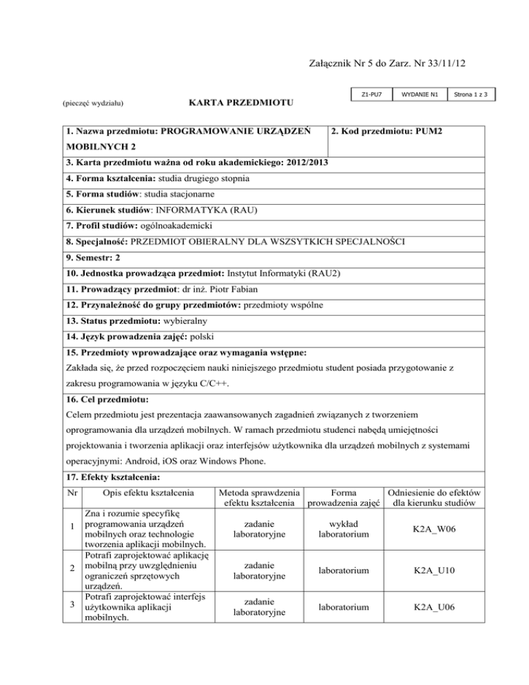 Załącznik Nr 5 do Zarz. Nr 33/11/12 Z1-PU7 (pieczęć wydziału) WYDANIE N1 Strona 1 z 3 KARTA PRZEDMIOTU 1. Nazwa przedmiotu: PROGRAMOWANIE URZĄDZEŃ 2. Kod przedmiotu: PUM2 MOBILNYCH 2 3. Karta przedmiotu ważna od roku akademickiego: 2012/2013 4. Forma kształcenia: studia drugiego stopnia 5. Forma studiów: studia stacjonarne 6. Kierunek studiów: INFORMATYKA (RAU) 7. Profil studiów: ogólnoakademicki 8. Specjalność: PRZEDMIOT OBIERALNY DLA WSZSYTKICH SPECJALNOŚCI 9. Semestr: 2 10. Jednostka prowadząca przedmiot: Instytut Informatyki (RAU2) 11. Prowadzący przedmiot: dr inż. Piotr Fabian 12. Przynależność do grupy przedmiotów: przedmioty wspólne 13. Status przedmiotu: wybieralny 14. Język prowadzenia zajęć: polski 15. Przedmioty wprowadzające oraz wymagania wstępne: Zakłada się, że przed rozpoczęciem nauki niniejszego przedmiotu student posiada przygotowanie z zakresu programowania w języku C/C++. 16. Cel przedmiotu: Celem przedmiotu jest prezentacja zaawansowanych zagadnień związanych z tworzeniem oprogramowania dla urządzeń mobilnych. W ramach przedmiotu studenci nabędą umiejętności projektowania i tworzenia aplikacji oraz interfejsów użytkownika dla urządzeń mobilnych z systemami operacyjnymi: Android, iOS oraz Windows Phone. 17. Efekty kształcenia: Nr 1 2 3 Opis efektu kształcenia Zna i rozumie specyfikę programowania urządzeń mobilnych oraz technologie tworzenia aplikacji mobilnych. Potrafi zaprojektować aplikację mobilną przy uwzględnieniu ograniczeń sprzętowych urządzeń. Potrafi zaprojektować interfejs użytkownika aplikacji mobilnych. Metoda sprawdzenia Forma Odniesienie do efektów efektu kształcenia prowadzenia zajęć dla kierunku studiów zadanie laboratoryjne wykład laboratorium K2A_W06 zadanie laboratoryjne laboratorium K2A_U10 zadanie laboratoryjne laboratorium K2A_U06 4 5 Potrafi korzystać z gotowych bibliotek programistycznych do tworzenia aplikacji mobilnych. Potrafi współdziałać i pracować w grupie przyjmując różne role podczas projektowania i tworzenia aplikacji. zadanie laboratoryjne laboratorium K2_U11 zadanie laboratoryjne laboratorium K2A_K03 18. Formy zajęć dydaktycznych i ich wymiar (liczba godzin) W. 30 Ćw. 0 L. 0 P. 30 Sem. 0 19. Treści kształcenia: Tematyka wykładów: 1. Programowanie w środowisku systemów Android, iOS oraz Windows Phone - wprowadzenie 2. Usługi i wielowątkowość w systemach mobilnych 3. Projektowanie widgetów 4. Programowanie w Objective C 5. Programowanie niskopoziomowe w systemie Android i iOS 6. Przechowywanie oraz przetwarzanie danych w systemach mobilnych 7. Obsługa sensorów 8. Grafika z wykorzystaniem OpenGL ES 9. Aplikacje multimedialne, gry i grafika w systemach mobilnych, optymalizacja aplikacji 10. Wykorzystanie usług Cloud Computing w urządzeniach mobilnych 11. Mobile web i projektowanie aplikacji wieloplatformowych dla urządzeń mobilnych 12. Projektowanie aplikacji dla osób niewidomych 13. Bezpieczeństwo aplikacji mobilnych i systemu operacyjnego Android 14. Komercjalizacja aplikacji dla urządzeń mobilnych 15. Urządzenia mobilne w rehabilitacji procesów poznawczych pacjentów po urazach mózgu Tematyka laboratorium: W ramach zajęć laboratoryjnych realizowany jest projekt aplikacji dla urządzeń mobilnych z systemem operacyjnym Android, iOS, Windows Phone. Studenci indywidualnie lub w grupach kilku osobowych tworzą aplikację mobilną zgodnie z wymaganiami prowadzącego. Aplikacje tworzone są w dedykowanych środowiskach programistycznych oraz uruchamiane i testowane na urządzeniach mobilnych – tabletach i telefonach komórkowych dostępnych w trakcie laboratorium. Warunkiem zaliczenia zajęć jest przedstawienie powstałej aplikacji mobilnej wraz z dokumentacją. 20. Egzamin: nie 21. Literatura podstawowa: 1. Android tworzenie aplikacji. Satya Komatineni, Dave MacLean, Sayed Hashimi 2. Android. Programowanie aplikacji na urządzenia przenośne. Shane Conder,Lauren Darcey 3. Android. Tworzenie aplikacji w oparciu o HTML, CSS i JavaScript. Jonathan Stark, Brian Jepson 4. iOS Podręcznik programisty. Erica Sadun 5. Objective-C. Vademecum profesjonalisty. Stephen G. Kochan 6. Tworzenie efektownych aplikacji Windows Phone 7. Eugene Chuvyrov, Henry Lee 22. Literatura uzupełniająca: 1. Android w praktyce. Charlie Collins, Michael Galpin, Matthias Kaeppler 2. Tworzenie aplikacji na platformę iOS z wykorzystaniem Xcode, Interface Builder, Instruments, GDB oraz innych kluczowych narzędzi. Brandon Alexander, J. Bradford Dillon, Kevin Y. Kim 23. Nakład pracy studenta potrzebny do osiągnięcia efektów kształcenia Lp. Forma zajęć 1 Wykład 2 Ćwiczenia 3 Laboratorium 4 Projekt 5 Seminarium / 6 Inne / Suma godzin Liczba godzin kontaktowych / pracy studenta 30/30 / 0/0 30/30 60/60 24. Suma wszystkich godzin: 120 25. Liczba punktów ECTS: 4 26. Liczba punktów ECTS uzyskanych na zajęciach z bezpośrednim udziałem nauczyciela akademickiego: 2 27. Liczba punktów ECTS uzyskanych na zajęciach o charakterze praktycznym (laboratoria, projekty): 2 26. Uwagi: ----- Zatwierdzono: ……………………………. ………………………………………………… (data i podpis prowadzącego) (data i podpis dyrektora instytutu/kierownika katedry/ Dyrektora Kolegium Języków Obcych/kierownika lub dyrektora jednostki międzywydziałowej)