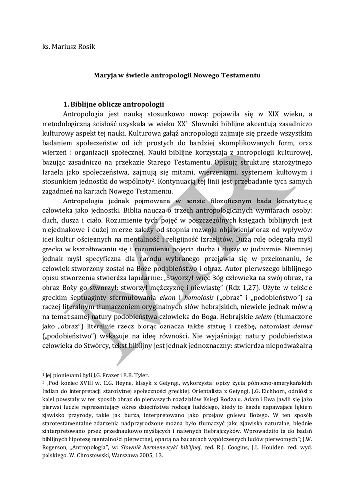 ks. Mariusz Rosik Maryja w świetle antropologii Nowego Testamentu 1. Biblijne oblicze antropologii Antropologia jest nauką stosunkowo nową: pojawiła się w XIX wieku, a metodologiczną ścisłość uzyskała w wieku XX1. Słowniki biblijne akcentują zasadniczo kulturowy aspekt tej nauki. Kulturowa gałąź antropologii zajmuje się przede wszystkim badaniem społeczeństw od ich prostych do bardziej skomplikowanych form, oraz wierzeń i organizacji społecznej. Nauki biblijne korzystają z antropologii kulturowej, bazując zasadniczo na przekazie Starego Testamentu. Opisują strukturę starożytnego Izraela jako społeczeństwa, zajmują się mitami, wierzeniami, systemem kultowym i stosunkiem jednostki do wspólnoty2. Kontynuacją tej linii jest przebadanie tych samych zagadnień na kartach Nowego Testamentu. Antropologia jednak pojmowana w sensie filozoficznym bada konstytucję człowieka jako jednostki. Biblia naucza o trzech antropologicznych wymiarach osoby: duch, dusza i ciało. Rozumienie tych pojęć w poszczególnych księgach biblijnych jest niejednakowe i dużej mierze zależy od stopnia rozwoju objawienia oraz od wpływów idei kultur ościennych na mentalność i religijność Izraelitów. Dużą rolę odegrała myśl grecka w kształtowaniu się i rozumieniu pojęcia ducha i duszy w judaizmie. Niemniej jednak myśl specyficzna dla narodu wybranego przejawia się w przekonaniu, że człowiek stworzony został na Boże podobieństwo i obraz. Autor pierwszego biblijnego opisu stworzenia stwierdza lapidarnie: „Stworzył więc Bóg człowieka na swój obraz, na obraz Boży go stworzył: stworzył mężczyznę i niewiastę” (Rdz 1,27). Użyte w tekście greckim Septuaginty sformułowania eikon i homoiosis („obraz” i „podobieństwo”) są raczej literalnym tłumaczeniem oryginalnych słów hebrajskich, niewiele jednak mówią na temat samej natury podobieństwa człowieka do Boga. Hebrajskie selem (tłumaczone jako „obraz”) literalnie rzecz biorąc oznacza także statuę i rzeźbę, natomiast demut („podobieństwo”) wskazuje na ideę równości. Nie wyjaśniając natury podobieństwa człowieka do Stwórcy, tekst biblijny jest jednak jednoznaczny: stwierdza niepodważalną 1 Jej pionierami byli J.G. Frazer i E.B. Tyler. 2 „Pod koniec XVIII w. C.G. Heyne, klasyk z Getyngi, wykorzystał opisy życia północno-‐amerykańskich Indian do interpretacji starożytnej społeczności greckiej. Orientalista z Getyngi, J.G. Eichhorn, odniósł z kolei powstały w ten sposób obraz do pierwszych rozdziałów Księgi Rodzaju. Adam i Ewa jawili się jako pierwsi ludzie reprezentujący okres dzieciństwa rodzaju ludzkiego, kiedy to każde napawające lękiem zjawisko przyrody, takie jak burza, interpretowano jako przejaw gniewu Bożego. W ten sposób starotestamentalne zdarzenia nadprzyrodzone można było tłumaczyć jako zjawiska naturalne, błędnie zinterpretowano przez przednaukowo myślących i naiwnych Hebrajczyków. Wprowadziło to do badań biblijnych hipotezę mentalności pierwotnej, opartą na badaniach współczesnych ludów pierwotnych”; J.W. Rogerson, „Antropologia”, w: Słownik hermeneutyki biblijnej, red. R.J. Coogins, J.L. Houlden, red. wyd. polskiego. W. Chrostowski, Warszawa 2005, 13. godność, jaką Bóg obdarzył ludzi, stwarzając ich na swoje podobieństwo, jakkolwiek by je rozumieć. Zasadniczą kategorią antropologiczną w Nowym Testamencie jest coraz klarowniejsze rozumienie roli Chrystusa – Boga i człowieka – w dziejach zbawienia. B. Widła argumentuje, że chrześcijanie przyjmują za podstawę antropologicznych rozważań przekonanie, iż pierwszy człowiek, Adam, jest typem Chrystusa, „protoplasty ludzkości nowej”, którego dziełem są łaska i życie3. Przywołać tu można fragment Pawłowego listu do mieszkańców Rzymu: „Dlatego też jak przez jednego człowieka grzech wszedł na świat, a przez grzech śmierć, i w ten sposób śmierć przeszła na wszystkich ludzi, ponieważ wszyscy zgrzeszyli... Bo i przed Prawem grzech był na świecie, grzechu się jednak nie poczytuje, gdy nie ma Prawa. A przecież śmierć rozpanoszyła się od Adama do Mojżesza nawet nad tymi, którzy nie zgrzeszyli przestępstwem na wzór Adama. On to jest typem Tego, który miał przyjść. Ale nie tak samo ma się rzecz z przestępstwem jak z darem łaski. Jeżeli bowiem przestępstwo jednego sprowadziło na wszystkich śmierć, to o ileż obficiej spłynęła na nich wszystkich łaska i dar Boży, łaskawie udzielony przez jednego Człowieka, Jezusa Chrystusa. I nie tak samo ma się rzecz z tym darem jak i ze skutkiem grzechu, spowodowanym przez jednego grzeszącego. Gdy bowiem jeden tylko grzech przynosi wyrok potępiający, to łaska przynosi usprawiedliwienie ze wszystkich grzechów. Jeżeli bowiem przez przestępstwo jednego śmierć zakrólowała z powodu jego jednego, o ileż bardziej ci, którzy otrzymują obfitość łaski i daru sprawiedliwości, królować będą w życiu z powodu Jednego -‐ Jezusa Chrystusa” (Rz 5,12-‐17). Tak więc od czasów Chrystusa można mówić o antropologii przesyconej nadzieją realizacji doskonałości i pełni na wzór Syna Bożego, który stał się człowiekiem. „Słowo (Logos) zamieszkało wśród nas” – oznajmia św. Jan. Używa przy tym obrazowego języka, mówiąc o „rozbiciu namiotu”. W uszach żydowskiego słuchacza takie sformułowanie musiało budzić jednoznaczne skojarzenia z wędrówką Izraelitów przez pustynię ku ziemi obiecanej dawnymi czasy ich ojcom. Wówczas to chwała Boża zstępowała do Namiotu Spotkania i w ten sposób Bóg obecny był pośród swojego ludu: „Wtedy o obłok okrył Namiot Spotkania, a chwała Pana napełniła przybytek” (Wj 40,34). Janowa intencja nawiązania do wątku namiotu na pustyni uwidacznia się jeszcze bardziej poprzez wykorzystanie motywu chwały (J 1, 14b): motyw ten występuje zarówno w opowiadaniu z Księgi Wyjścia, ja