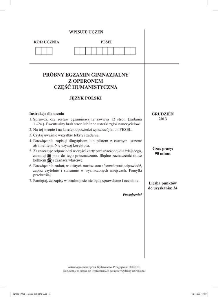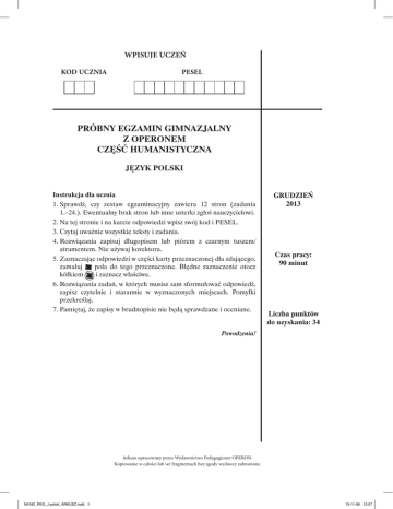 WPISUJE UCZEŃ KOD UCZNIA PESEL PRÓBNY EGZAMIN GIMNAZJALNY Z OPERONEM CZĘŚĆ HUMANISTYCZNA JĘZYK POLSKI Instrukcja dla ucznia 1. Sprawdź, czy zestaw egzaminacyjny zawiera 12 stron (zadania 1.–24.). Ewentualny brak stron lub inne usterki zgłoś nauczycielowi. 2. Na tej stronie i na karcie odpowiedzi wpisz swój kod i PESEL. 3. Czytaj uważnie wszystkie teksty i zadania. 4. Rozwiązania zapisuj długopisem lub piórem z czarnym tuszem/ atramentem. Nie używaj korektora. 5. Zaznaczając odpowiedzi w części karty przeznaczonej dla zdającego, zamaluj A pola do tego przeznaczone. Błędne zaznaczenie otocz kółkiem A i zaznacz właściwe. 6. R ozwiązania zadań, w których musisz sam sformułować odpowiedź, zapisz czytelnie i starannie w wyznaczonych miejscach. Pomyłki przekreślaj. 7. P amiętaj, że zapisy w brudnopisie nie będą sprawdzane i oceniane. GRUDZIEŃ 2013 Czas pracy: 90 minut Liczba punktów do uzyskania: 34 Powodzenia! Arkusz opracowany przez Wydawnictwo Pedagogiczne OPERON. Kopiowanie w całości lub we fragmentach bez zgody wydawcy zabronione. N5182_PEG_J polski_ARKUSZ.indd 1 13-11-06 12:57 Język polski Próbny Egzamin Gimnazjalny z OPERONEM i „Gazetą Wyborczą” Źródło mądrości Tekst I Przeczytaj tekst i wykonaj zadania 1.–5. mądrość ż V, DCMs. ~ści 1. blm «wiedza nabyta przez naukę lub doświadczenie, umiejętność jej wykorzystania, zastosowania; rozumienie świata i ludzi, wiedza o nich; rozum, rozsądek»: Nabierać mądrości. ∆ Zęby mądrości «ostatnie tylne zęby trzonowe, wyrzynające się dopiero po szesnastym roku życia» ◊ fraz. Mądrość książkowa «wiedza zaczerpnięta z książek, nieprzydatna w życiu praktycznym, nieżyciowa, teoretyczna» ◊ Mądrość życiowa «umiejętność radzenia sobie w życiu, płynąca z doświadczenia życiowego, z praktycznego ustosunkowania się do życia» 2. blm «to, że coś jest mądre»: Mądrość opinii, sądów; powieści. 3. blm «umiejętność szybkiego orientowania się, spryt, przebiegłość, przemyślność (potocznie także w stosunku do zwierząt)»: Psia mądrość. Mądrość ptaków. 4. zwykle w lm, pot. «mądre poglądy, powiedzenia, wypowiedzi; często ironicznie: o rzeczach pozornie mądrych, trudnych, a w rzeczywistości niezbyt skomplikowanych»: Uczyć się różnych mądrości. A to ci mądrość! Słownik języka polskiego, pod red. prof. Mieczysława Szymczaka, t. II, Warszawa 1995, s. 122. Zadanie 1. (0–1) Powyższy artykuł hasłowy wyrazu „mądrość” wyjaśnia jego A. budowę. B. pisownię. C. znaczenie. D. pochodzenie. Zadanie 2. (0–1) W tabeli znajdują się informacje dotyczące artykułu hasłowego wyrazu „mądrość” ze Słownika języka polskiego. Wskaż tę informację, która jest fałszywa – zaznacz F we właściwym miejscu. 1. W każdej definicji wyrazu hasłowego podano co najmniej jeden przykład jego użycia. F 2. Wyraz „mądrość” w każdym ze swoich znaczeń występuje wyłącznie w liczbie mnogiej. F 3. W odmianie wyrazu „mądrość” w trzech przypadkach występuje identyczna końcówka fleksyjna. F Zadanie 3. (0–1) Artykuł hasłowy wyrazu „mądrość” zawiera związek frazeologiczny A. mądre poglądy. B. mądrość sądów. C. mądrość ptaków. D. mądrość książkowa. 2 N5182_PEG_J polski_ARKUSZ.indd 2 Przenieś rozwiązania na kartę odpowiedzi! 13-11-06 12:57 Język polski Próbny Egzamin Gimnazjalny z OPERONEM i „Gazetą Wyborczą” Zadanie 4. (0–1) Wyraz „mądrość” utworzono od wyrazu A. mądry. B. mądrze. C. mądrala. D. mędrzec. Zadanie 5. (0–1) Dokończ poniższe zdanie, wybierając odpowiedź spośród podanych poniżej. Wyrazem pochodnym, w którym znajduje się formant o takiej samej funkcji jak w słowie „mądrość”, jest A. badacz. B. ślepota. C. pralnia. D. marzenie. Tekst II Przeczytaj tekst i wykonaj zadania 6.–15. Filozof dysputował1 o prym2 z oratorem3. Gdy się długo męczyli mniej potrzebnym wsporem4, Nadszedł chłop. „Niech nas sądzi” – rzekli razem oba, „Co ci się – rzekł filozof – bardziej upodoba? Czy ten, który rzecz nową stwarza i wymyśla, Czy ten, co wymyśloną kształci i określa?” „My się na tym – chłop rzecze – prostacy, nie znamy. Wolałbym jednak obraz aniżeli ramy.” 1 dysputować – dyskutować. prym – pierwszeństwo w czymś, pierwsze miejsce, przodowanie. 3 orator – mówca. 4 wspór – spór. 2 Ignacy Krasicki, Filozof i orator [w:] Ignacy Krasicki, Bajki, przypowieści, satyry, Rzeszów 1986. Zadanie 6. (0–1) Narratorem w bajce Filozof i orator jest A. chłop. B. filozof. C. autor utworu. D. postać nieznana. Przenieś rozwiązania na kartę odpowiedzi! N5182_PEG_J polski_ARKUSZ.indd 3 3 13-11-06 12:57 Język polski Próbny Egzamin Gimnazjalny z OPERONEM i „Gazetą Wyborczą” Zadanie 7. (0–1) Z treści bajki Filozof i orator wynika, że spór bohaterów dotyczył tego, który z nich A. jest mądrzejszy i bardziej wykształcony. B. precyzyjniej przedstawia swoje stanowisko. C. dokonuje rzeczy ważniejszych i wartościowszych. D. posługuje się bogatszym i barwniejszym językiem. Zadanie 8. (0–1) Chłop został poproszony o to, by A. przyznał rację filozofowi. B. rozstrzygnął spór, który wiedli uczeni. C. włączył się do dyskusji filozofa i oratora. D. przedstawił swoje poglądy na temat sztuki. Zadanie 9. (0–1) Odpowiedź udzielona przez chłopa świadczy o tym, że A. nie rozumie pytania filozofa. B. jest znawcą w dziedzinie malarstwa. C. ceni działania przynoszące konkretne efekty. D. przedkłada formę wypowiedzi nad jej znaczenie. Zadanie 10. (0–1) Który ze zwrotów jest metaforyczną oceną postawy chłopa? A. buja w obłokach B. trzyma się ziemi C. widzi wszystko w czarnych barwach D. patrzy na świat przez różowe okulary Zadanie 11. (0–1) W tabeli znajdują się informacje na temat bajki Filozof i orator Ignacego Krasickiego. Wskaż informację, która jest 