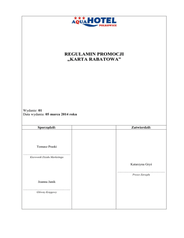 REGULAMIN PROMOCJI „KARTA RABATOWA” Wydanie: 01 Data wydania: 05 marca 2014 roku Sporządził: Zatwierdził: Tomasz Praski …………………………………… Kierownik Działu Marketingu Katarzyna Gryś …………………………………… Prezes Zarządu Joanna Janik …………………………………… Główny Księgowy 1. 2. 3. 4. §1 Postanowienia Ogólne Niniejszy Regulamin określa zasady korzystania z „Karty rabatowej”. Podmiotem odpowiedzialnym za promocyjną „Kartę rabatową” jest Aqua Hotel S.A. mająca siedzibę w Polkowicach przy ulicy Młyńskiej 6. Rabaty na podstawie „Karty rabatowej” udzielane będą od 05.03.2014r. do 31.12.2014r. Prawa związane z korzystaniem z „Karty rabatowej” nie mogą być sprzedawane, przenoszone, zbywane w inny sposób, ani nie mogą być przedmiotem żadnych innych czynności z wyjątkiem tych, które zostały określone w niniejszym Regulaminie Programu. §2 Uczestnictwo w Programie 1. „Karta rabatowa” jest kartą przeznaczonym dla Klientów restauracji Aqua Hotelu. 2. „Karta rabatowa” nie jest kartą imienną i jest realizowana za okazaniem. 1. 2. 1. 2. 3. 4. 5. §3 Karta Rabatowa Uczestnik przystępując do promocji otrzymuje do użytkowania „Kartę rabatową”, której wzór stanowi Załącznik nr 1 do Regulaminu promocji. „Karta rabatowa” jest ważna przez cały okres trwania promocji z zastrzeżeniem zapisów zawartych w § 6 ust. 1. §4 Rabat Cenowy Ustala się w ramach promocji „Karty rabatowej” jednorazowy 30% rabat cenowy dla osób fizycznych na cały asortyment restauracji Aqua Hotelu z wyłączeniem napoi alkoholowych. Prawo do korzystania z rabatu, o którym mowa w ust. 1 przysługuje wyłącznie posiadaczom „Karty rabatowej” wraz z osobami towarzyszącymi (maksymalnie do 8 os.) z wyłączeniem imprez zorganizowanych (wesela, komunie, chrzciny, dyskoteki dorosłego człowieka itp.). Realizacja rabatu następuje każdorazowo po okazaniu kelnerowi „Karty rabatowej” przed złożeniem zamówienia. Rabat cenowy nie łączy się z żadnymi innymi dodatkowymi akcjami promocyjnymi oraz rabatami. Aqua Hotel zastrzega sobie prawo do ustalania i dokonywania zmian w menu oraz przyznawaniu rabatów. §5 Utrata statusu Uczestnika Programu 1. Aqua Hotel może wykluczyć Uczestnika promocji „Karty rabatowej” ze skutkiem natychmiastowym jeżeli Uczestnik nie przestrzega zasad Regulaminu Promocji. §6 Zakończenie Programu 1. Aqua Hotel zastrzega sobie prawo do zawieszenia lub zakończenia promocji „Karty rabatowej” przed terminem określonym w §1 ust 3. 2. Aqua Hotel w przypadku zawieszenia lub zakończenia promocji „Karty rabatowej” zobowiązany jest do umieszczenia informacji o zawieszeniu lub zakończeniu działalności promocji na stronie internetowej hotelu. §7 Zmiany Regulaminu Programu 1. Aqua Hotel zastrzega sobie prawo do wprowadzania zmian w Regulaminie promocji w każdym momencie. 2. W przypadku wprowadzenia zmian, o których mowa w ust. 1 Aqua Hotel każdorazowo udostępni ujednolicony tekst zmienionego Regulaminu Promocji na stronie internetowej hotelu. §8 Akceptacja Regulaminu 1. Niniejszy Regulamin „Karty rabatowej” będzie uznany za zaakceptowany przez Uczestnika promocji z chwilą pierwszego użycia karty wydanej Uczestnikowi. 2. Szczegółowe informacje o Promocji można uzyskać pod numerem telefonu 0-76 746-27-80. §9 Postanowienia końcowe W przypadkach, o których mowa w §5, §6 i §7 niniejszego Regulaminu, Uczestnikom promocji nie będą przysługiwały żadne roszczenia względem Organizatora promocji. Załącznik nr 1