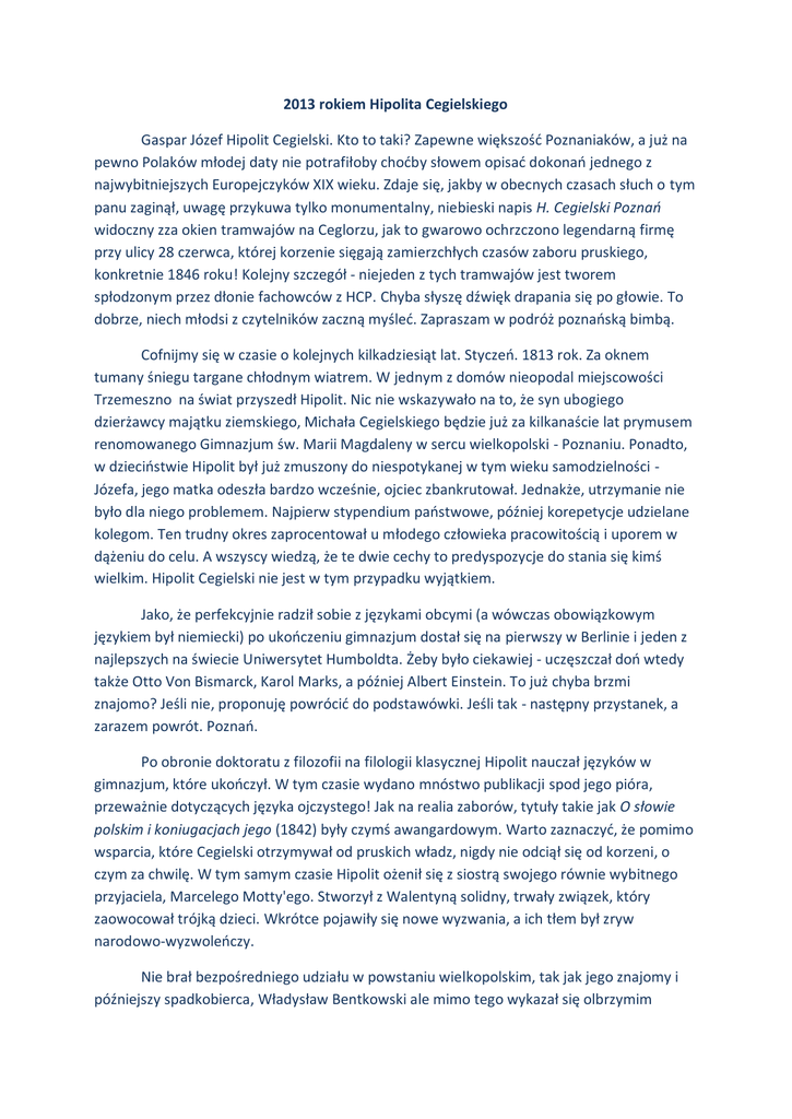 2013 rokiem Hipolita Cegielskiego Gaspar Józef Hipolit Cegielski. Kto to taki? Zapewne większość Poznaniaków, a już na pewno Polaków młodej daty nie potrafiłoby choćby słowem opisać dokonań jednego z najwybitniejszych Europejczyków XIX wieku. Zdaje się, jakby w obecnych czasach słuch o tym panu zaginął, uwagę przykuwa tylko monumentalny, niebieski napis H. Cegielski Poznań widoczny zza okien tramwajów na Ceglorzu, jak to gwarowo ochrzczono legendarną firmę przy ulicy 28 czerwca, której korzenie sięgają zamierzchłych czasów zaboru pruskiego, konkretnie 1846 roku! Kolejny szczegół - niejeden z tych tramwajów jest tworem spłodzonym przez dłonie fachowców z HCP. Chyba słyszę dźwięk drapania się po głowie. To dobrze, niech młodsi z czytelników zaczną myśleć. Zapraszam w podróż poznańską bimbą. Cofnijmy się w czasie o kolejnych kilkadziesiąt lat. Styczeń. 1813 rok. Za oknem tumany śniegu targane chłodnym wiatrem. W jednym z domów nieopodal miejscowości Trzemeszno na świat przyszedł Hipolit. Nic nie wskazywało na to, że syn ubogiego dzierżawcy majątku ziemskiego, Michała Cegielskiego będzie już za kilkanaście lat prymusem renomowanego Gimnazjum św. Marii Magdaleny w sercu wielkopolski - Poznaniu. Ponadto, w dzieciństwie Hipolit był już zmuszony do niespotykanej w tym wieku samodzielności Józefa, jego matka odeszła bardzo wcześnie, ojciec zbankrutował. Jednakże, utrzymanie nie było dla niego problemem. Najpierw stypendium państwowe, później korepetycje udzielane kolegom. Ten trudny okres zaprocentował u młodego człowieka pracowitością i uporem w dążeniu do celu. A wszyscy wiedzą, że te dwie cechy to predyspozycje do stania się kimś wielkim. Hipolit Cegielski nie jest w tym przypadku wyjątkiem. Jako, że perfekcyjnie radził sobie z językami obcymi (a wówczas obowiązkowym językiem był niemiecki) po ukończeniu gimnazjum dostał się na pierwszy w Berlinie i jeden z najlepszych na świecie Uniwersytet Humboldta. Żeby było ciekawiej - uczęszczał doń wtedy także Otto Von Bismarck, Karol Marks, a później Albert Einstein. To już chyba brzmi znajomo? Jeśli nie, proponuję powrócić do podstawówki. Jeśli tak - następny przystanek, a zarazem powrót. Poznań. Po obronie doktoratu z filozofii na filologii klasycznej Hipolit nauczał języków w gimnazjum, które ukończył. W tym czasie wydano mnóstwo publikacji spod jego pióra, przeważnie dotyczących języka ojczystego! Jak na realia zaborów, tytuły takie jak O słowie polskim i koniugacjach jego (1842) były czymś awangardowym. Warto zaznaczyć, że pomimo wsparcia, które Cegielski otrzymywał od pruskich władz, nigdy nie odciął się od korzeni, o czym za chwilę. W tym samym czasie Hipolit ożenił się z siostrą swojego równie wybitnego przyjaciela, Marcelego Motty'ego. Stworzył z Walentyną solidny, trwały związek, który zaowocował trójką dzieci. Wkrótce pojawiły się nowe wyzwania, a ich tłem był zryw narodowo-wyzwoleńczy. Nie brał bezpośredniego udziału w powstaniu wielkopolskim, tak jak jego znajomy i późniejszy spadkobierca, Władysław Bentkowski ale mimo tego wykazał się olbrzymim patriotyzmem. Odmówił pruskim władzom szkoły przeszukania mieszkań uczniów podejrzanych o konspirację. Na szczęście przeżył ten konflikt, pozbawiony już jednak posady. Był to rok niepewności. Przecież miał wtedy rodzinę, musiał zaspokoić jej potrzeby materialne! I tak naprawdę wtedy właśnie rozpoczęła się jego właściwa praca i kariera, z której zasłynął i słynie do dziś. Wracamy do punktu wyjścia. Koniec września 1946 roku. W budynku hotelu Bazar postawionego przez m.in. Karola Marcinkowskiego zawiązuje się nowe przedsiębiorstwo. Cegielski rozpoczyna sprzedaż narzędzi żelaznych, następnie ofertę wzbogaca w maszyny, szczególnie rolnicze. Bardzo szybko zdobywa dominację na rodzimym rynku przewyższając nawet Niemców i Żydów. Tym samym przechodzi ewolucję, a zarazem metamorfozę. Ze skromnego nauczyciela staje się twardo stąpającym po ziemi biznesmenem. Już kilka lat później otwiera serwis, a idąc za ciosem fabrykę. W połowie lat pięćdziesiątych zatrudniał prawie stu robotników, a jeśli wierzyć licznym zapiskom, traktował ich nienagannie. Można powiedzieć, że do każdego z nich podchodził indywidualnie, zapewniając także podmiejskie wycieczki integracyjne i zakładowe imprezy. Pomyślałby kto, że Cegielski wpadł na ten pomysł już półtora wieku temu! Oprócz prowadzenia molocha o zasięgu międzynarodowym (produkty docierały do Prus, Austrii, Królestwa Polskiego, Rosji i na Śląsk) Cegielski nie zrezygnował z kariery naukowej. Nadal sporo pisał, tak jak wcześniej, głównie w charakterze patriotycznym. Redagował Gazetę Polską. Po jej wycofaniu przez władze, udzielał się w Gońcu Polskim, a następnie w Dzienniku Poznańskim. Należąc do Towarzystwa Naukowej Pomocy (założonego przez Marcinkowskiego) dbał o rozwój dorastających Polaków, szczególnie w kierunkach technicznych, postępowych. Co więcej, był radnym miasta zaliczając także epizod jako poseł sejmu pruskiego, gdzie w osobnej grupie zintegrował polskich polityków. W utworzonym przez siebie Towarzystwie Przyjaciół Nauk realizował się w dbałości o mowę ojczystą i podtrzymywanie narodowej tradycji. Nie lada ciekawostką jest fakt, iż istnieje ono po dziś dzień! Trzy lata przed śmiercią stał się prezesem Centralnego Towarzystwa Gospodarczego. Śmierć nie nadeszła nagle. Przez całe życie był wątłego zdrowia, do tego osłabiła go wytężona praca. Przeziębienie nabyte jesienią 1868 roku przerodziło się w zapalenie płuc. Wizjoner zmarł 30 listopada, pozostawiając firmę z trzema setkami pracowników. Dorobek ten w spadku otrzymał bliski przyjaciel , wyżej wspomniany już Władysław Bentkowski, były żołnierz i poseł sejmu pruskiego, publicys