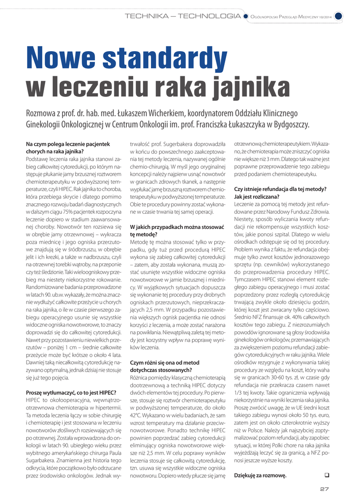TECHNIKA – TECHNOLOGIA Ogólnopolski Przegląd Medyczny 10/2014 Nowe standardy w leczeniu raka jajnika Rozmowa z prof. dr. hab. med. Łukaszem Wicherkiem, koordynatorem Oddziału Klinicznego Ginekologii Onkologicznej w Centrum Onkologii im. prof. Franciszka Łukaszczyka w Bydgoszczy. Na czym polega leczenie pacjentek chorych na raka jajnika? Podstawę leczenia raka jajnika stanowi zabieg całkowitej cytoredukcji, po którym następuje płukanie jamy brzusznej roztworem chemioterapeutyku w podwyższonej temperaturze, czyli HIPEC. Rak jajnika to choroba, która przebiega skrycie i dlatego pomimo znacznego rozwoju badań diagnostycznych w dalszym ciągu 75% pacjentek rozpoczyna leczenie dopiero w stadium zaawansowanej choroby. Nowotwór ten rozsiewa się w obrębie jamy otrzewnowej – wykracza poza miednicę i jego ogniska przerzutowe znajdują się w śródbrzuszu, w obrębie jelit i ich krezki, a także w nadbrzuszu, czyli na otrzewnej torebki wątroby, na przeponie czy też śledzionie. Taki wieloogniskowy przebieg ma niestety niekorzystne rokowanie. Randomizowane badania przeprowadzone w latach 90. ub.w. wykazały, że można znacznie wydłużyć całkowite przeżycie u chorych na raka jajnika, o ile w czasie pierwszego zabiegu operacyjnego usunie się wszystkie widoczne ogniska nowotworowe, to znaczy doprowadzi się do całkowitej cytoredukcji. Nawet przy pozostawieniu niewielkich przerzutów – poniżej 1 cm – średnie całkowite przeżycie może być krótsze o około 4 lata. Dawniej taką niecałkowitą cytoredukcję nazywano optymalną, jednak dzisiaj nie stosuje się już tego pojęcia. Proszę wytłumaczyć, co to jest HIPEC? HIPEC to okołooperacyjna, węwnątrzootrzewnowa chemioterapia w hipertermii. Ta metoda leczenia łączy w sobie chirurgię i chemioterapię i jest stosowana w leczeniu nowotworów złośliwych rozsiewających się po otrzewnej. Została wprowadzona do onkologii w latach 90. ubiegłego wieku przez wybitnego amerykańskiego chirurga Paula Sugarbakera. Znamienna jest historia tego odkrycia, które początkowo było odrzucane przez środowisko onkologów. Jednak wy- trwałość prof. Sugerbakera doprowadziła w końcu do powszechnego zaakceptowania tej metody leczenia, nazywanej ogólnie chemio-chirurgią. W myśl jego oryginalnej koncepcji należy najpierw usnąć nowotwór w granicach zdrowych tkanek, a następnie wypłukać jamę brzuszną roztworem chemioterapeutyku w podwyższonej temperaturze. Obie te procedury powinny zostać wykonane w czasie trwania tej samej operacji. W jakich przypadkach można stosować tę metodę? Metodę tę można stosować tylko w przypadku, gdy tuż przed procedurą HIPEC wykona się zabieg całkowitej cytoredukcji – zatem, aby została wykonana, muszą zostać usunięte wszystkie widoczne ogniska nowotworowe w jamie brzusznej i miednicy. W wyjątkowych sytuacjach dopuszcza się wykonanie tej procedury przy drobnych ogniskach przerzutowych, nieprzekraczających 2,5 mm. W przypadku pozostawienia większych ognisk pacjentka nie odnosi korzyści z leczenia, a może zostać narażona na powikłania. Niewątpliwą zaletą tej metody jest korzystny wpływ na poprawę wyników leczenia. Czym różni się ona od metod dotychczas stosowanych? Różnica pomiędzy klasyczną chemioterapią dootrzewnową a techniką HIPEC dotyczy dwóch elementów tej procedury. Po pierwsze, stosuje się roztwór chemioterapeutyku w podwyższonej temperaturze, do około 42°C. Wykazano w wielu badaniach, że sam wzrost temperatury ma działanie przeciwnowotworowe. Ponadto technikę HIPEC powinien poprzedzać zabieg cytoredukcji eliminujący ogniska nowotworowe większe niż 2,5 mm. W celu poprawy wyników leczenia stosuje się całkowitą cytoredukcję, tzn. usuwa się wszystkie widoczne ogniska nowotworu. Dopiero wtedy płucze się jamę otrzewnową chemioterapeutykiem. Wykazano, że chemioterapia może zniszczyć ogniska nie większe niż 3 mm. Dlatego tak ważne jest poprawne przeprowadzenie tego zabiegu przed podaniem chemioterapeutyku. Czy istnieje refundacja dla tej metody? Jak jest rozliczana? Leczenie za pomocą tej metody jest refundowane przez Narodowy Fundusz Zdrowia. Niestety, sposób wyliczania kwoty refundacji nie rekompensuje wszystkich kosztów, jakie ponosi szpital. Dlatego w wielu ośrodkach odstępuje się od tej procedury. Problem wynika z faktu, że refundacja obejmuje tylko zwrot kosztów jednorazowego sprzętu (np. cewników) wykorzystanego do przeprowadzenia procedury HIPEC. Tymczasem HIPEC stanowi element rozległego zabiegu operacyjnego i musi zostać poprzedzony przez rozległą cytoredukcję trwającą zwykle około dziesięciu godzin, której koszt jest zwracany tylko częściowo. Średnio NFZ finansuje ok. 40% całkowitych kosztów tego zabiegu. Z niezrozumiałych powodów ignorowane są głosy środowiska ginekologów onkologów, przemawiających za zwiększeniem poziomu refundacji zabiegów cytoredukcyjnych w raku jajnika. Wiele ośrodków rezygnuje z wykonywania takiej procedury ze względu na koszt, który waha się w granicach 30-60 tys. zł, w czasie gdy refundacja nie przekracza czasem nawet 1/3 tej kwoty. Takie ograniczenia wpływają niekorzystnie na wyniki leczenia raka jajnika. Proszę zwrócić uwagę, że w UE średni koszt takiego zabiegu wynosi około 50 tys. euro, zatem jest on około czterokrotnie wyższy niż w Polsce. Należy jak najszybciej zoptymalizować poziom refundacji, aby zapobiec sytuacji, w której Polki chore na raka jajnika wyjeżdżają leczyć się za granicą, a NFZ ponosi jeszcze wyższe koszty. Dziękuję za rozmowę. q 27