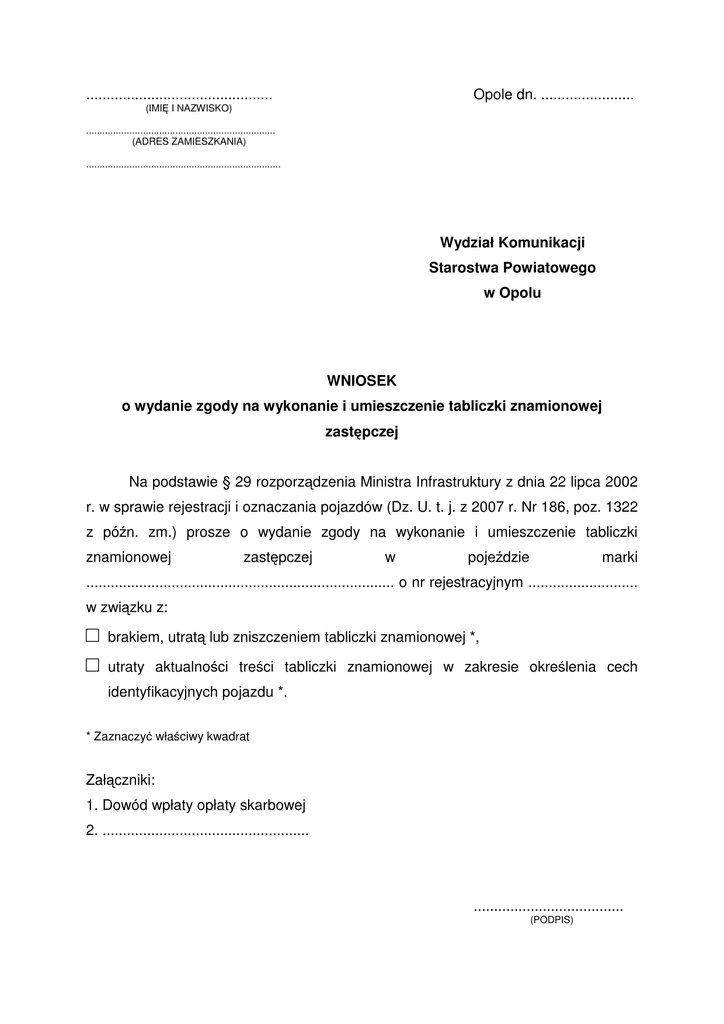 .............................................. Opole dn. ....................... (IMIĘ I NAZWISKO) ...................................................................... (ADRES ZAMIESZKANIA) ........................................................................ Wydział Komunikacji Starostwa Powiatowego w Opolu WNIOSEK o wydanie zgody na wykonanie i umieszczenie tabliczki znamionowej zastępczej Na podstawie § 29 rozporządzenia Ministra Infrastruktury z dnia 22 lipca 2002 r. w sprawie rejestracji i oznaczania pojazdów (Dz. U. t. j. z 2007 r. Nr 186, poz. 1322 z późn. zm.) prosze o wydanie zgody na wykonanie i umieszczenie tabliczki znamionowej zastępczej w pojeździe marki ............................................................................ o nr rejestracyjnym ........................... w związku z: □ □ brakiem, utratą lub zniszczeniem tabliczki znamionowej *, utraty aktualności treści tabliczki znamionowej w zakresie określenia cech identyfikacyjnych pojazdu *. * Zaznaczyć właściwy kwadrat Załączniki: 1. Dowód wpłaty opłaty skarbowej 2. ................................................... ..................................... (PODPIS)