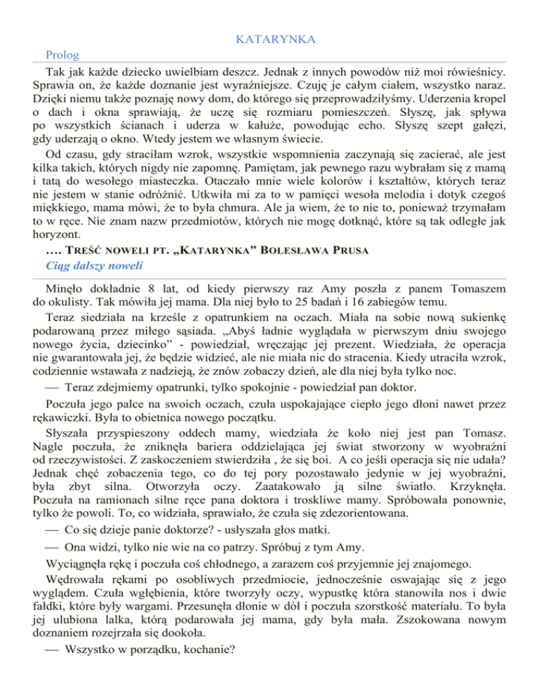 KATARYNKA Prolog Tak jak każde dziecko uwielbiam deszcz. Jednak z innych powodów niż moi rówieśnicy. Sprawia on, że każde doznanie jest wyraźniejsze. Czuję je całym ciałem, wszystko naraz. Dzięki niemu także poznaję nowy dom, do którego się przeprowadziłyśmy. Uderzenia kropel o dach i okna sprawiają, że uczę się rozmiaru pomieszczeń. Słyszę, jak spływa po wszystkich ścianach i uderza w kałuże, powodując echo. Słyszę szept gałęzi, gdy uderzają o okno. Wtedy jestem we własnym świecie. Od czasu, gdy straciłam wzrok, wszystkie wspomnienia zaczynają się zacierać, ale jest kilka takich, których nigdy nie zapomnę. Pamiętam, jak pewnego razu wybrałam się z mamą i tatą do wesołego miasteczka. Otaczało mnie wiele kolorów i kształtów, których teraz nie jestem w stanie odróżnić. Utkwiła mi za to w pamięci wesoła melodia i dotyk czegoś miękkiego, mama mówi, że to była chmura. Ale ja wiem, że to nie to, ponieważ trzymałam to w ręce. Nie znam nazw przedmiotów, których nie mogę dotknąć, które są tak odległe jak horyzont. …. TREŚĆ NOWELI PT. „KATARYNKA” BOLESŁAWA PRUSA Ciąg dalszy noweli Minęło dokładnie 8 lat, od kiedy pierwszy raz Amy poszła z panem Tomaszem do okulisty. Tak mówiła jej mama. Dla niej było to 25 badań i 16 zabiegów temu. Teraz siedziała na krześle z opatrunkiem na oczach. Miała na sobie nową sukienkę podarowaną przez miłego sąsiada. „Abyś ładnie wyglądała w pierwszym dniu swojego nowego życia, dziecinko” - powiedział, wręczając jej prezent. Wiedziała, że operacja nie gwarantowała jej, że będzie widzieć, ale nie miała nic do stracenia. Kiedy utraciła wzrok, codziennie wstawała z nadzieją, że znów zobaczy dzień, ale dla niej była tylko noc. Teraz zdejmiemy opatrunki, tylko spokojnie - powiedział pan doktor. Poczuła jego palce na swoich oczach, czuła uspokajające ciepło jego dłoni nawet przez rękawiczki. Była to obietnica nowego początku. Słyszała przyspieszony oddech mamy, wiedziała że koło niej jest pan Tomasz. Nagle poczuła, że zniknęła bariera oddzielająca jej świat stworzony w wyobraźni od rzeczywistości. Z zaskoczeniem stwierdziła , że się boi. A co jeśli operacja się nie udała? Jednak chęć zobaczenia tego, co do tej pory pozostawało jedynie w jej wyobraźni, była zbyt silna. Otworzyła oczy. Zaatakowało ją silne światło. Krzyknęła. Poczuła na ramionach silne ręce pana doktora i troskliwe mamy. Spróbowała ponownie, tylko że powoli. To, co widziała, sprawiało, że czuła się zdezorientowana. Co się dzieje panie doktorze? - usłyszała głos matki. Ona widzi, tylko nie wie na co patrzy. Spróbuj z tym Amy. Wyciągnęła rękę i poczuła coś chłodnego, a zarazem coś przyjemnie jej znajomego. Wędrowała rękami po osobliwych przedmiocie, jednocześnie oswajając się z jego wyglądem. Czuła wgłębienia, które tworzyły oczy, wypustkę która stanowiła nos i dwie fałdki, które były wargami. Przesunęła dłonie w dół i poczuła szorstkość materiału. To była jej ulubiona lalka, którą podarowała jej mama, gdy była mała. Zszokowana nowym doznaniem rozejrzała się dookoła. Wszystko w porządku, kochanie? Zobaczyła przed sobą twarz kobiety. Zanim zdołała zahamować odruch, już błądziła opuszkami palców po jej twarzy. Z zachwytem stwierdziła, że to jej mama. Na dziś wystarczy. - powiedział doktor Muler - Dajmy odpocząć twoim oczom. I znów była noc. Usłyszała chód pana Tomasza, który pomógł jej ułożyć się do łóżka. Poczuła pocałunek mamy na policzku, ten który zawsze towarzyszył jej zasypianiu. *** Pozwoli pani, że panią zbadam. Zanim zdążyła odpowiedzieć poczuła dotyk na swojej twarzy. Dobrze. Proszę teraz otworzyć oczy i powiedzieć, co trzymam w rękach. Nie mogła tego nazwać, nigdy czegoś takiego nie widziała. Wyciągnęła rękę. Przedmiot był gładki i jakby pokryty cienką warstwą wosku. Od razu wiedziała, co to jest. To jabłko. Wspaniale - odrzekł pan doktor. Ale przecież musiała tego dotknąć, by to rozpoznać - powiedział lekko podniesionym głosem pan Tomasz. Wiem, że oczekiwali państwo przełomu. Jednak teraz jej problemem nie jest wzrok. Amy oczy widzą, ale umysł nie nauczył się przetwarzać informacji, więc jest ślepy. Ale pomoże jej pan, prawda? - spytała zatroskana mama. Nie istnieje żaden podręcznik na temat osób takich jak pani córka, które po tylu latach odzyskują wzrok. Ona widzi, tylko musi nauczyć się patrzeć. *** Amy z każdym dniem poznawała nowe rzeczy, głównie za pomocą dotyku, jednocześnie oswajając się z ich wyglądem i nazwami. Radował ją każdy przedmiot, który zobaczyła. Poznawała także rzeczy, które ją przerażały. Nie umiała zrozumieć, dlaczego ludzie odwracają wzrok, kiedy im się coś nie podoba. „Przecież, świat jest całością, składającą się z rzeczy dobrych i złych” – zwykła mawiać. Gdy po kilku tygodniach nauczyła się poruszać po domu, polegając na zmyśle wzroku, pan Tomasz zabrał ją do parku. Cierpliwie nazywał wszystko, co wskazywała. Amy czuła się jak małe dziecko, choć miała przecież szesnaście lat. Dziewczyna miała jednak problem z odróżnianiem kolorów i mierzeniem odległości. Trudność sprawiało jej także składanie elementów obrazu w całość. Najwięcej frustracji sprawiała jej jednak nauka czytania, której podjął się pan Tomasz. Siadał koło niej cierpliwie i tłumaczył każdy znaczek zwany przez niego literą. Na początku wydawało się to proste, jednak nie umiała czytać słów. Kiedy dochodziła do ostatniej litery, zapominała już o pierwszej. Wtedy twarz pana Tomasza wyrażała dziwną minę. Co to za spojrzenie? - spytała nagle, zaskakując nauczyciela podczas jednej z lekcji. To smutek kochanie, ale nie martw się, pan doktor ostrzegał, że nie masz pamięci wzrokowej. Następnie wyszedł z pok