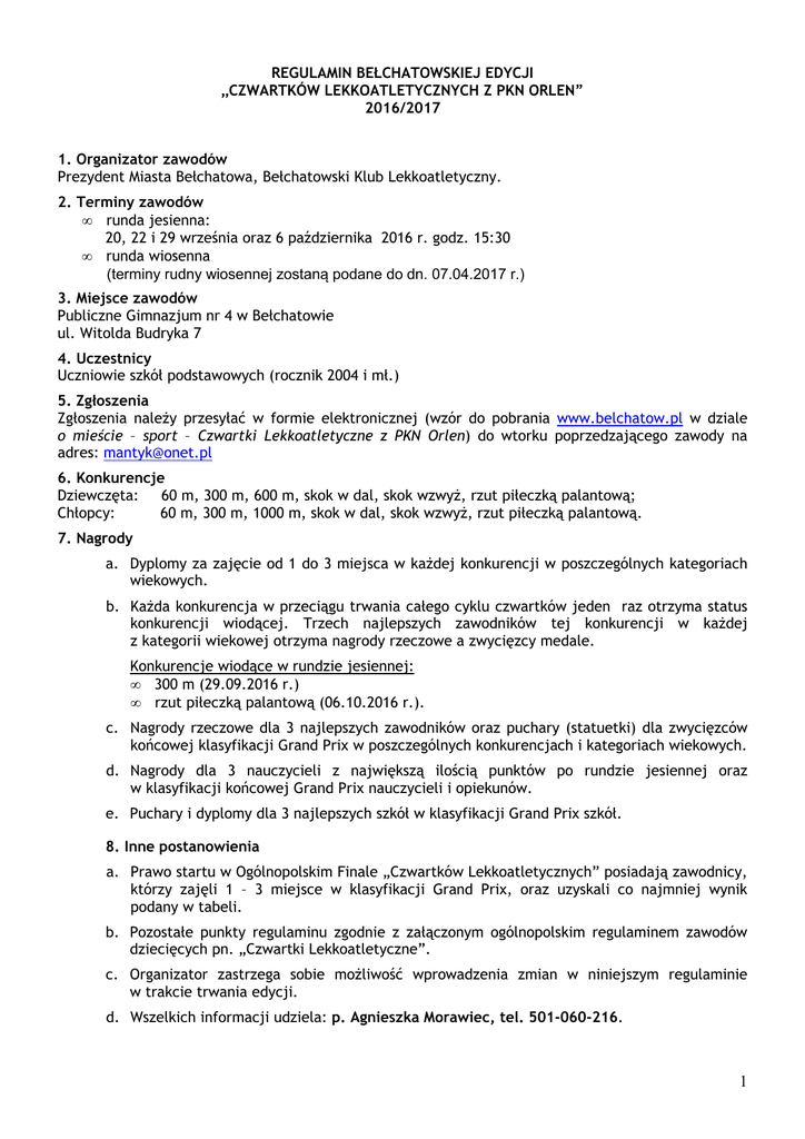 REGULAMIN BEŁCHATOWSKIEJ EDYCJI „CZWARTKÓW LEKKOATLETYCZNYCH Z PKN ORLEN” 2016/2017 1. Organizator zawodów Prezydent Miasta Bełchatowa, Bełchatowski Klub Lekkoatletyczny. 2. Terminy zawodów • runda jesienna: 20, 22 i 29 września oraz 6 października 2016 r. godz. 15:30 • runda wiosenna (terminy rudny wiosennej zostaną podane do dn. 07.04.2017 r.) 3. Miejsce zawodów Publiczne Gimnazjum nr 4 w Bełchatowie ul. Witolda Budryka 7 4. Uczestnicy Uczniowie szkół podstawowych (rocznik 2004 i mł.) 5. Zgłoszenia Zgłoszenia należy przesyłać w formie elektronicznej (wzór do pobrania www.belchatow.pl w dziale o mieście – sport – Czwartki Lekkoatletyczne z PKN Orlen) do wtorku poprzedzającego zawody na adres: [email protected] 6. Konkurencje Dziewczęta: 60 m, 300 m, 600 m, skok w dal, skok wzwyż, rzut piłeczką palantową; Chłopcy: 60 m, 300 m, 1000 m, skok w dal, skok wzwyż, rzut piłeczką palantową. 7. Nagrody a. Dyplomy za zajęcie od 1 do 3 miejsca w każdej konkurencji w poszczególnych kategoriach wiekowych. b. Każda konkurencja w przeciągu trwania całego cyklu czwartków jeden raz otrzyma status konkurencji wiodącej. Trzech najlepszych zawodników tej konkurencji w każdej z kategorii wiekowej otrzyma nagrody rzeczowe a zwycięzcy medale. Konkurencje wiodące w rundzie jesiennej: • 300 m (29.09.2016 r.) • rzut piłeczką palantową (06.10.2016 r.). c. Nagrody rzeczowe dla 3 najlepszych zawodników oraz puchary (statuetki) dla zwycięzców końcowej klasyfikacji Grand Prix w poszczególnych konkurencjach i kategoriach wiekowych. d. Nagrody dla 3 nauczycieli z największą ilością punktów po rundzie jesiennej oraz w klasyfikacji końcowej Grand Prix nauczycieli i opiekunów. e. Puchary i dyplomy dla 3 najlepszych szkół w klasyfikacji Grand Prix szkół. 8. Inne postanowienia a. Prawo startu w Ogólnopolskim Finale „Czwartków Lekkoatletycznych” posiadają zawodnicy, którzy zajęli 1 – 3 miejsce w klasyfikacji Grand Prix, oraz uzyskali co najmniej wynik podany w tabeli. b. Pozostałe punkty regulaminu zgodnie z załączonym ogólnopolskim regulaminem zawodów dziecięcych pn. „Czwartki Lekkoatletyczne”. c. Organizator zastrzega sobie możliwość wprowadzenia zmian w niniejszym regulaminie w trakcie trwania edycji. d. Wszelkich informacji udziela: p. Agnieszka Morawiec, tel. 501-060-216. 1 Tabela minimów dopuszczeniowych do udziału w Ogólnopolskim Finale „Czwartków Lekkoatletycznych” VI klasa V klasa IV klasa chł. dz. chł. dz. chł. dz. 60 m 8,4 8,7 8,8 9,0 9,2 9,3 300 m 45,6 47,5 49,8 51,0 52,8 54,5 600/1000m 3,20 1,58 3,30 2,02 3,39 2,10 rzut p. palantową 53,00 43,00 47,00 36,50 45,00 31,00 skok w dal 4,80 4,30 4,40 4,20 4,05 3,75 skok wzwyż 1,40 1,30 1,25 1,30 1,10 1,05 2