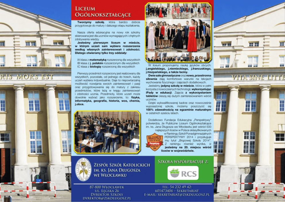 R IS MOR S EST Liceum Ogólnokształcące Liceum Tworzymy szkołę, która bardzo dobrze przygotowuje do matury i dalszego etapu kształcenia. Nasza oferta edukacyjna na nowy rok szkolny skierowana jest dla uczniów wymagających i chętnych zdobywania wiedzy. Jesteśmy pierwszym liceum w mieście, w którym uczeń sam wybiera rozszerzenia według własnych zainteresowań i zdolności. Dlatego otwieramy tylko trzy oddziały: IA klasa z matematyką rozszerzoną dla wszystkich IB klasa z j. polskim rozszerzonym dla wszystkich IC klasa z biologią rozszerzoną dla wszystkich Pierwszy przedmiot rozszerzony jest realizowany dla wszystkich, pozostałe, od jednego do trzech, każdy uczeń wybiera indywidualnie. Daje to niepowtarzalną możliwość rozwijania swoich zainteresowań i pasji oraz przygotowywania się do matury z zakresu przedmiotów, które leżą w kręgu zainteresowań i zdolności ucznia. Przedmioty, które uczeń może dowolnie wybrać jako rozszerzenie, to: fizyka, informatyka, geografia, historia, wos, chemia, j.obce. W liceum proponujemy naukę języków obcych: j.angielskiego, j.niemieckiego, j.francuskiego, j.hiszpańskiego, a także łaciny. Dwie sale gimnastyczne oraz nowa, przestronna siłownia dają komfortowe warunki na lekcjach wychowania fizycznego i zajęciach dodatkowych. Jesteśmy jedyną szkołą w mieście, która w pełni korzysta z nowoczesnych technologii, wykorzystując iPady w edukacji. Zajęcia z wykorzystaniem tabletów cieszą się dużym zainteresowaniem wśród uczniów. Dzięki wykwalifikowanej kadrze oraz nowocześnie wyposażonej szkole, możemy poszczycić się 100% zdawalnością na egzaminie maturalnym w ostatnich sześciu latach. Dodatkowo Fundacja Edukacyjna „Perspektywy” potwierdza, że Publiczne Liceum Ogólnokształcące im. ks. Jana Długosza we Włocławku jest wśród 500 najlepszych liceów w Polsce sklasyfikowanych w Rankingu Szkół Ponadgimnazjalnych PERSPEKTYWY 2014 i przysługuje mu tytuł „Brązowej Szkoły 2014”. Z rankingu również wynika, iż jesteśmy na 20. miejscu wśród liceów w województwie. Zespół Szkół Katolickich im. ks. Jana Długosza we Włocławku 87-800 Włocławek ul. Łęgska 26 Dyrektor Szkoły [email protected] Szkoła współpracuje z: tel. 54 232 49 42; 601473404 – Sekretariat e-mail: [email protected] VITA SINE LITTER Szkoła Podstawowa Co nas wyróżnia: - dzieci codziennie odrabiają zadania domowe w świetlicy (czynnej od 6.45-16.30) pod opieką nauczyciela, dzięki czemu do domu wychodzą bez lekcji a przez to, mogą spędzić czas po zajęciach na zabawie - nasza oferta, czyli nauka w dobrej szkole, która współpracuje z Rodzicami swoich uczniów: bogaty wachlarz zajęć dodatkowych, m.in. szachy, origami, zajęcia plastyczne, nauka gry na gitarze, zajęcia umuzykalniające, korekcyjne, a także nauka języka angielskiego i francuskiego - już od klasy pierwszej poszczególne zajęcia obowiązkowe prowadzą nauczyciele przedmiotów, np. edukację muzyczną, edukację plastyczną, zajęcia z komputerem a także wychowanie fizyczne i lekcje tańca a ponadto: - każdy uczeń ma własną szafkę na ubrania i książki - polecamy smaczne obiady - ogrodzony, pełen zieleni ogród przynależny do terenu szkoły, pozwala na codzienną rekreację zapewniamy: - bezpieczeństwo - dostęp do nowych technologii - tradycyjny model wychowawczy w oparciu o wartości chrześcijańskie Sprawdzony model wychowawczy i rzetelnie prowadzona edukacja są gwarancją dobrej nauki dla najmłodszych długoszaków! - Publiczna Szkoła Podstawowa Publiczne Gimnazjum Publiczne Liceum Internat www.zskdlugosz.pl ZESPÓŁ SZKÓŁ K ATOLICKICH IM. KS. JANA DŁUGOSZA WE WŁOCŁAWKU TO: Szkoła Podstawowa Gimnazjum Nasze gimnazjum od wielu lat pozostaje najlepszą szkołą we Włocławku. Potwierdzają to najwyższe w mieście wyniki egzaminów gimnazjalnych oraz sukcesy naszych gimnazjalistów w Przedmiotowych Konkursach Kuratoryjnych. W bieżącym roku szkolnym uzyskaliśmy 24 tytuły laureata, co daje nam po raz kolejny pierwsze miejsce w mieście. Liceum Gimnazjum Szkoła Podstawowa znajduje się na ulicy Wojska Polskiego 2A, natomiast gimnazjum i liceum na ulicy Łęgskiej 26. Gmach szkoły przy ulicy Łęgskiej został całkowicie odnowiony. Znajdują się tam, m.in.: - nowowybudowana sala gimnastyczna wraz z szatniami i prysznicami, - wyremontowana stara sala gimnastyczna, - sale lekcyjne wyposażone w tablice interaktywne i komputery z dostępem do internetu - stołówka, a w związku z tym możliwość zjedzenia smacznego obiadu - biblioteka z bogatym księgozbiorem oraz czytelnia z dostępem do komputerów i iPadów - komfortowo urządzone pokoje w internacie dla osób spoza Włocławka – jesteśmy jedyną szkołą średnią z własnym internatem, - szatnie dla uczniów wyposażone w zamykane szafki, - świetlica, która jest czynna codziennie od 7.00-16.30 (piątek do 16.00) - kaplica, - aula wraz ze sceną i nagłośnieniem. - na terenie szkoły dostęp do wi-fi Sfera duchowa Corocznie organizujemy Dni Kultury Chrześcijańskiej oraz bierzemy udział w: - pielgrzymce maturzystów do Częstochowy, pielgrzymce III-ich klas gimnazjum do Lichenia oraz w Forum Młodzieży Szkół Katolickich na Jasnej Górze Dodatkowo uczestniczymy w procesji Bożego Ciała. - w szkolnej kaplicy możliwość codziennego uczestniczenia w Mszy św. - dyżury liturgiczne klas Rozrywka - prężnie działający Samorząd Uczniowski, który organizuje dyskoteki, akcje charytatywne itp. - wyjścia do kina oraz wycieczki krajowe i zagraniczne (m.in. Berlin, Paryż, Londyn) - przedstawienia i koncerty. Pomoc finansowa i zajęcia dodatkowe Aby wspomóc finansowo młodzież naszej szkoły, przyznajemy nagrody finansowe dla laureatów konkursów przedmiotowych i olimpiad ogólnopolskich oraz stypendia dla najzdolniejszej młodzieży. ZSK uczestniczy również w programie stypendiów socjalnych. Długoszacy mogą również liczyć na szerok