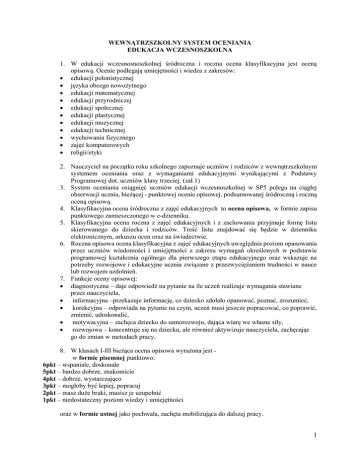 WEWNĄTRZSZKOLNY SYSTEM OCENIANIA EDUKACJA WCZESNOSZKOLNA 1. W edukacji wczesnosnoszkolnej śródroczna i roczna ocena klasyfikacyjna jest oceną opisową. Ocenie podlegają umiejętności i wiedza z zakresów: edukacji polonistycznej języka obcego nowożytnego edukacji matematycznej edukacji przyrodniczej edukacji społecznej edukacji plastycznej edukacji muzycznej edukacji technicznej wychowania fizycznego zajęć komputerowych religii/etyki 2. Nauczyciel na początku roku szkolnego zapoznaje uczniów i rodziców z wewnątrzszkolnym systemem oceniania oraz z wymaganiami edukacyjnymi wynikającymi z Podstawy Programowej dot. uczniów klasy trzeciej. (zał.1) 3. System oceniania osiągnięć uczniów edukacji wczesnoszkolnej w SP5 polega na ciągłej obserwacji ucznia, bieżącej - punktowej ocenie opisowej, podsumowanej śródroczną i roczną oceną opisową. 4. Klasyfikacyjna ocena śródroczna z zajęć edukacyjnych to ocena opisowa, w formie zapisu punktowego zamieszczonego w e-dzienniku. 5. Klasyfikacyjna ocena roczna z zajęć edukacyjnych i z zachowania przyjmuje formę listu skierowanego do dziecka i rodziców. Treść listu znajdować się będzie w dzienniku elektronicznym, arkuszu ocen oraz na świadectwie. 6. Roczna opisowa ocena klasyfikacyjna z zajęć edukacyjnych uwzględnia poziom opanowania przez uczniów wiadomości i umiejętności z zakresu wymagań określonych w podstawie programowej kształcenia ogólnego dla pierwszego etapu edukacyjnego oraz wskazuje na potrzeby rozwojowe i edukacyjne ucznia związane z przezwyciężaniem trudności w nauce lub rozwojem uzdolnień. 7. Funkcje oceny opisowej: diagnostyczna – daje odpowiedź na pytanie na ile uczeń realizuje wymagania stawiane przez nauczyciela, informacyjna –przekazuje informację, co dziecko zdołało opanować, poznać, zrozumieć, korekcyjna – odpowiada na pytanie na czym, uczeń musi jeszcze popracować, co poprawić, zmienić, udoskonalić, motywacyjna – zachęca dziecko do samorozwoju, dająca wiarę we własne siły, rozwojowa – koncentruje się na dziecku, ale również aktywizuje nauczyciela, zachęcając go do zmian w metodach pracy. 8. W klasach I-III bieżąca ocena opisowa wyrażona jest w formie pisemnej punktowo: 6pkt – wspaniale, doskonale 5pkt – bardzo dobrze, znakomicie 4pkt – dobrze, wystarczająco 3pkt – mogłoby być lepiej, popracuj 2pkt – masz duże braki, musisz je uzupełnić 1pkt – niedostateczny poziom wiedzy i umiejętności oraz w formie ustnej jako pochwała, zachęta mobilizująca do dalszej pracy. 1 9. Sześciopunktowa skala bieżących osiągnięć ucznia uwzględnia również wysiłek włożony przez dziecko w proces uczenia się. 6pkt – oznacza samodzielne, bezbłędne wykonywanie poleceń o podwyższonym stopniu trudności. Biegłe stosowanie zdobytej wiedzy i umiejętności wykraczające ponad poziom podstawowy. Rozwiązywanie zadań o rozszerzonym stopniu trudności, wykonywanie dodatkowych prac długoterminowych, wymagających samodyscypliny w ich realizacji; 5pkt – oznacza samodzielne i bezbłędne wykonywanie poleceń z wykorzystaniem zdobytej wiedzy i umiejętności wymaganych na danym, podstawowym poziomie nauczania. Uczeń jest bardzo aktywny i starannie wykonuje zadania; 4pkt – oznacza wykonywanie ćwiczonych wcześniej poleceń samodzielnie, z drobnymi pomyłkami. Wykorzystywanie zdobytej wiedzy i umiejętności wymaganych na danym poziomie nauczania. Uczeń śledzi tok lekcji i pracuje wystarczająco dobrze po dodatkowych wyjaśnieniach nauczyciela. 3pkt – oznacza wykonywanie ćwiczonych wcześniej poleceń z licznymi pomyłkami, wykorzystanie zdobytej wiedzy i umiejętności wymaganych na danym poziomie nauczania pod kierunkiem nauczyciela. Uczeń pracuje w miarę swoich możliwości, mimo pomocy osiąga niskie wyniki; 2pkt – oznacza wykonywanie ćwiczonych wcześniej poleceń z licznymi pomyłkami w poprawności. Wykorzystanie zdobytej wiedzy i umiejętności wymaganych w podstawie programowej, tylko z pomocą nauczyciela. uczeń wymaga ciągłej kontroli i pomocy ze strony nauczyciela, mimo tego często nie kończy pracy na lekcji. Uczeń nie w pełni opanował treści podstawy programowej na danym poziomie nauczania. 1pkt – oznacza wykonywanie niedostatecznej ilości zadań poprawnie, odmowę wykonania poleceń lub świadome niewykorzystanie indywidualnych umiejętności w pracy pomimo wskazówek nauczyciela. Uczeń unika wysiłku, nie rozpoczyna pracy z powodu niechęci lub uporu, ma negatywny stosunek do wydanych poleceń, często odmawia ich wykonania. Nie opanował treści podstawy programowej na danym poziomie nauczania. 10. Dopuszcza się w bieżącym, cząstkowym ocenianiu, stosowanie przy zapisie punktowym plusów i minusów. 11. Informacje o poziomie wiedzy i umiejętności ucznia będą przedkładane rodzicom w formie Kart Osiągnięć Edukacyjnych na spotkaniach zgodnie z ustalonym harmonogramem zebrań. 12. Wiadomości z religii zgodnie z odrębnymi przepisami, oceniane są w formie stopni szkolnych. 13. Bieżące monitorowanie zachowania ucznia będzie odnotowane w Kartach Obserwacji – znajdujących się w e-dzienniku, oraz podsumowane śródroczną oceną opisową umieszczoną w dzienniku elektronicznym. Ocena zachowania uwzględnia w szczególności: a) kulturę osobistą , stosunek ucznia do personelu i innych dzieci w szkole, b) poszanowanie mienia społecznego c) stosunek do obowiązków szkolnych, przygotowanie do zajęć d) dbałość o bezpieczeństwo i zdrowie własne oraz innych osób e) współpraca w zespole, zasady współżycia społecznego, respektowanie ogólnie przyjętych norm społecznych. W bieżącej i śródrocznej ocenie opisowej zachowania stosuje się następujące oznaczenia i kryteria: A – jesteś wzorem. Otrzymuje uczeń który: systematycznie i starannie odrabia zadania domowe, wzorowo wywiązuje się z podjętych obowiązków, szanuje sprzęt szkolny, przynosi potrzebne przybory i