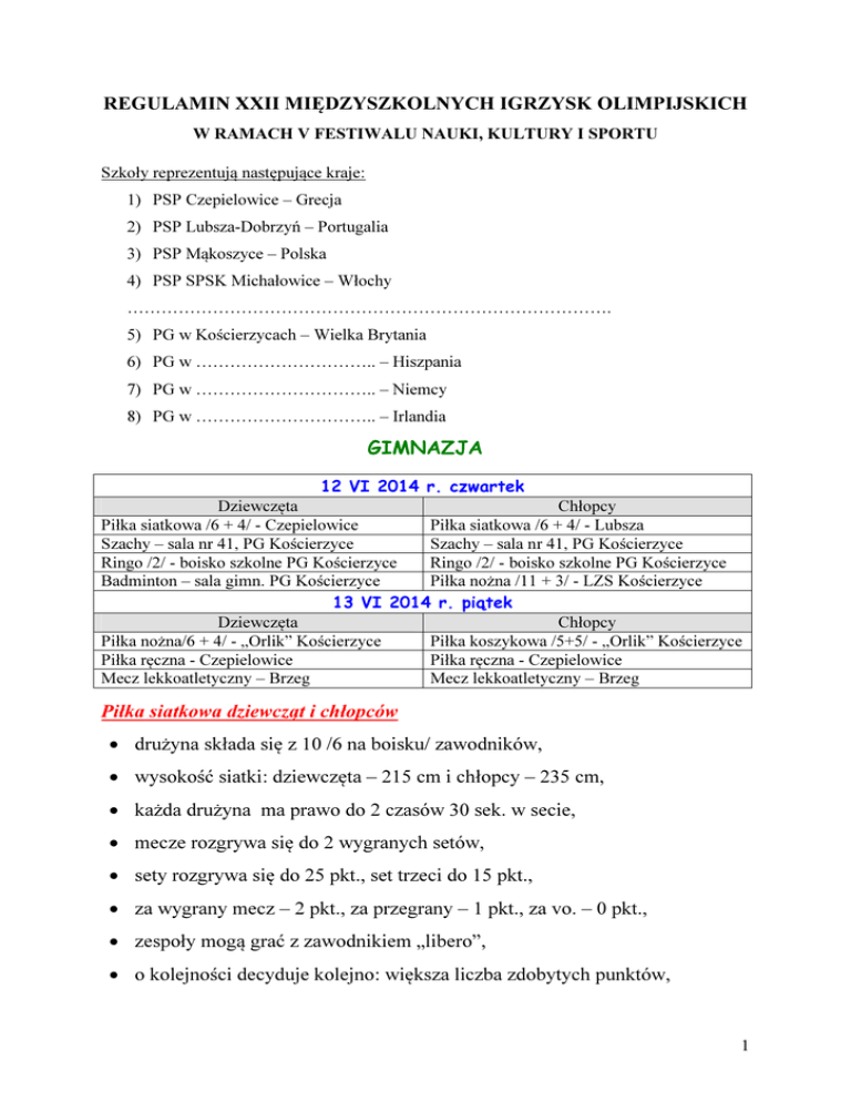 REGULAMI XXII MIĘDZYSZKOLYCH IGRZYSK OLIMPIJSKICH W RAMACH V FESTIWALU AUKI, KULTURY I SPORTU Szkoły reprezentują następujące kraje: 1) PSP Czepielowice – Grecja 2) PSP Lubsza-Dobrzyń – Portugalia 3) PSP Mąkoszyce – Polska 4) PSP SPSK Michałowice – Włochy …………………………………………………………………………. 5) PG w Kościerzycach – Wielka Brytania 6) PG w ………………………….. – Hiszpania 7) PG w ………………………….. – Niemcy 8) PG w ………………………….. – Irlandia GIMNAZJA 12 VI 2014 r. czwartek Dziewczęta Chłopcy Piłka siatkowa /6 + 4/ - Czepielowice Piłka siatkowa /6 + 4/ - Lubsza Szachy – sala nr 41, PG Kościerzyce Szachy – sala nr 41, PG Kościerzyce Ringo /2/ - boisko szkolne PG Kościerzyce Ringo /2/ - boisko szkolne PG Kościerzyce Badminton – sala gimn. PG Kościerzyce Piłka nożna /11 + 3/ - LZS Kościerzyce 13 VI 2014 r. piątek Dziewczęta Chłopcy Piłka nożna/6 + 4/ - „Orlik” Kościerzyce Piłka koszykowa /5+5/ - „Orlik” Kościerzyce Piłka ręczna - Czepielowice Piłka ręczna - Czepielowice Mecz lekkoatletyczny – Brzeg Mecz lekkoatletyczny – Brzeg Piłka siatkowa dziewcząt i chłopców • drużyna składa się z 10 /6 na boisku/ zawodników, • wysokość siatki: dziewczęta – 215 cm i chłopcy – 235 cm, • każda drużyna ma prawo do 2 czasów 30 sek. w secie, • mecze rozgrywa się do 2 wygranych setów, • sety rozgrywa się do 25 pkt., set trzeci do 15 pkt., • za wygrany mecz – 2 pkt., za przegrany – 1 pkt., za vo. – 0 pkt., • zespoły mogą grać z zawodnikiem „libero”, • o kolejności decyduje kolejno: większa liczba zdobytych punktów, 1 • jeżeli dwa lub więcej zespołów uzyska tę samą liczbę punktów o kolejności decydują: bezpośrednie mecze, lepszy stosunek setów, większa liczba zdobytych setów, lepszy stosunek małych punktów. Piłka ręczna dziewcząt i chłopców • drużyna składa się z 14 /7 na boisku/ zawodników, • czas gry 2x15 minut, • mecze „każdy z każdym”, • zawody rozgrywane zgodnie z przepisami ZPRP, Pozostałe zasady zgodne z regulaminem Wojewódzkich Igrzysk Młodzieży Szkolnej 2010/2011 /str. 67 – sposób przeprowadzenia zawodów, punktacja/. Mini piłka nożna dziewcząt W skład drużyny wchodzi 10 zawodniczek. W zawodach biorą udział 6 osobowe zespoły /5 zawodniczek w polu + bramkarz/ oraz 4 zawodniczki rezerwowe /w tym bramkarz/. Czas gry 2x15 minut, przerwa 5 minut. Boisko „Orlik”. Piłka nr 5. Pozostałe zasady zgodne z regulaminem Wojewódzkich Igrzysk Młodzieży Szkolnej 2010/2011 /str. 47 – sposób przeprowadzenia zawodów, punktacja/. Piłka nożna chłopców W skład drużyny wchodzi 14 zawodników. W zawodach biorą udział 11 osobowe zespoły /10 zawodników w polu + bramkarz/ oraz 3 zawodników rezerwowych /w tym bramkarz/. Czas gry 2x25 minut, przerwa 5 minut. Boisko „LZS Kościerzyce”. Piłka nr 5. Ringo /dziewczęta/ Drużynę tworzą dwie zawodniczki. Mecze każdy z każdym. Regulamin w załączeniu. Ringo /chłopcy/ Drużynę tworzy 2 zawodników. Mecze każdy z każdym. Regulamin w załączeniu. 2 Badminton /dziewczęta/ Drużyna wystawia 2 zawodniczki do turnieju. Turniej ma charakter zawodów indywidualnych, ale zawodnik punktuje także dla drużyny olimpijskiej. Mecze każdy z każdym. Regulamin w załączeniu. Szachy /dziewczęta i chłopcy/ Drużyna wystawia 2 zawodników do turnieju. Turniej ma charakter zawodów indywidualnych, ale zawodnik punktuje także dla drużyny olimpijskiej. Mecze każdy z każdym. Regulamin w załączeniu. Mecz lekkoatletyczny a) dziewczęta + chłopcy Konkurencje: 100m; 300m; 600m; 1 000m; skok w dal; pchnięcie kulą /4 kg, 5 kg/; rzut oszczepem; sztafeta 4 x 100m. Drużynę tworzy 5 dziewcząt i 5 chłopców. Dziewczęta i chłopcy startują oddzielnie, ale punktują dla drużyny. Drużyna wystawia do każdej konkurencji biegowej i technicznej 2 zawodników /1 dziewczyna, 1 chłopiec/. Jeden zawodnik może wziąć udział w 2 konkurencjach + sztafeta. Jeżeli drużyna nie wystawiła żadnego zawodnika w danej konkurencji, wówczas otrzymuje nie 1, a 0 punktów. W meczu lekkoatletycznym zwycięża ta drużyna, która ma mniejszą sumę punktów zdobytych w poszczególnych konkurencjach. W przypadku równej sumy punktów – wyższe miejsce ma ta drużyna, która ma więcej miejsc 1-szych, potem 2-gich itd. w konkurencjach rozgrywanych podczas meczu LA. W ramach igrzysk będzie prowadzona klasyfikacja punktowa – zarówno dla dyscyplin drużynowych jak i indywidualnych. Zasady klasyfikacji punktowej 1) Każda reprezentacja jest punktowana w każdej konkurencji wg. Zasady: 3 I miejsce: 5 – pkt; II m – 3 pkt. pkt; III m – 2 pkt. IV m – 1 pkt. 2) W przypadku miejsc równoległych drużyny otrzymują średnią punktów z zajętych miejsc. 3) Wykaz konkurencji, w których turniej bezpośrednio ustali kolejność drużyn: Chłopcy Piłka nożna Piłka siatkowa Piłka ręczna Piłka koszykowa Ringo Dziewczęta Piłka nożna Piłka siatkowa Piłka ręczna Ringo Mecz lekkoatletyczny 4) W dyscyplinach: I. II. badminton szachy dz. dz, chł. O miejscu i punktach dla drużyny decyduje suma miejsc 2 zawodników z drużyny. Brak zawodnika – 9 miejsce. Mniejsza suma miejsc – wyższe miejsce drużyny. W przypadku równych sum wyższe miejsce ma ta drużyna, której najlepszy zawodnik ma wyższe miejsce. 5) W przypadku równej ilości punktów w punktacji ogólnej - wyższe miejsce ma ta drużyna, która ma więcej miejsc 1, potem 2, itd. Autor regulaminu: mgr Roman Czechowski 4 REGULAMI XXII MIĘDZYSZKOLYCH IGRZYSK OLIMPIJSKICH W RAMACH V FESTIWALU AUKI, KULTURY I SPORTU Szkoły reprezentują następujące kraje: 1) PSP Czepielowice – Grecja 2) PSP Lubsza-Dobrzyń – Portugalia 3) PSP Mąkoszyce – Polska 4) PSP SPSK Michałowice – Włochy ………………………………………………………