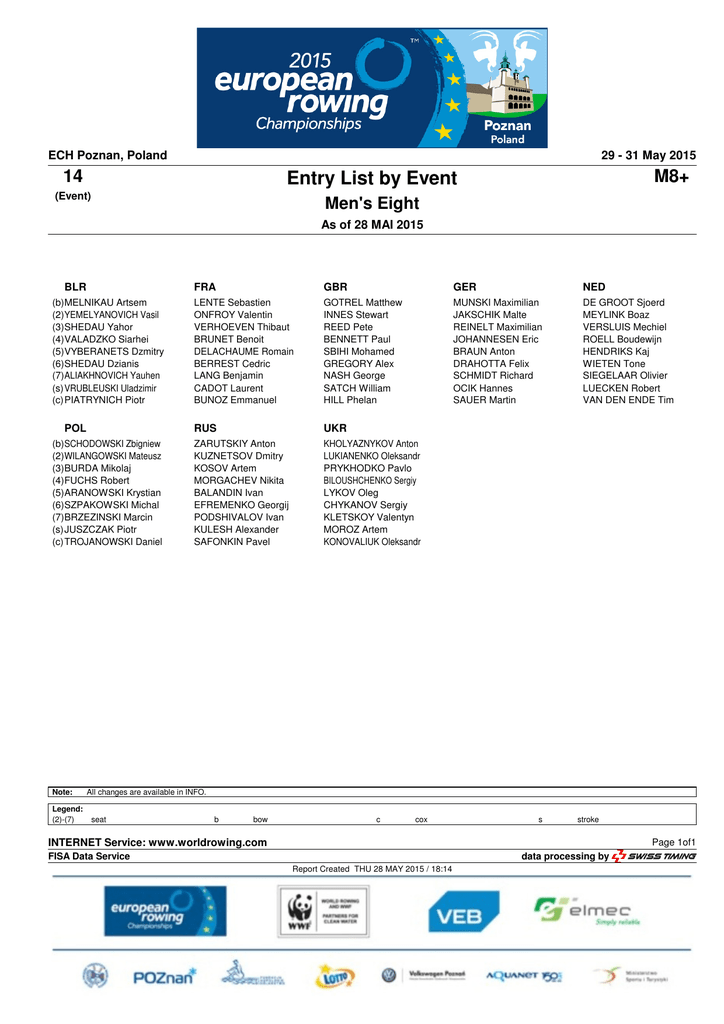 ECH Poznan, Poland 29 - 31 May 2015 14 Entry List by Event (Event) Men's Eight M8+ As of 28 MAI 2015 BLR (b)MELNIKAU Artsem (2)YEMELYANOVICH Vasil (3)SHEDAU Yahor (4)VALADZKO Siarhei (5)VYBERANETS Dzmitry (6)SHEDAU Dzianis (7)ALIAKHNOVICH Yauhen (s) VRUBLEUSKI Uladzimir (c) PIATRYNICH Piotr POL (b)SCHODOWSKI Zbigniew (2)WILANGOWSKI Mateusz (3)BURDA Mikolaj (4)FUCHS Robert (5)ARANOWSKI Krystian (6)SZPAKOWSKI Michal (7)BRZEZINSKI Marcin (s) JUSZCZAK Piotr (c) TROJANOWSKI Daniel Note: Legend: (2)-(7) FRA GBR GER NED LENTE Sebastien ONFROY Valentin VERHOEVEN Thibaut BRUNET Benoit DELACHAUME Romain BERREST Cedric LANG Benjamin CADOT Laurent BUNOZ Emmanuel GOTREL Matthew INNES Stewart REED Pete BENNETT Paul SBIHI Mohamed GREGORY Alex NASH George SATCH William HILL Phelan MUNSKI Maximilian JAKSCHIK Malte REINELT Maximilian JOHANNESEN Eric BRAUN Anton DRAHOTTA Felix SCHMIDT Richard OCIK Hannes SAUER Martin DE GROOT Sjoerd MEYLINK Boaz VERSLUIS Mechiel ROELL Boudewijn HENDRIKS Kaj WIETEN Tone SIEGELAAR Olivier LUECKEN Robert VAN DEN ENDE Tim RUS UKR ZARUTSKIY Anton KUZNETSOV Dmitry KOSOV Artem MORGACHEV Nikita BALANDIN Ivan EFREMENKO Georgij PODSHIVALOV Ivan KULESH Alexander SAFONKIN Pavel KHOLYAZNYKOV Anton LUKIANENKO Oleksandr PRYKHODKO Pavlo BILOUSHCHENKO Sergiy LYKOV Oleg CHYKANOV Sergiy KLETSKOY Valentyn MOROZ Artem KONOVALIUK Oleksandr All changes are available in INFO. seat b bow c cox s stroke INTERNET Service: www.worldrowing.com Page 1of1 FISA Data Service data processing by Report Created THU 28 MAY 2015 / 18:14